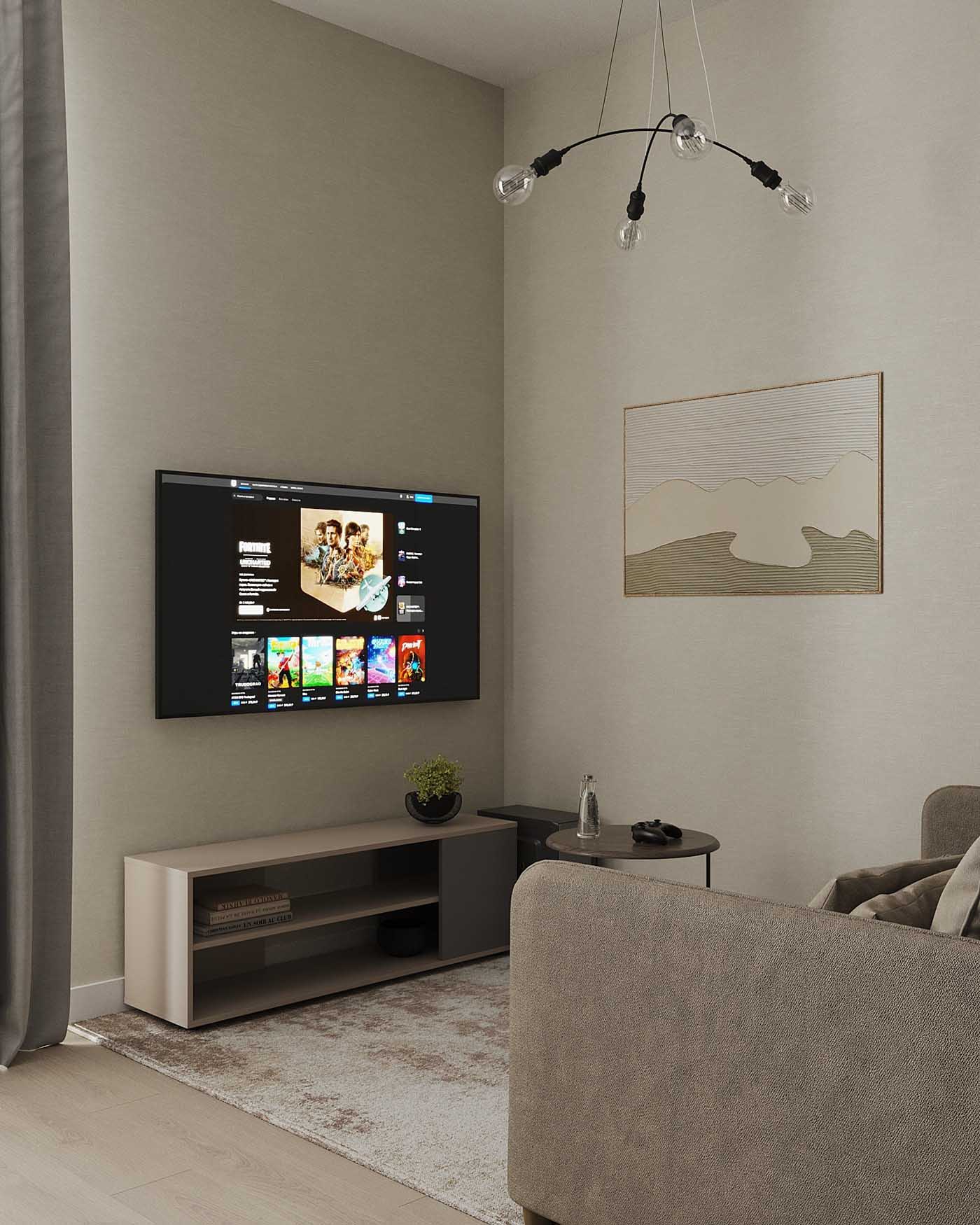 A nappali zóna nyugodt árnyalatokkal lett kialakítva, és az ide választott TV-szekrény illett a projekt általános stíluskoncepciójába. A szekrény egyes polcai nyitottak, ami lehetővé teszi a szükséges eszközök elhelyezését anélkül, hogy a kábelek számára külön átvezetést kellene fúrni. A legfontosabb az volt, hogy a konnektorokat előre a megfelelő magasságba helyezzék, amire a tervező különös figyelmet fordított az elektromos tervrajzon.