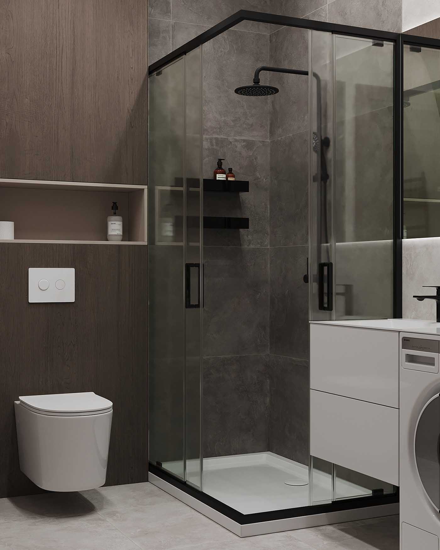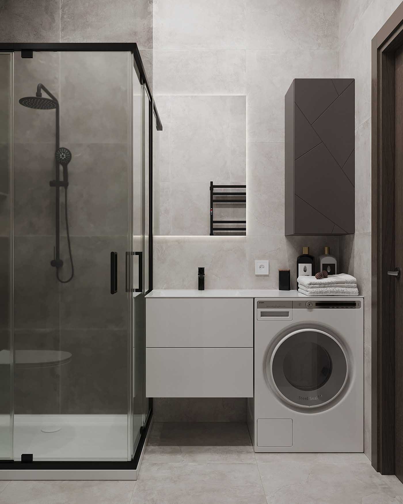 A fekete törölközőszárító és a fekete szaniterek lehetővé teszik, hogy a szürke színek érdekesebben “játsszanak”. A mosógép fölé egy grafit színű fali szekrény került. Ez kompakt és nem zsúfolja tele a kis helyiséget. Itt egy másik érdekes megoldást is alkalmaztak: a szekrény egy vonalban van a tükörrel és a zuhanyfallal, ami vizuálisan egyensúlyba hozza az összes tárgyat, és az enteriőr befejezettebbnek tűnik.