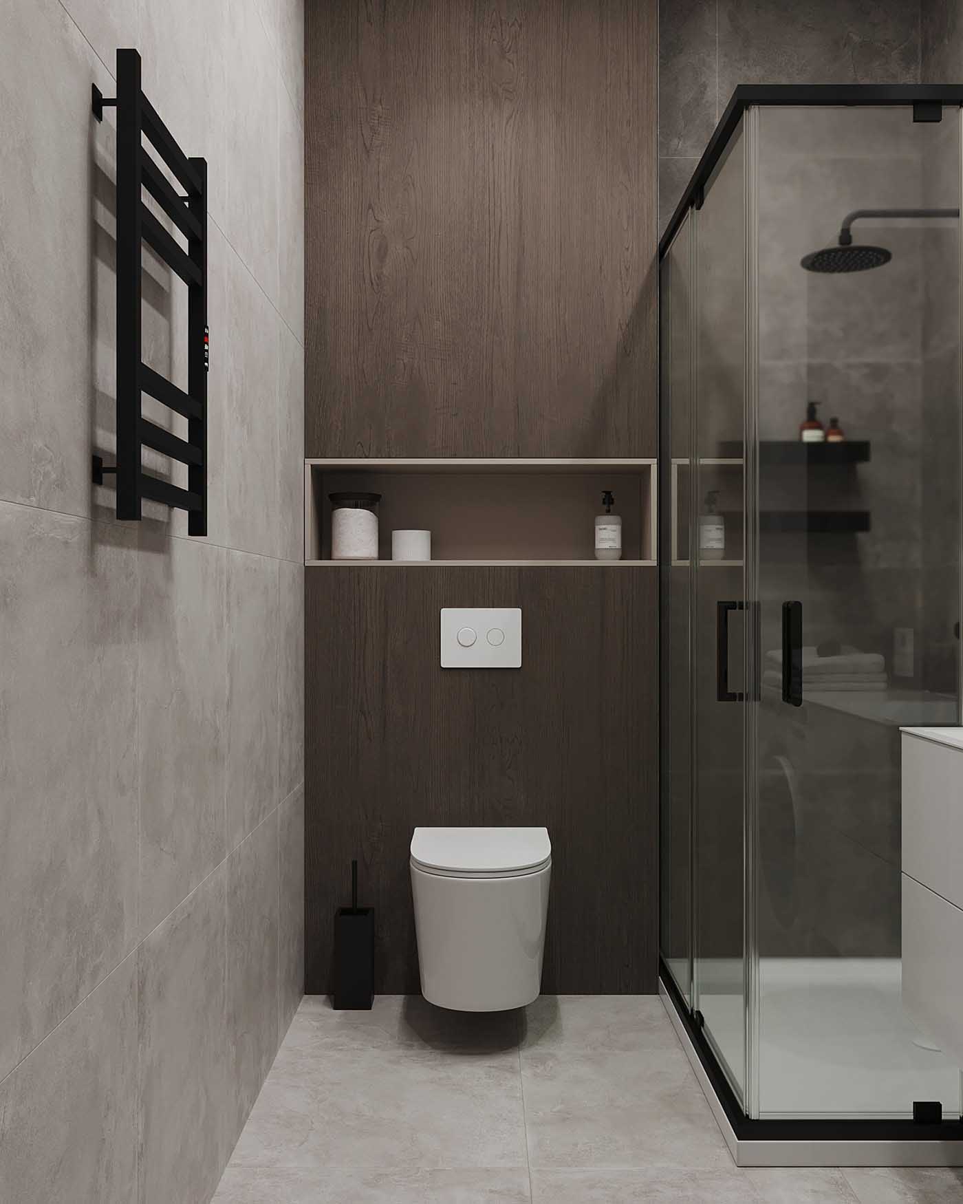 A fürdőszoba szintén monokróm árnyalatokban lett kialakítva, fa elemekkel kiegészítve. A zuhanyzó területét sötétszürke, nagy formátumú greslapokkal, míg a többi zónát világosszürkével burkolták.
