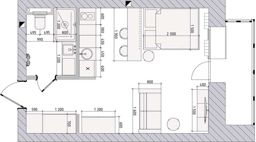 A bárpult munkalapjától a mennyezetig futó lécek tökéletesen elválasztják a konyhát és a hálót. Egy keresztirányú léc “megfogja” az esetleges morzsákat, és megakadályozza, hogy azok az ágyra hulljanak. A lécek a takarítást is megkönnyítik, ami egy fiatal lakó számára különösen fontos. A bárpult nemcsak asztalként funkcionál, hanem fontos funkcionális szerepet is betölt: a konyha felőli oldalán polcok rejtőznek benne.