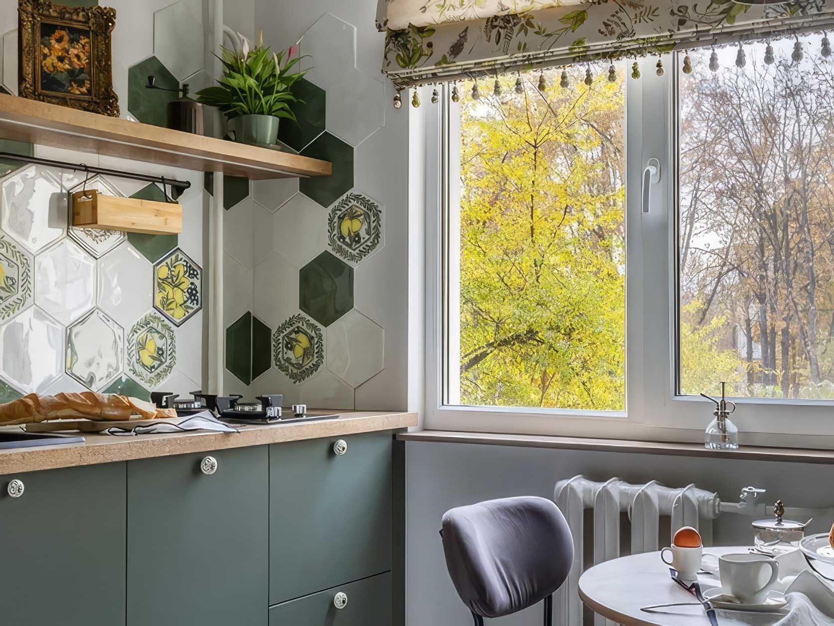 A konyha kialakítása a “kevesebb több” elvét követi. Mivel a tulajdonos ritkán főz, a bútor rendkívül kompakt: az alsó szekrények rejtik a beépített mosogatógépet és a tárolófiókokat, míg a magas elembe egy kisméretű hűtőszekrényt, fölé pedig egy mikrohullámú sütővel kombinált sütőt integráltak. A helyiség igazi ékköve a hatszögletű, citrommintás csempékből kirakott falburkolat, amely a fehér és zöld elemekkel friss, mediterrán hangulatot áraszt. A gyors reggelikhez egy kisebb asztal áll rendelkezésre, amely fölé – a tér vizuális tágítása érdekében – egy osztott üvegezésű, íves tükör került, ablak illúzióját keltve. A világításról az étkezőasztal felett két szürke üvegbúrás függeszték, a munkapultnál pedig a polc alá rejtett LED-szalag gondoskodik.