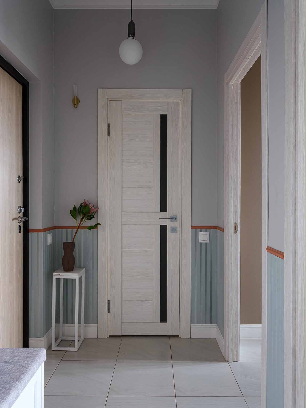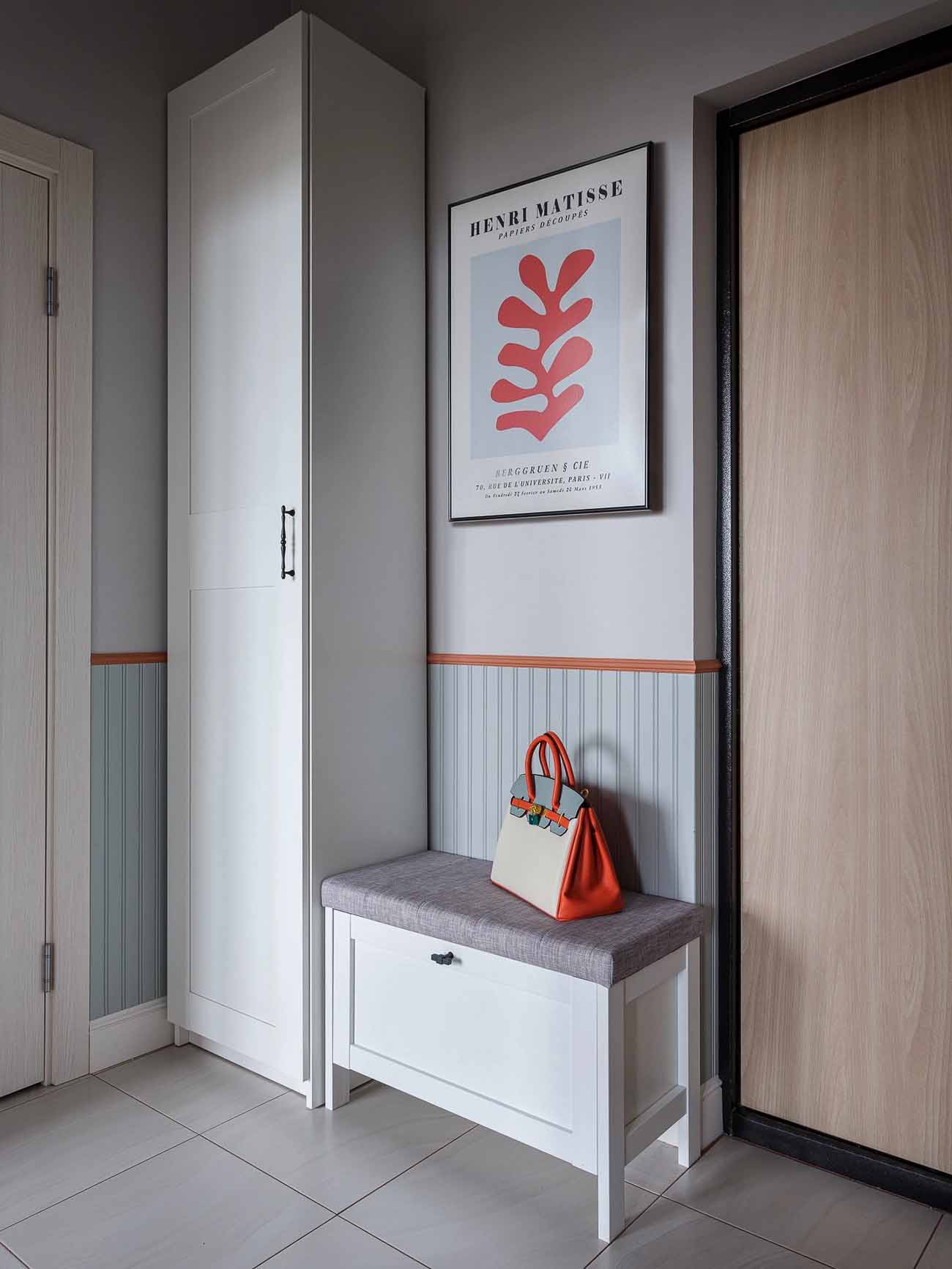Az előszoba hangulatát a falak mentén végigfutó, élénk korall árnyalatú díszléc határozza meg, amely izgalmas kontrasztot alkot a lágy babakék falfelületekkel. A tervező itt alkalmazott először egy igen praktikus trükköt: a lambériát imitáló dekorpanelek mögé rejtették el az utólagosan kialakított elektromos kiállásokat, így elkerülhető volt a falak vésése. A tárolásról egy diszkrét szekrény és egy kényelmes, cipőtárolóval kombinált pad gondoskodik. Az egyedi részleteket fokozza, hogy a padlóburkolat fugáit is korallszínűre cserélték.