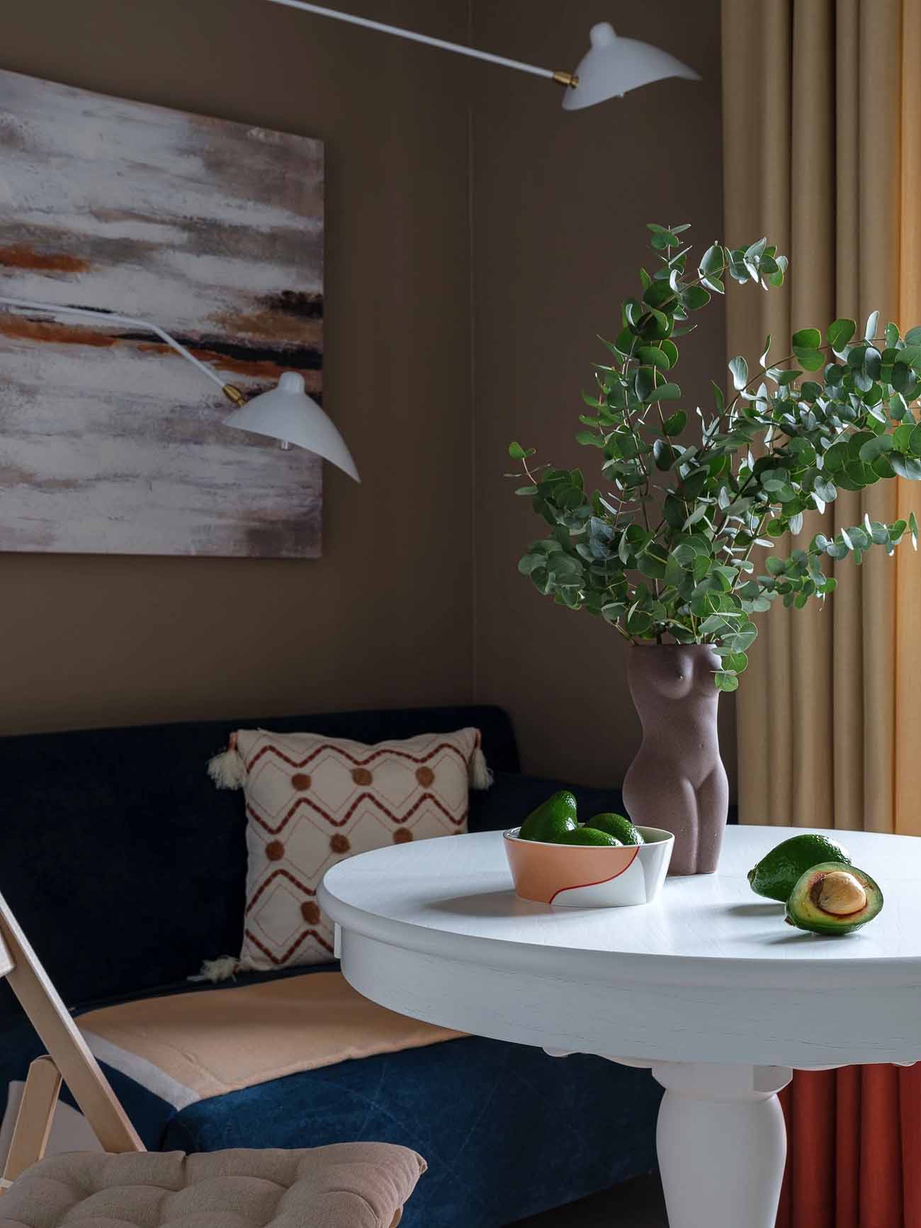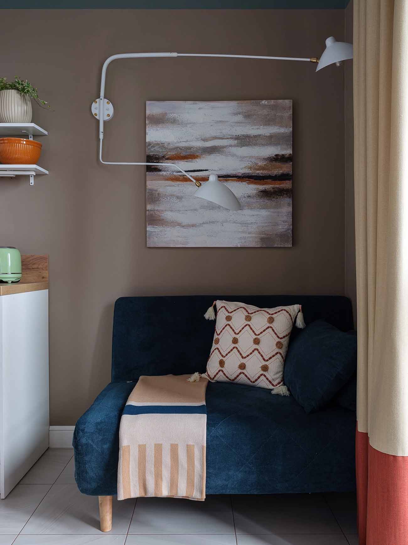 A pihenőzónában egy mélykék bársonykanapé kapott helyet, amely fölött egy absztrakt pannó gyűjti össze a helyiség összes színét. Az étkezőt egy kerek asztal és összecsukható székek alkotják; utóbbiak praktikusak, hiszen könnyen elpakolhatók, szabaddá téve az utat az erkély felé. A világítás terén egy látványos, nagy kinyúlású karos fali lámpa a meghatározó az étkezőasztal fölött, kiváltva a hagyományos mennyezeti lámpát.