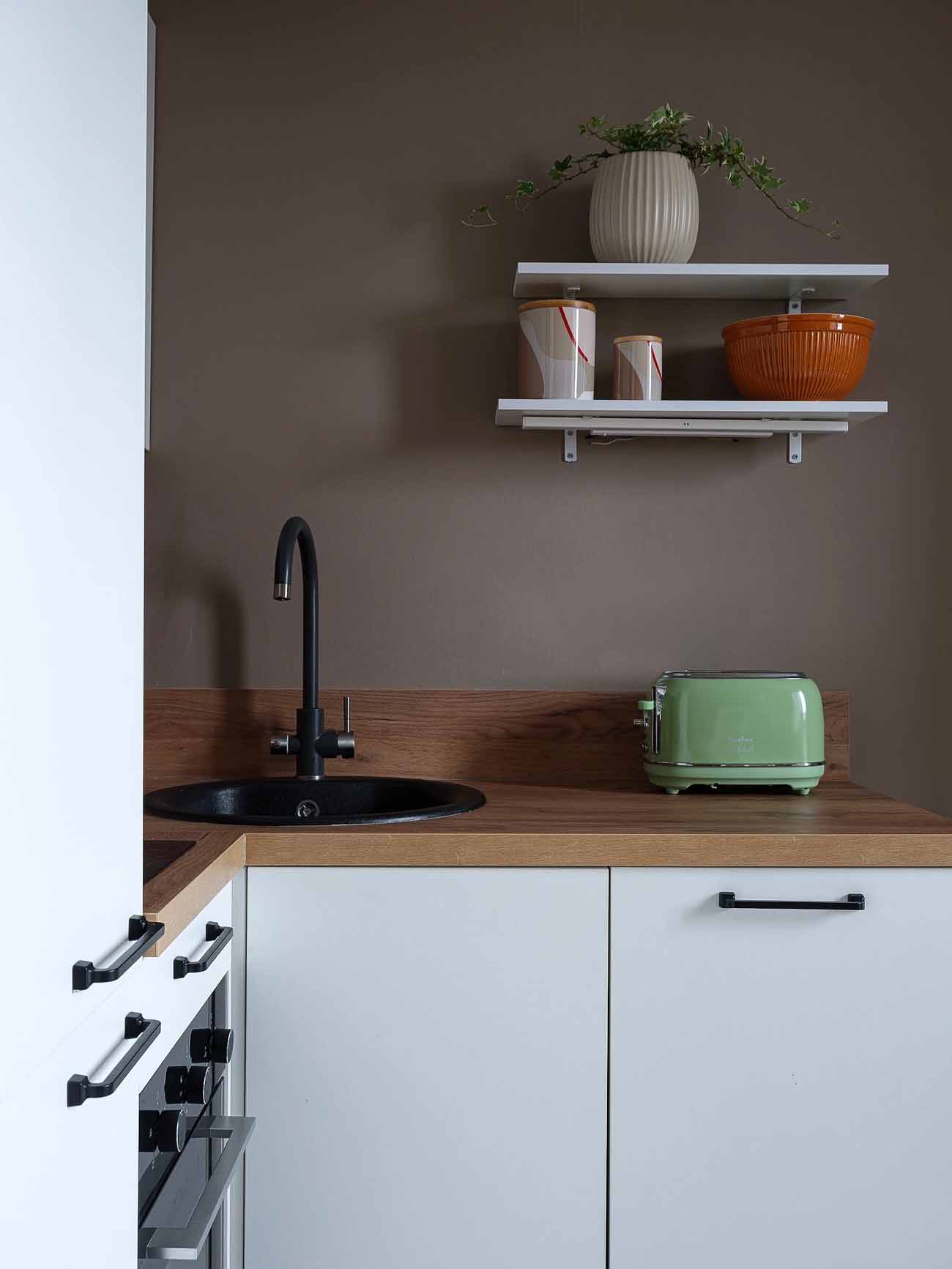 A konyha-nappali térben egy meleg barnás árnyalat dominál, amelyet egy karakteres kékeszöld díszcsík választ el a mennyezettől, vizuálisan tagolva a belmagasságot. A konyhabútor rendkívül kompakt, mégis minden szükséges eszközt – hűtőt, mosogatógépet és sütőt – magában foglal. A felső szekrények csak az egyik oldalon jelennek meg, ami szellősebbé teszi az összképet.