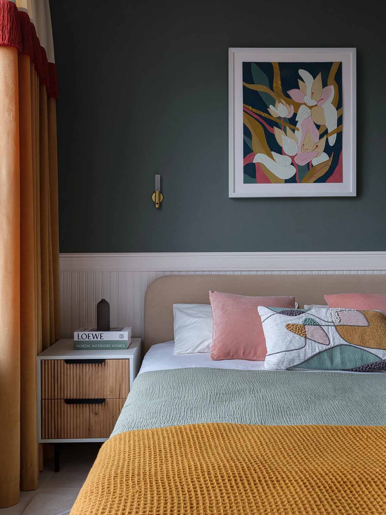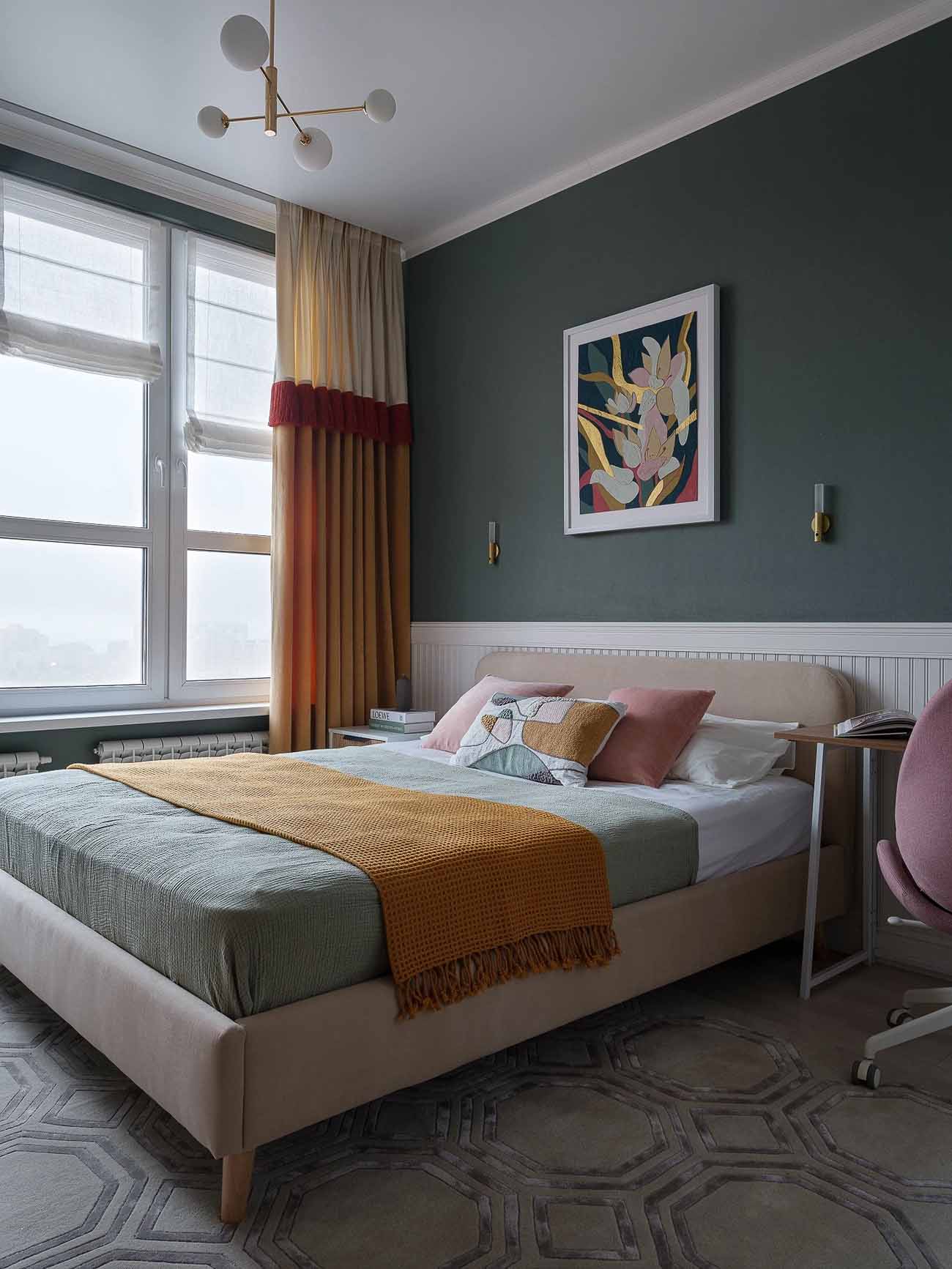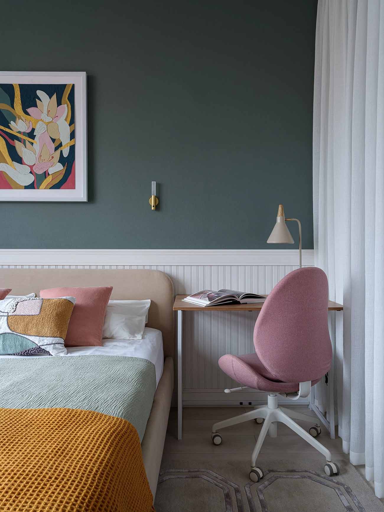 A hálóban a mélyzöld falak és a mustársárga kiegészítők teremtenek kuckózós hangulatot. Itt a tervező két különböző profilú díszléc kombinálásával hozott létre egyedi, lambériára emlékeztető panelt, ami prémium érzetet kölcsönöz a helyiségnek. Mivel a gardrób leválasztása miatt a mennyezet módosítására is szükség volt, a tervező több fényforrást telepített: a gardrób saját beépített világítást kapott, a központi csillár pedig pontosan a háló zóna középpontjába került. A berendezést egy neves skandináv gyártótól származó, korábban vásárolt fa komód és egy dolgozósarokként funkcionáló íróasztal egészíti ki.