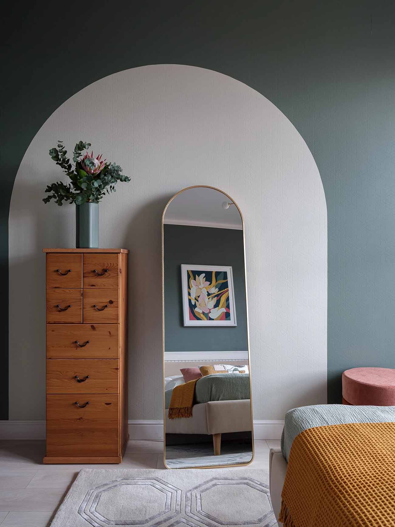 Az ággyal szemben lévő falat egy festett ív díszíti, amely a tükör és a komód háttereként szolgál.