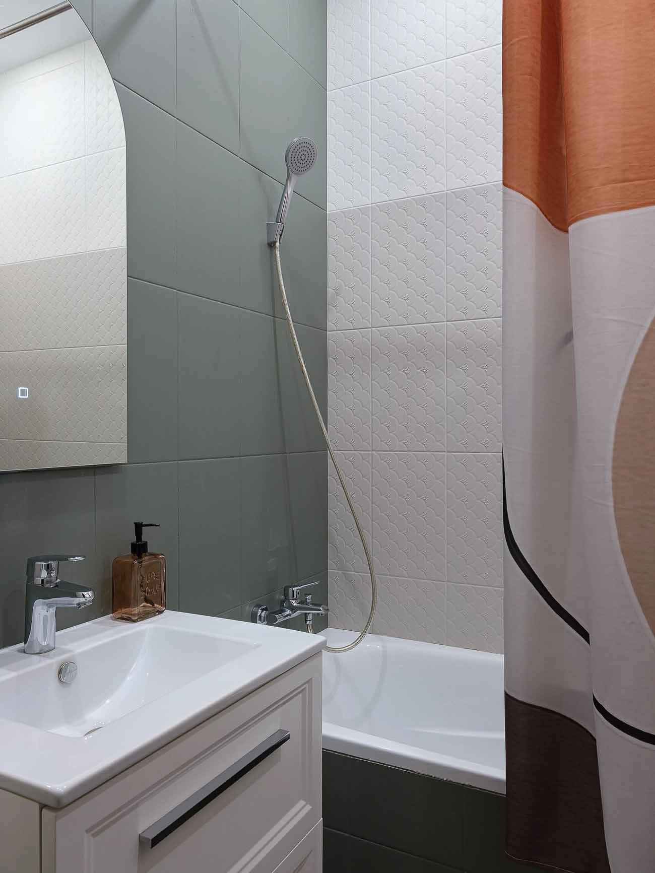 A vizesblokkok esetében a tervező bebizonyította, hogy a régi csempe is újjászülethet: speciális, nagy kopásállóságú festékkel varázsolta újjá a felületeket. A mellékhelyiség a lakás legbátrabb pontja: narancs, kék és fehér színek találkoznak itt, az i-re a pontot pedig a tárolószekrény mélykék ajtói teszik fel.