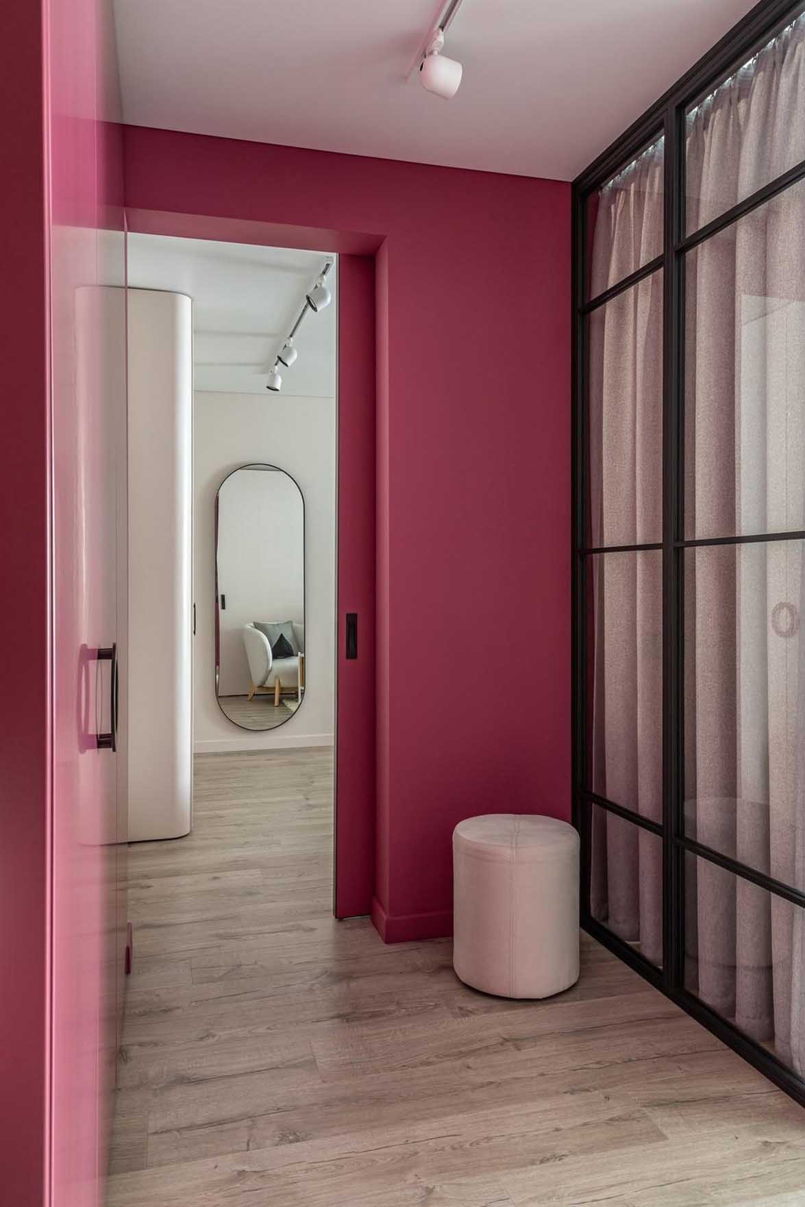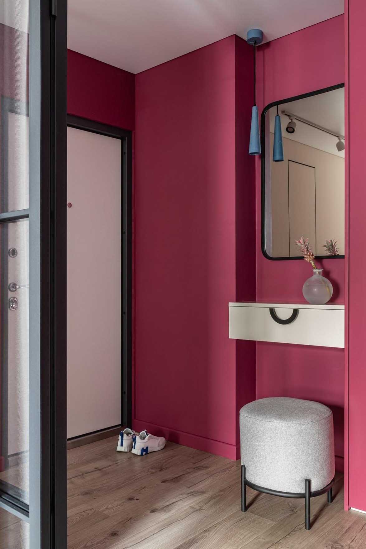 Az enteriőr egyik legmeghatározóbb eleme a bátor és tudatos színválasztás. A tervező javaslatára a közlekedő zónák – az előszoba és a folyosó – egy merész, mély piros bogyós árnyalatot kaptak. Mivel ezekben a helyiségekben jellemzően kevesebb időt tölt az ember, az élénk színek nem válnak nyomasztóvá vagy fárasztóvá a szem számára, viszont karaktert és egyedi hangulatot kölcsönöznek a lakásnak.