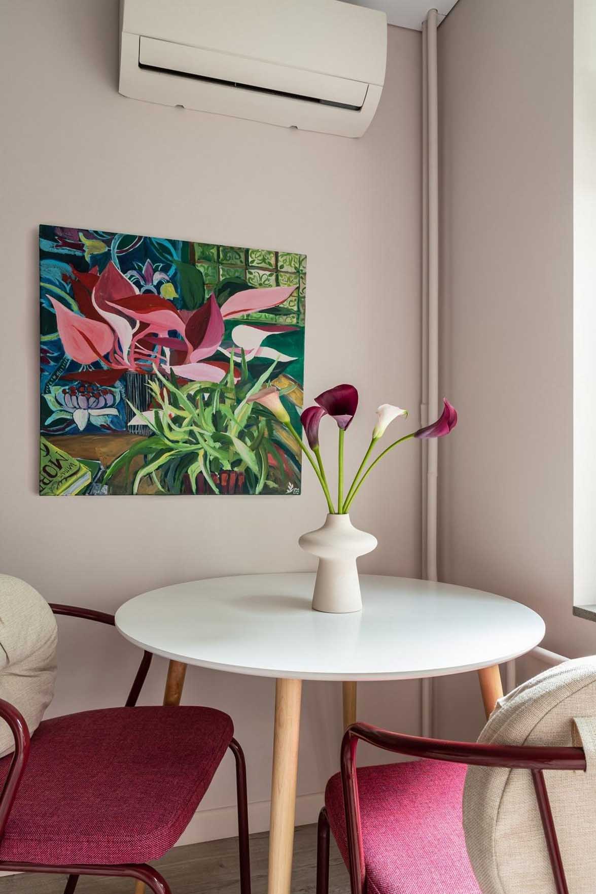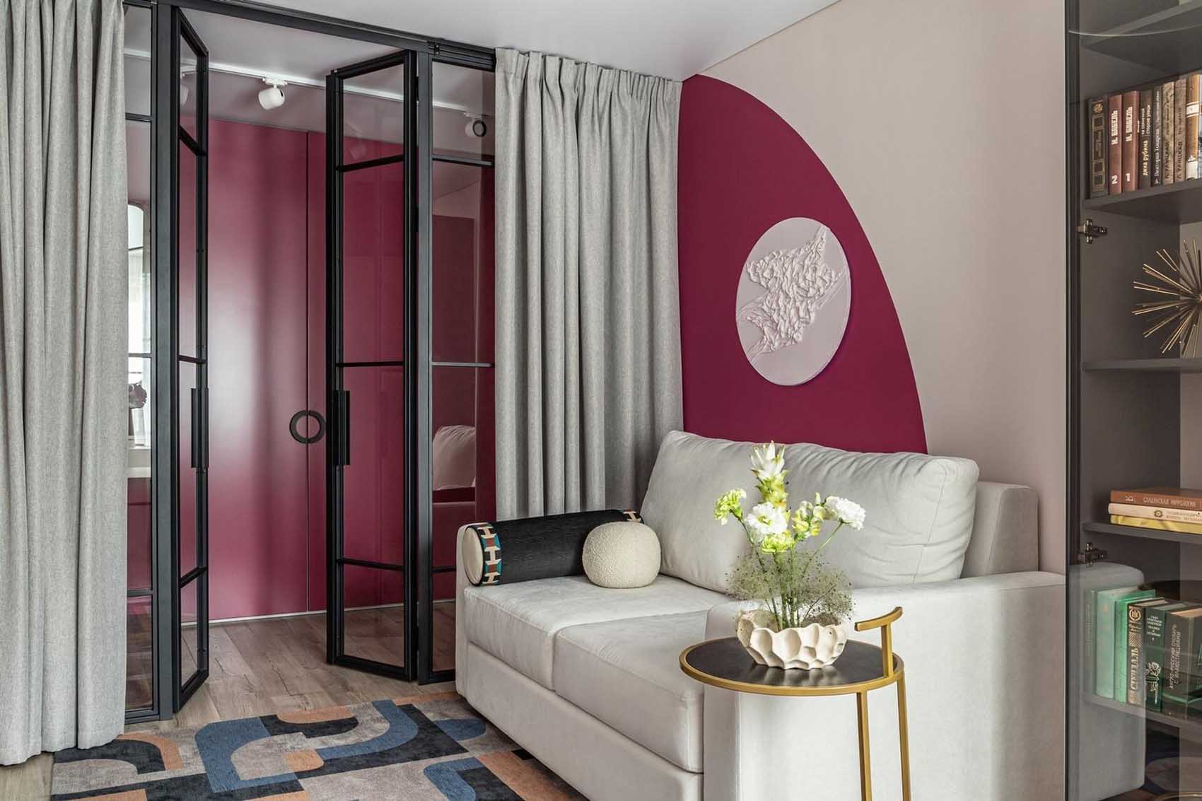 A kisebbik szoba, amely az üvegfallal elegánsan csatlakozik a folyosóhoz, egy igazi multifunkciós térként – dolgozó- és vendégszobaként is – üzemel. Az előszoba karakteres bogyószíne itt is visszaköszön egy merész, félkör alakú dekorációs festés formájában a kanapé mögötti falszakaszon.
