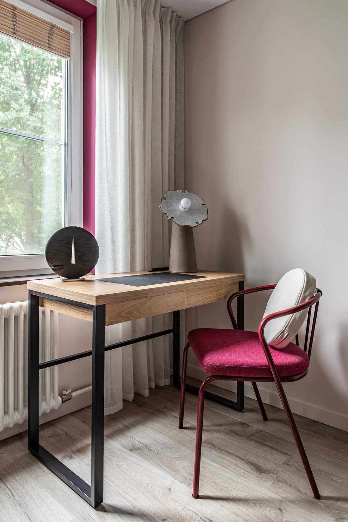 A privát szféra biztosítására – akár munka közben, akár vendégek érkezésekor – sűrű szövésű, a tér intimitását védő függönyök szolgálnak. A tárolást egy üvegajtós könyvespolc és dekorációs szekrény látja el, a hatékony munkavégzést pedig az ablak elé helyezett, természetes fénynél lévő íróasztal segíti. A központi mennyezeti lámpa mellett egy karakteres, kinyíló virágot formázó asztali lámpa ad hangulatvilágítást. Az ablakpárkány ebben a helyiségben egyedi, barna árnyalatú mikrocement bevonatot kapott.