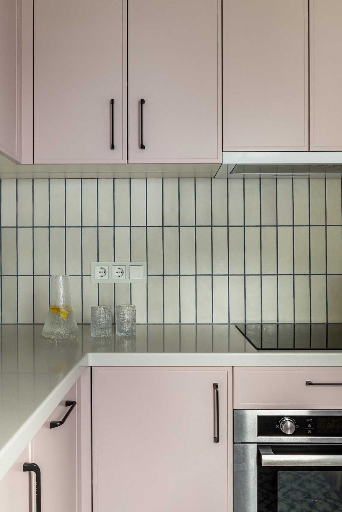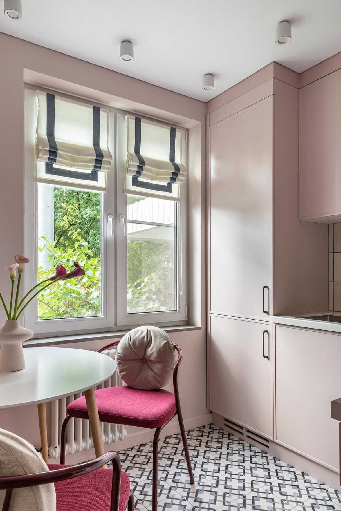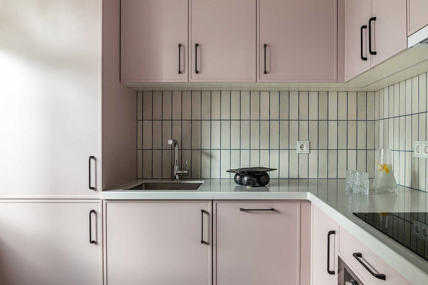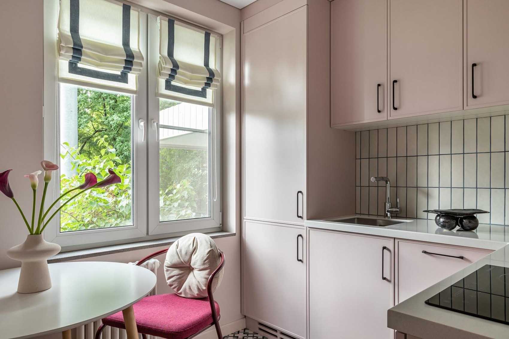 A konyhában szintén megjelenik a szín, de már egy sokkal lágyabb, pasztellesebb formában: a falak és a sarokelrendezésű konyhabútor frontjai egy finom, púderes rózsaszín árnyalatot kaptak. Ez a monokróm megoldás, ahol a bútor szinte beleolvad a falba, rendkívül egységes és tágas hatást kelt a szűkös térben.