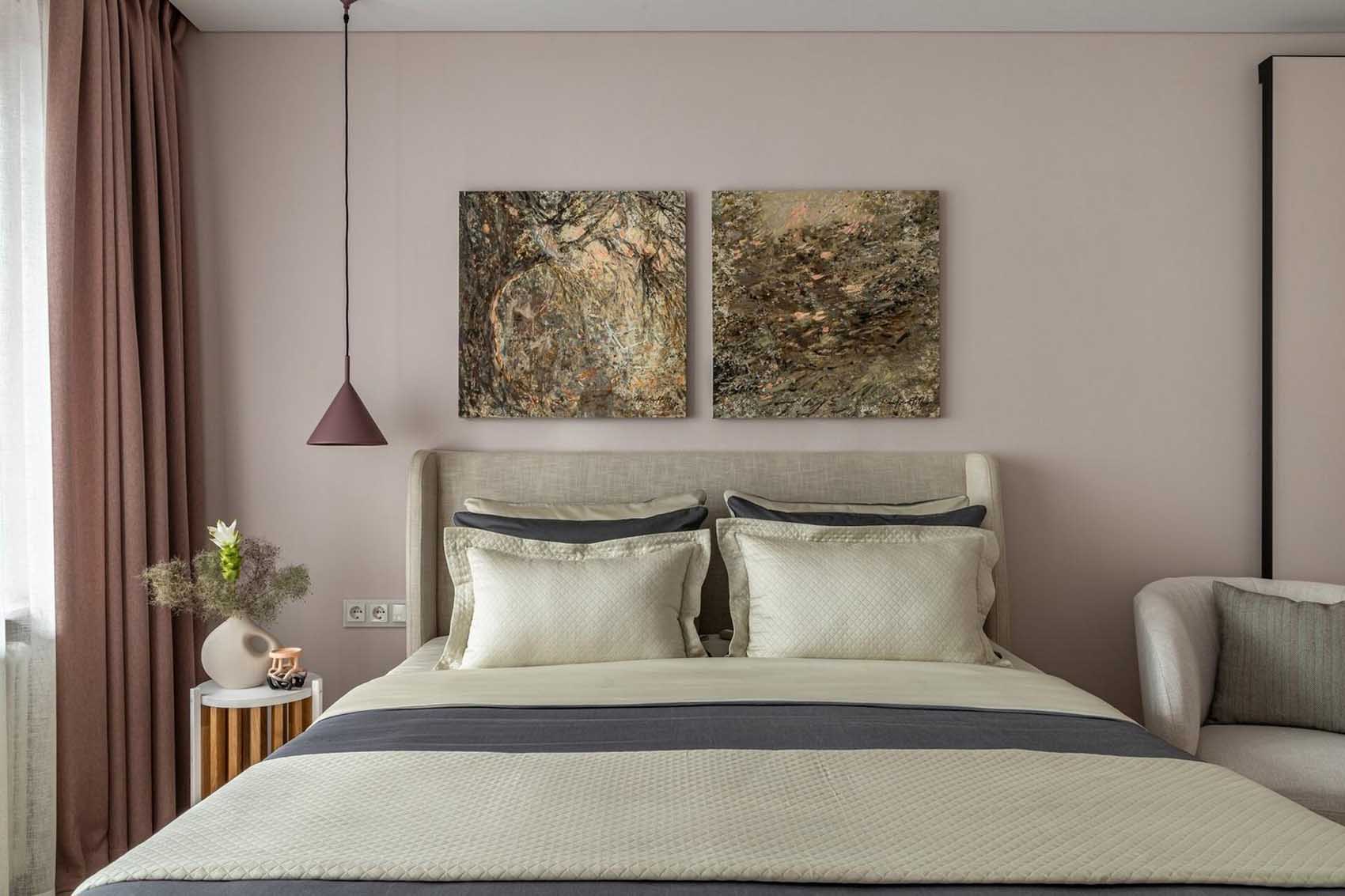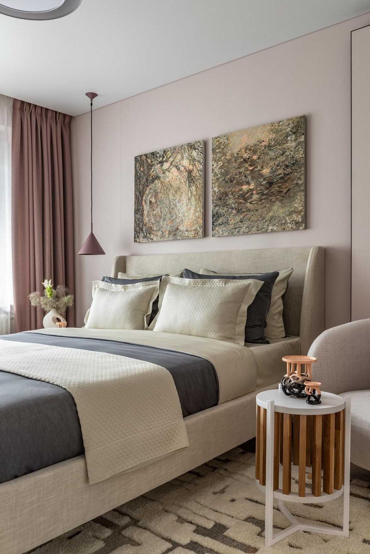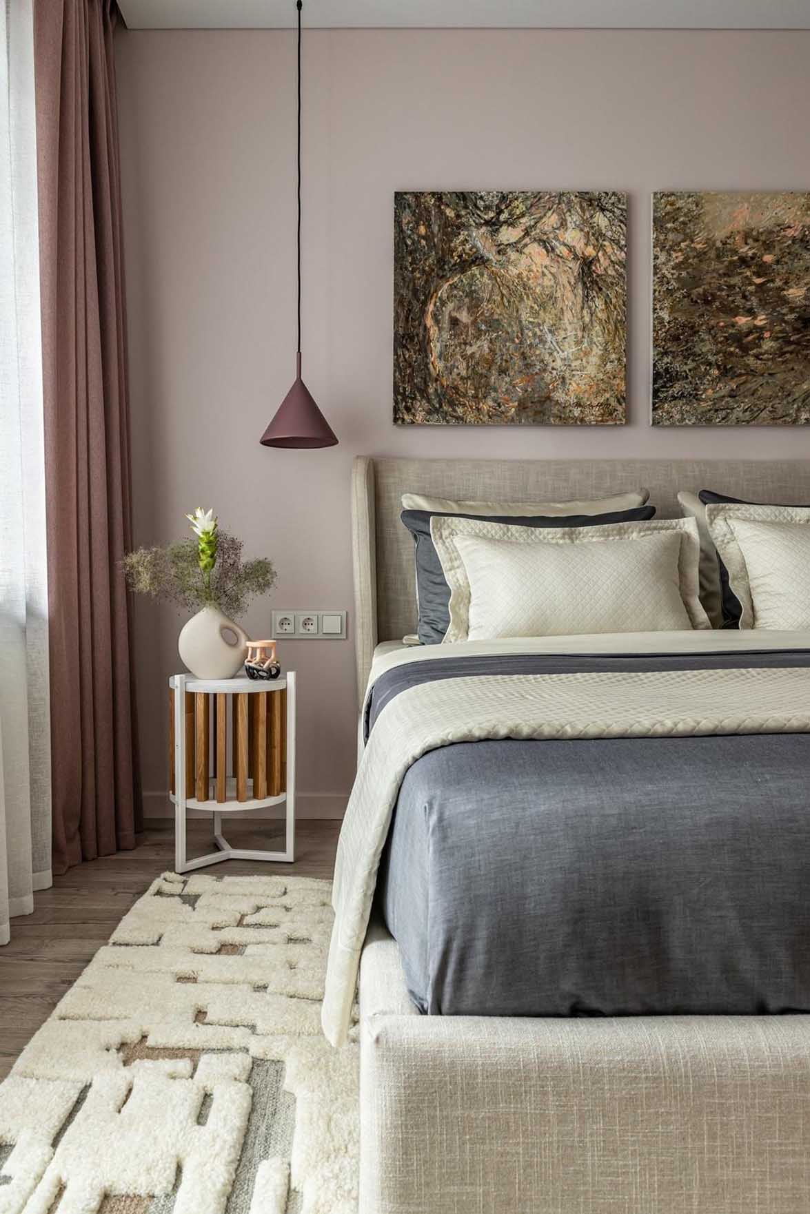 Az erkélykapcsolatos, tágasabb helyiség maradt a hálószoba, amelynek alaphangulatát a nyugodt hangulatot teremtő, világos, pihentető színek adják meg. A korábbi, terjedelmes, sötét tónusú, szabadon álló szekrényeket itt is egy falba olvadó, a fal színével megegyező árnyalatú, teljes magasságú beépített gardróbszekrény váltotta fel. Ez a megoldás nemcsak levegősebbé és tágasabbá teszi a teret, de óriási tárolókapacitást is biztosít.