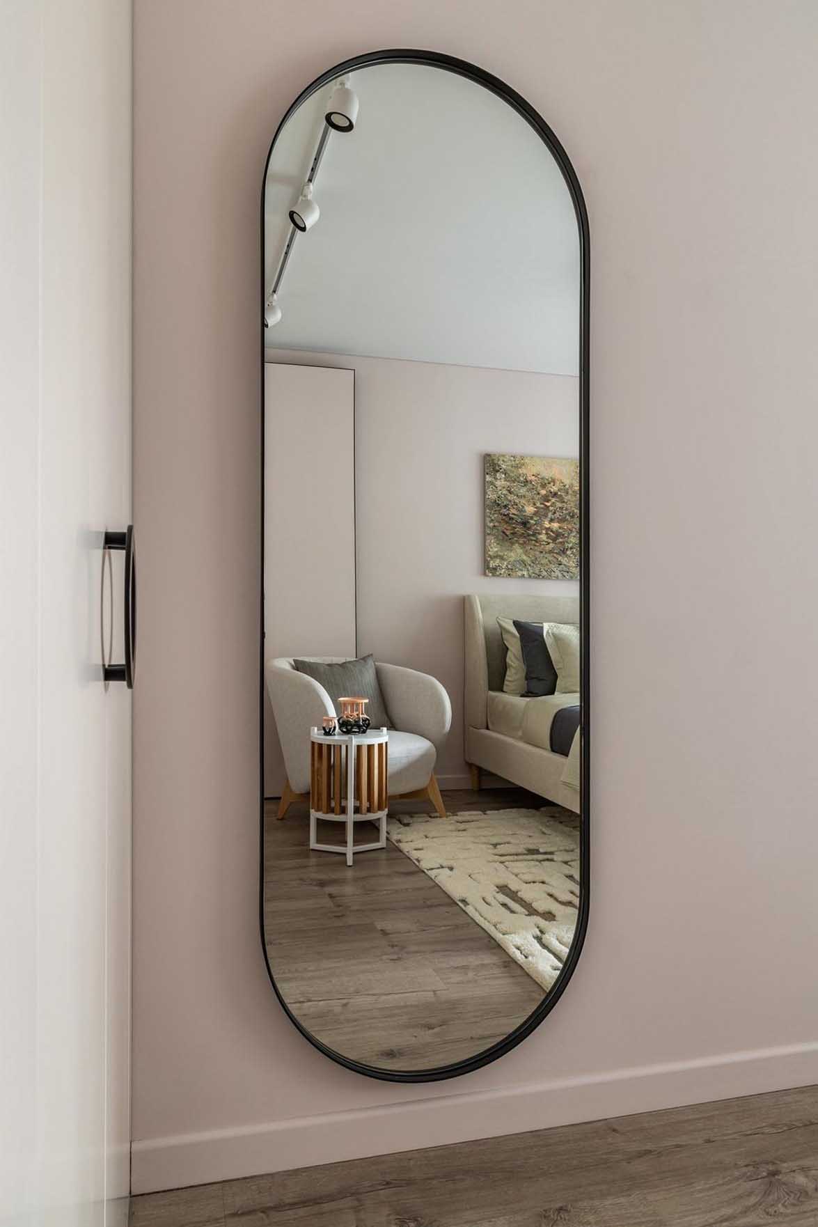 A tárolásról egy, a fal színére festett, keskeny beépített szekrény gondoskodik. A szekrény csökkentett mélysége biztosítja a kényelmes átjárást, a ruhákat pedig egy speciális, a falra merőleges akasztási rendszernek köszönhetően lehet praktikusan elhelyezni. A világítást modern sínlámpák és a tükör melletti, egyedi tervezésű függeszték biztosítja.