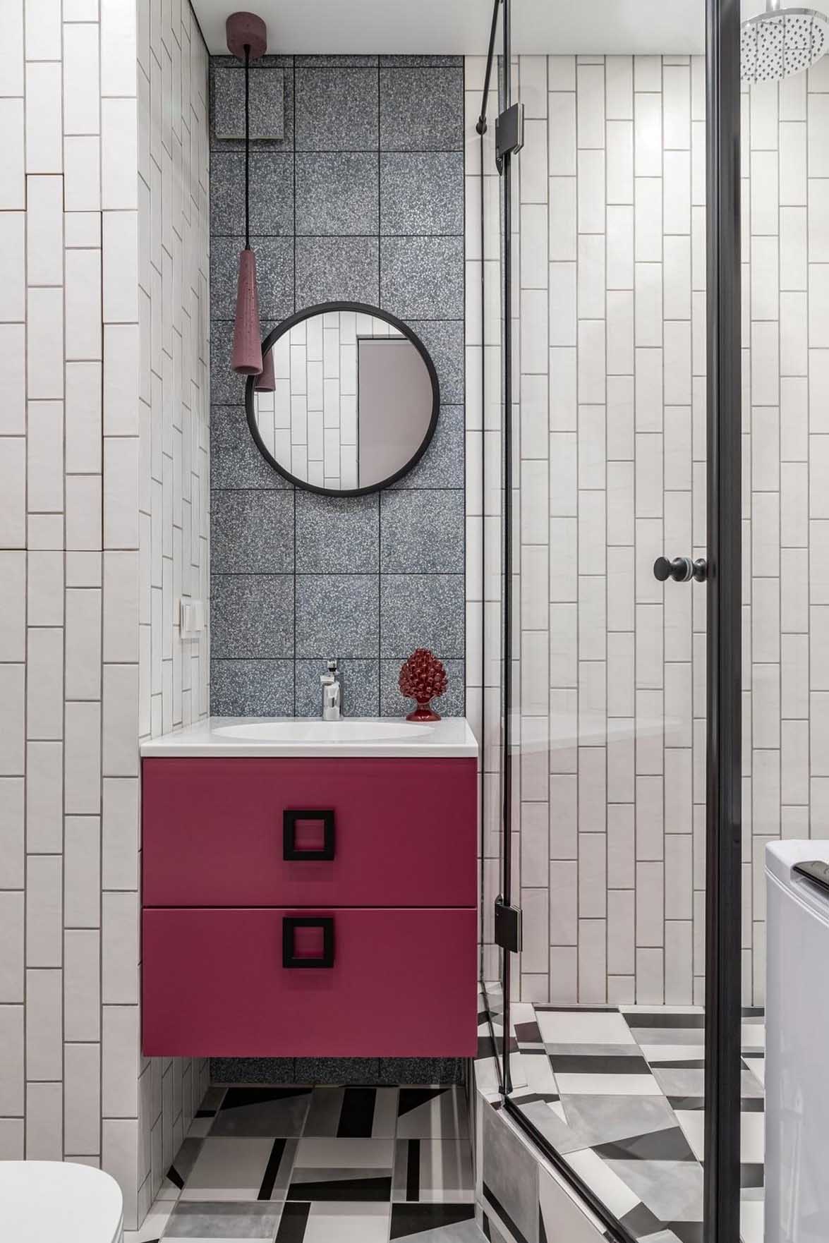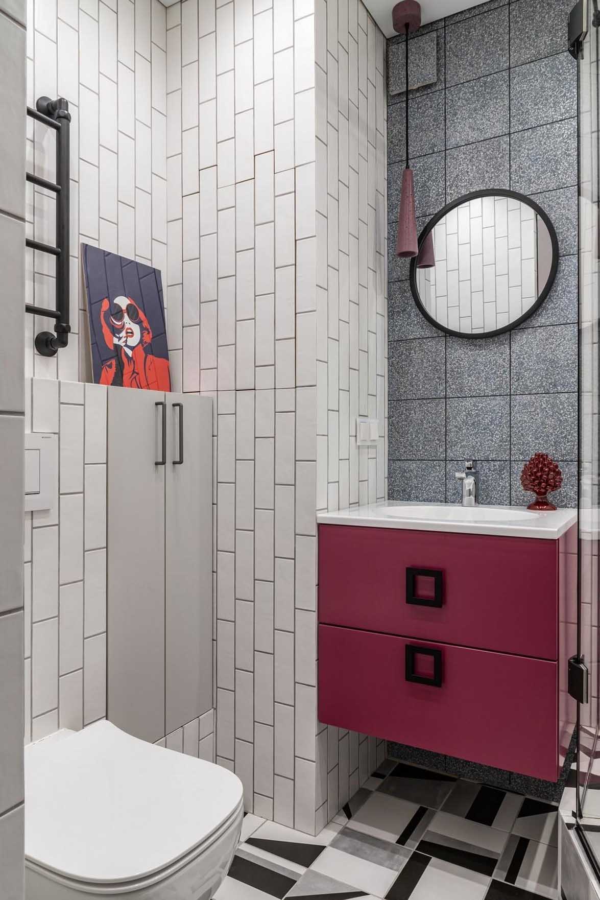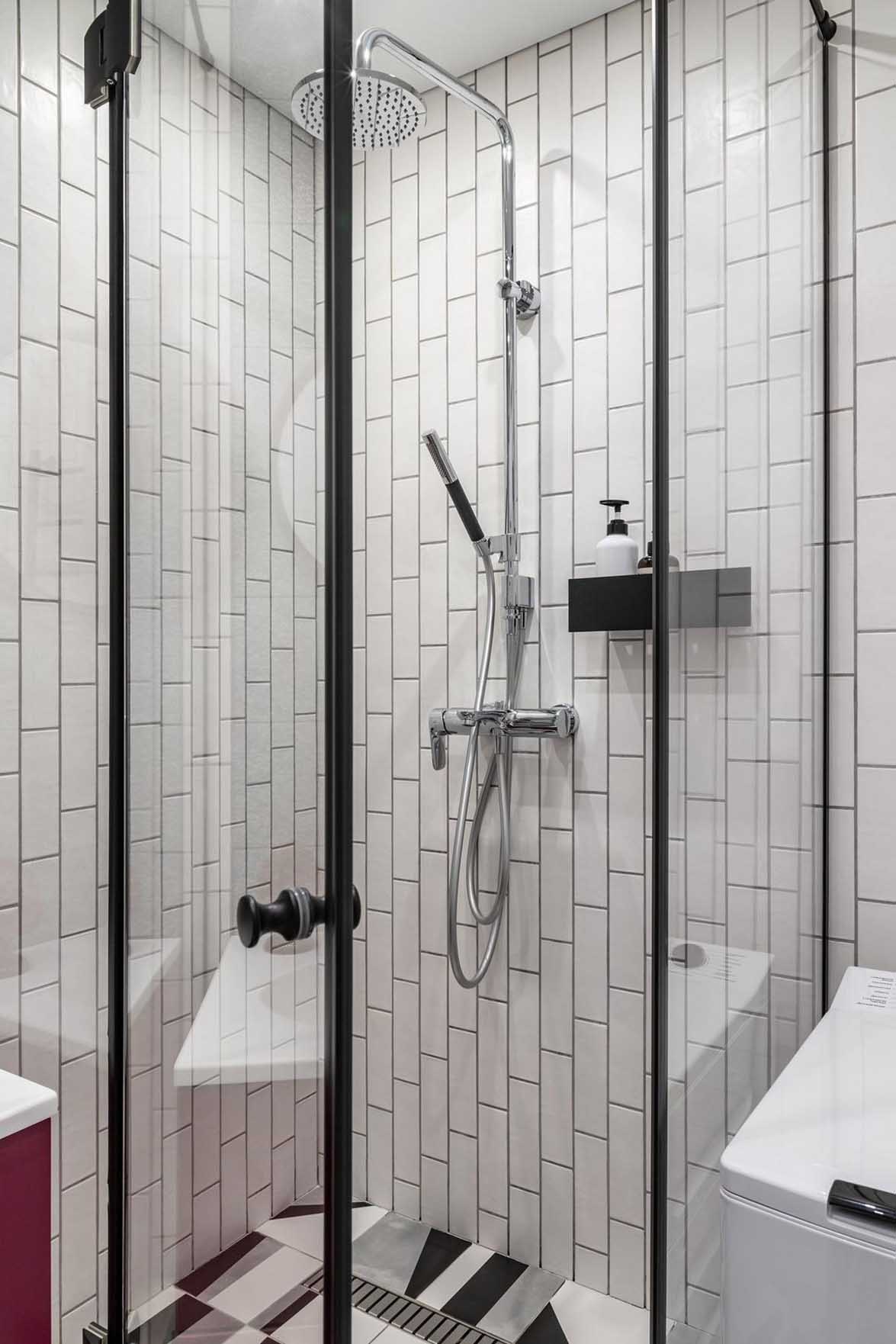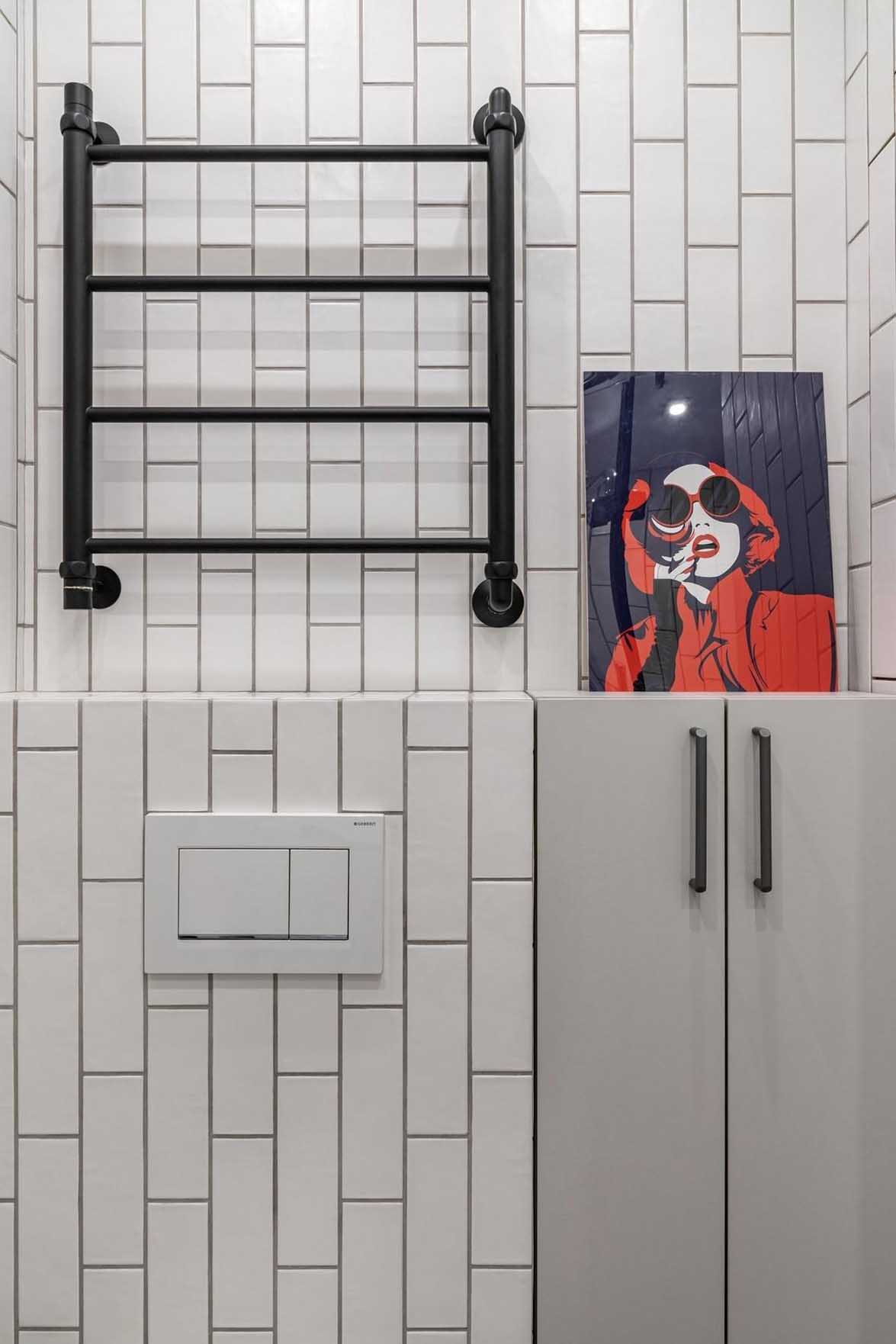 A fürdőszoba és a WC összevonásával egy sokkal komfortosabb, szellősebb és funkcionálisabb helyiség jött létre. A padlóra a konyhából már ismerős geometrikus mintás lap került, amely folytonosságot teremt a terek között, míg a falakat nagyrészt egyszerű, időtálló, kisméretű fehér téglalap csempe borítja.