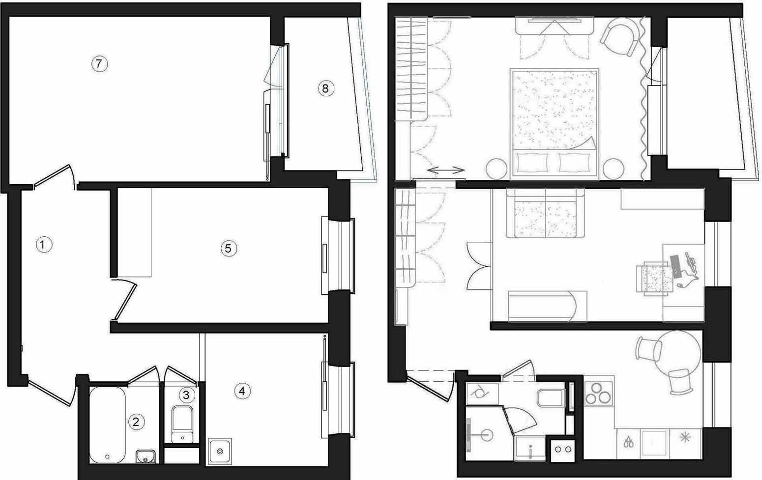 Ez a kisebbik, immár félig nyitott helyiség kapta a dolgozó- és vendégszoba funkciót is. Az erkélykapcsolatos, tágasabb szoba megmaradt kényelmes hálószobának.