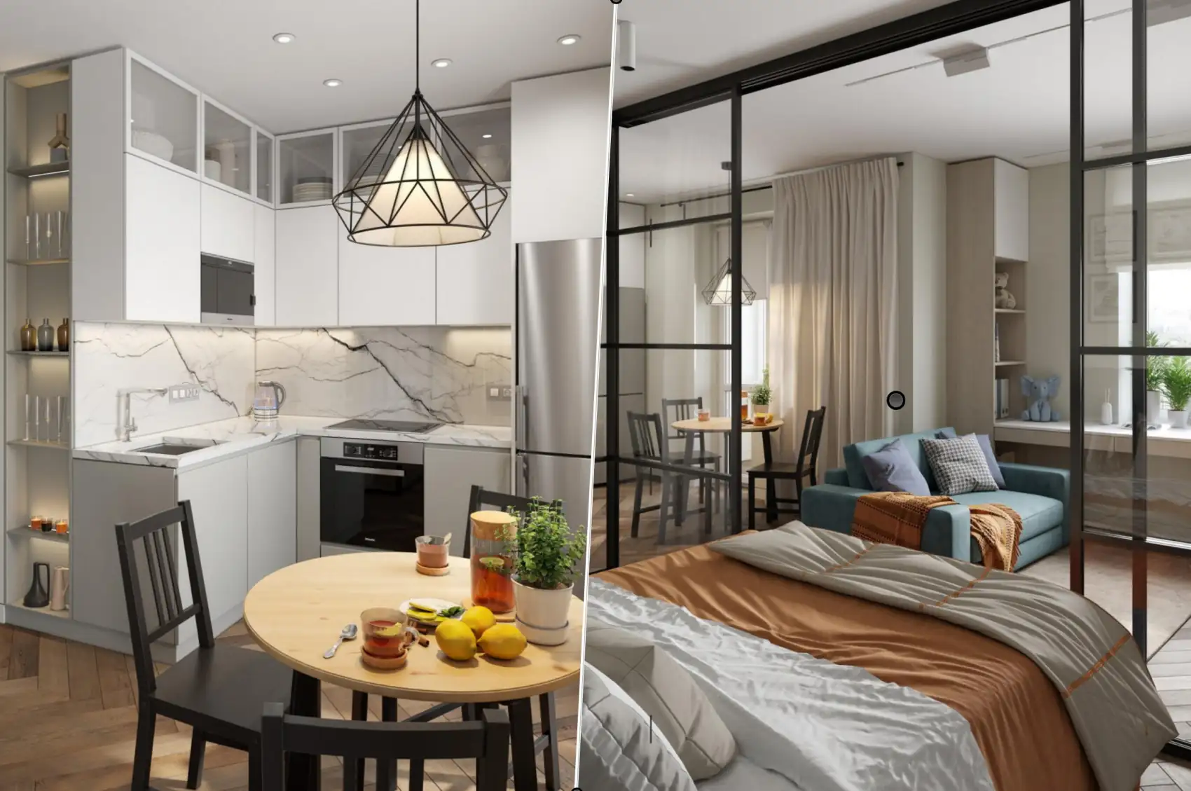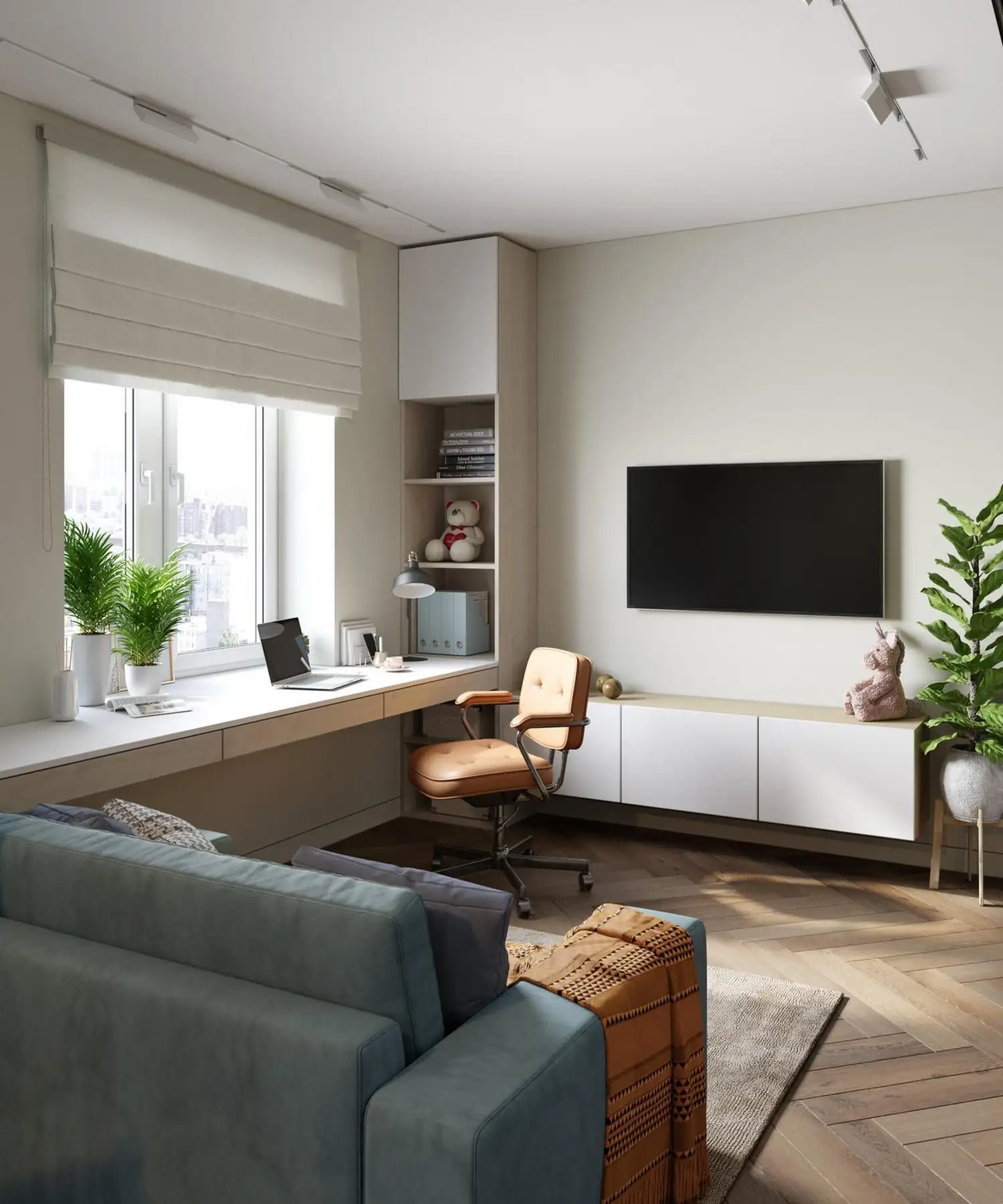 A 43 m²-es, egyszobás lakás átalakítása során a tervezőnek nemcsak a nemsokára érkező gyermek és a fiatal szülők kényelmét kellett szem előtt tartania, hanem azt is, hogy a nem túl távoli jövőben tervezett lakáseladás során az ingatlant a lehető legmagasabb áron lehessen értékesíteni. Az eredmény egy funkcionális konyha-nappali remek dolgozósarokkal és egy hálószoba, amelyben a babasarok is helyet kapott.