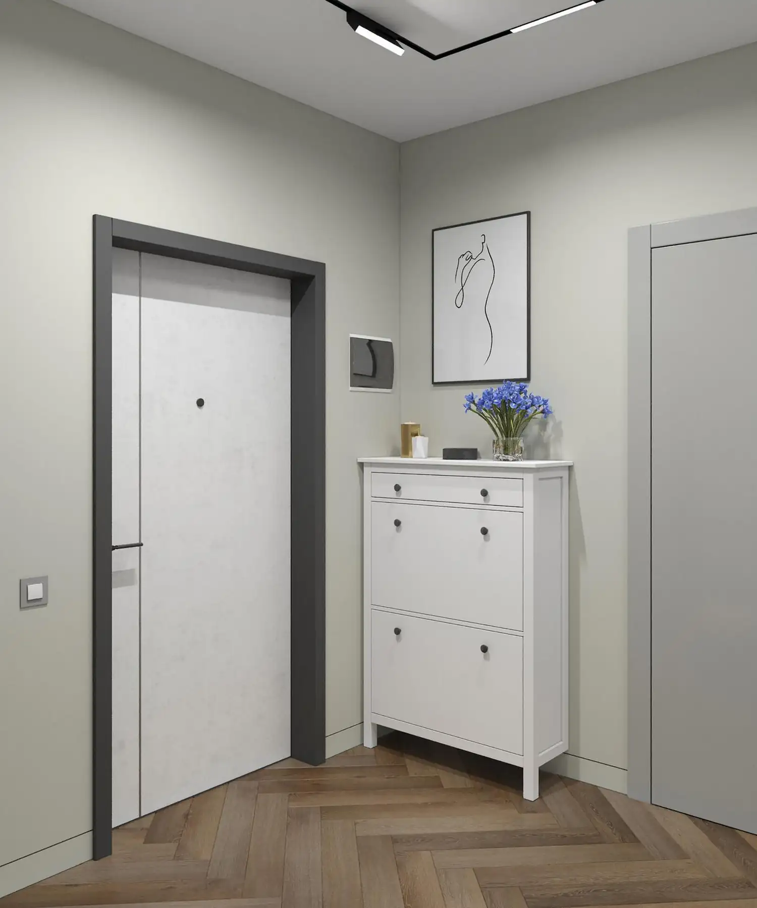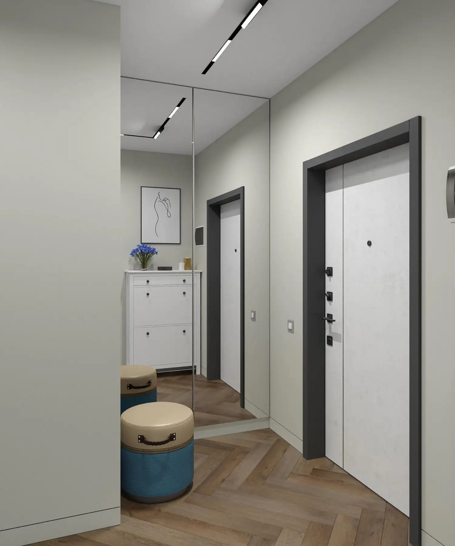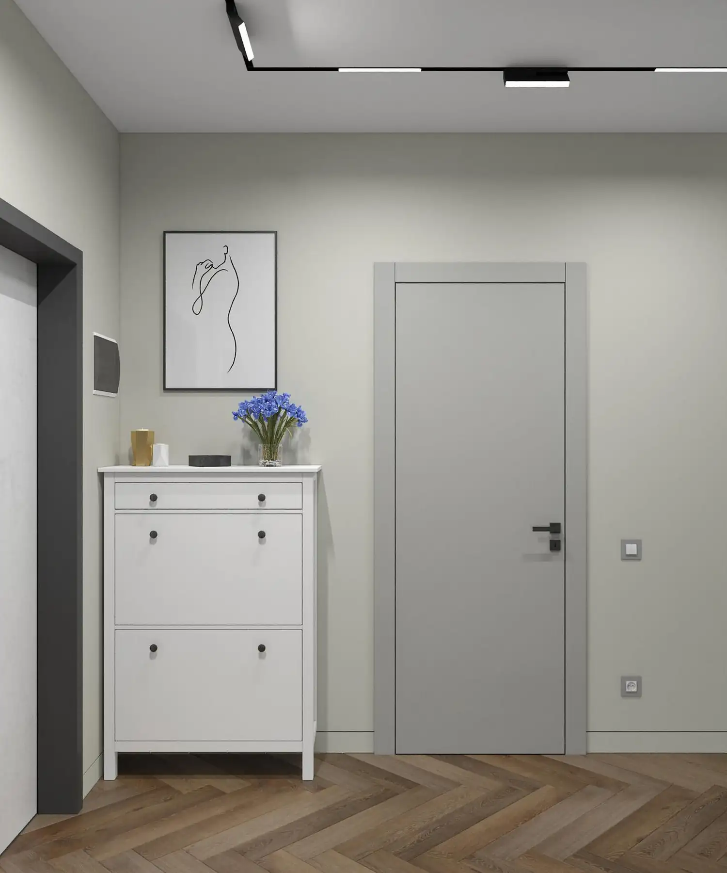 A burkolatok és felületek esetében az egyszerűségre törekedtek, a falak világos árnyalatú festést kaptak. A minimalista stílusú megjelenést – amely időtálló, így hosszú távon megőrzi az enteriőr minőségérzetét – a rejtett lábazatok alkalmazása erősíti, elkerülve a tér vizuális túlzsúfoltságát. A hagyományos csillárokat teljesen elhagyták, a világítást modern sínes rendszerek és beépített spotlámpák biztosítják. Az egyetlen hangsúlyos elemet az étkezőasztal fölé belógatott dizájnlámpa jelenti.