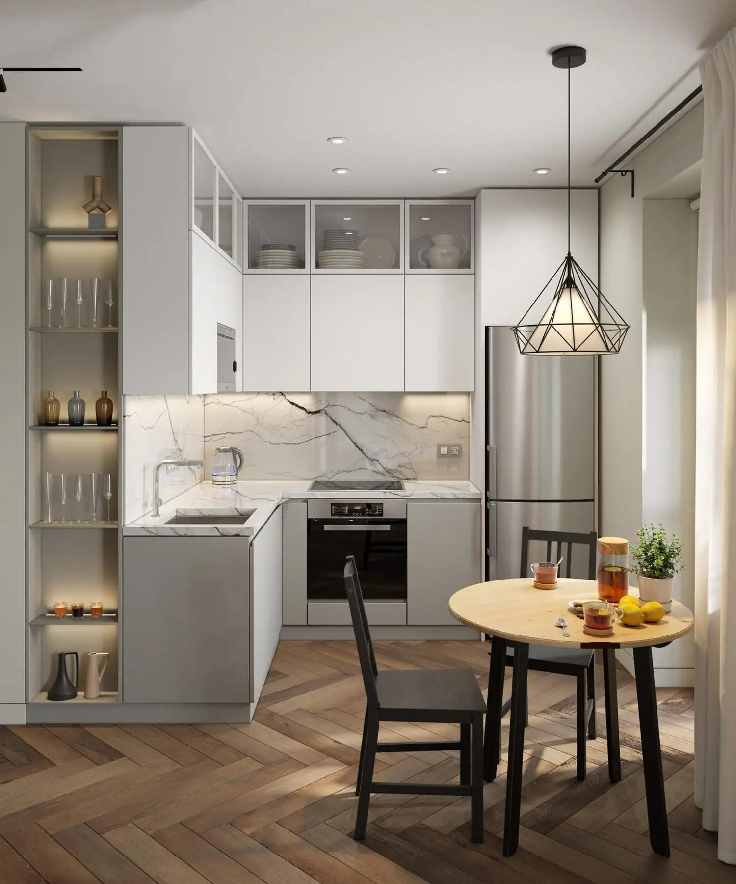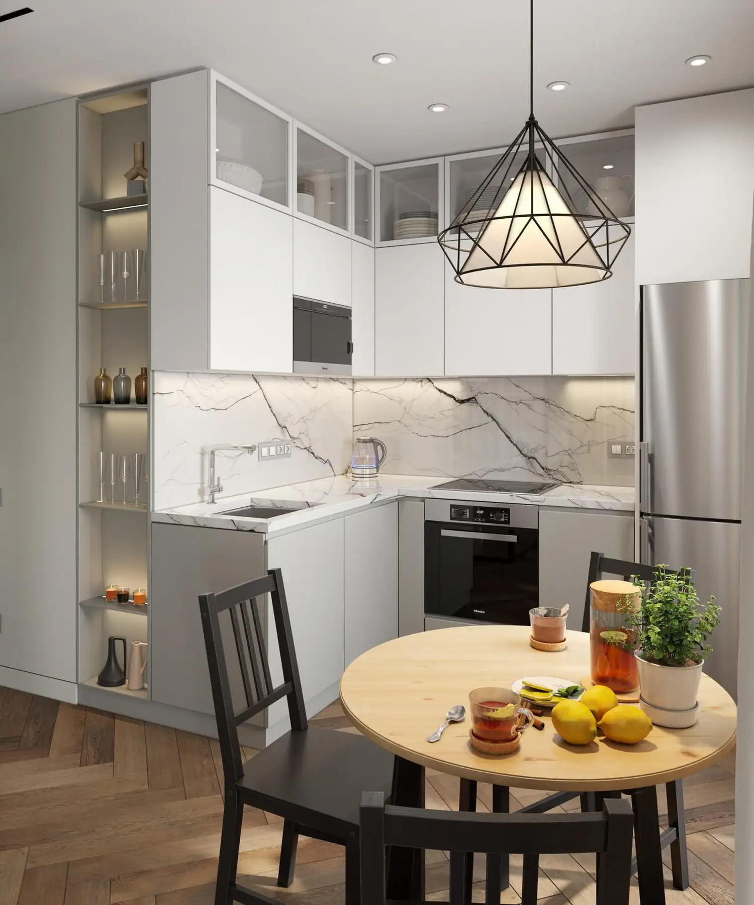 Az L-alakú konyhában minden szükséges gép helyet kapott: mosogatógép, sütő és mikrohullámú sütő. A sarok kialakításnak és a szellőzőakna adottságainak köszönhetően egy rejtett világítással ellátott beépített polcrendszert is sikerült kialakítani az ünnepi étkészletek, poharak és dekorációs tárgyak számára. Az ilyen egyedi, térbe simuló, beépített asztalosmunkák kimondottan emelik a lakás színvonalát és értékét.