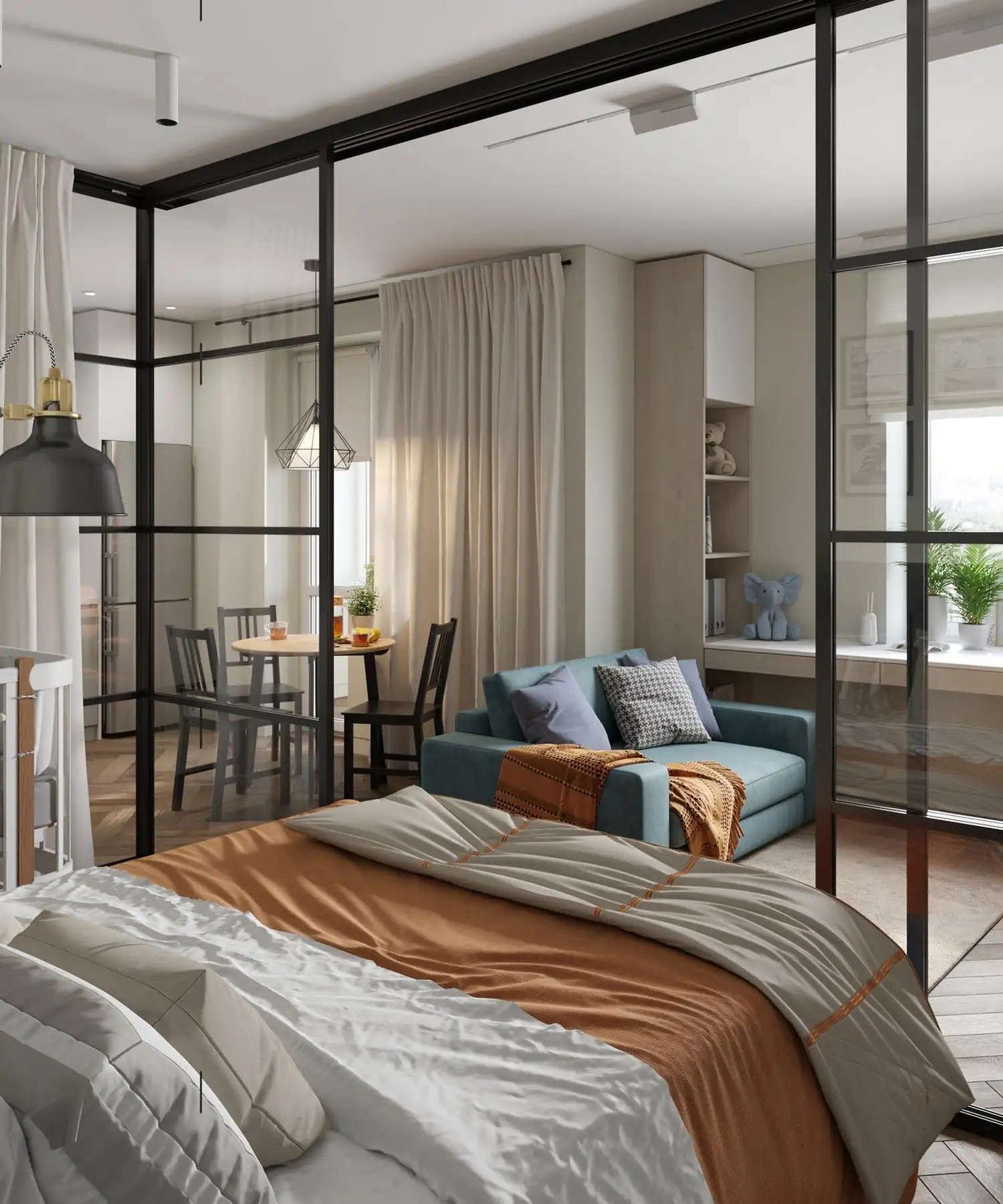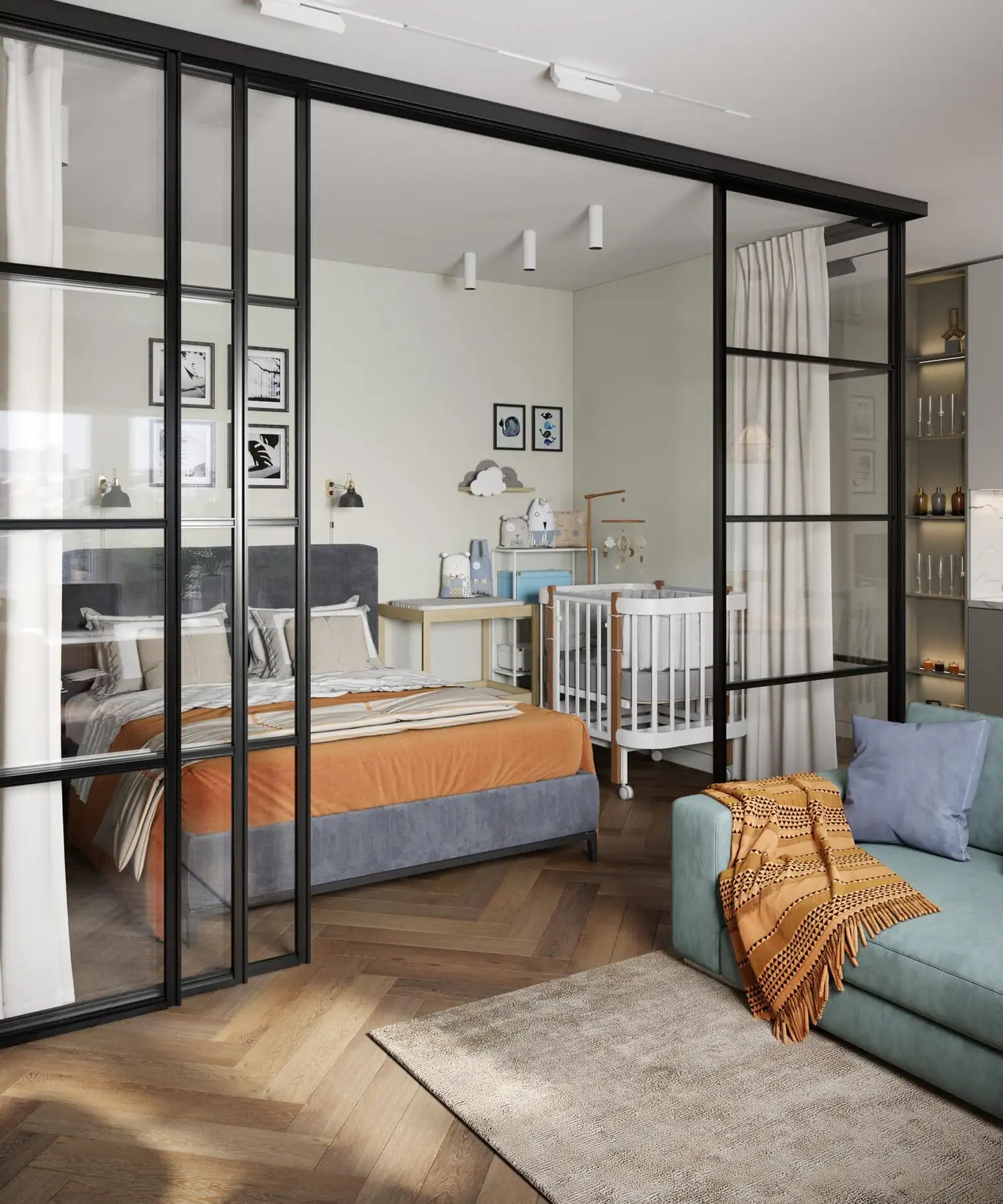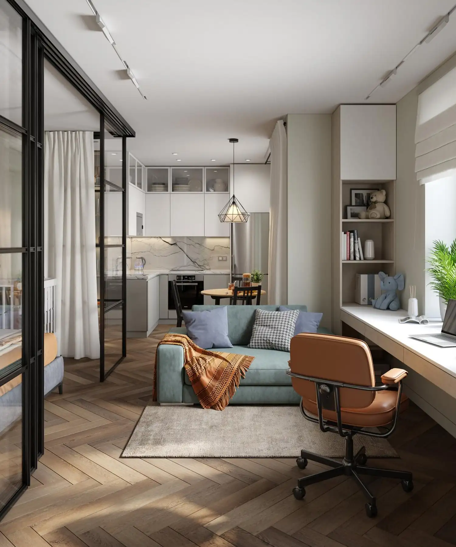 A lakásfelújítás projekt során egy első gyermekét váró fiatal párnak segített a lakberendező. A 43 négyzetméteres teret úgy kellett újraosztani, hogy a szülők és a baba számára is elegendő hely jusson, miközben az alkalmazott műszaki és dizájnmegoldások a lakás piaci értékét is növelik. A fő cél a baba számára kényelmes környezet kialakítása volt – például a nyugodt nappali alvás biztosítása, amit üvegfalak beépítésével oldottak meg –, bőséges tárolóhelyek létrehozása, valamint egy otthoni munkaterület kialakítása a gyakran otthonról dolgozó megrendelő számára. A tervező végül a stúdió jellegű, nyitott térkialakítás mellett döntött, hogy a természetes fény és a tágasság érzete mindenhol érvényesüljön. Ez a jól zónázott, világos alaprajz jelentős értéknövelő tényezőnek számít az ingatlanpiacon.