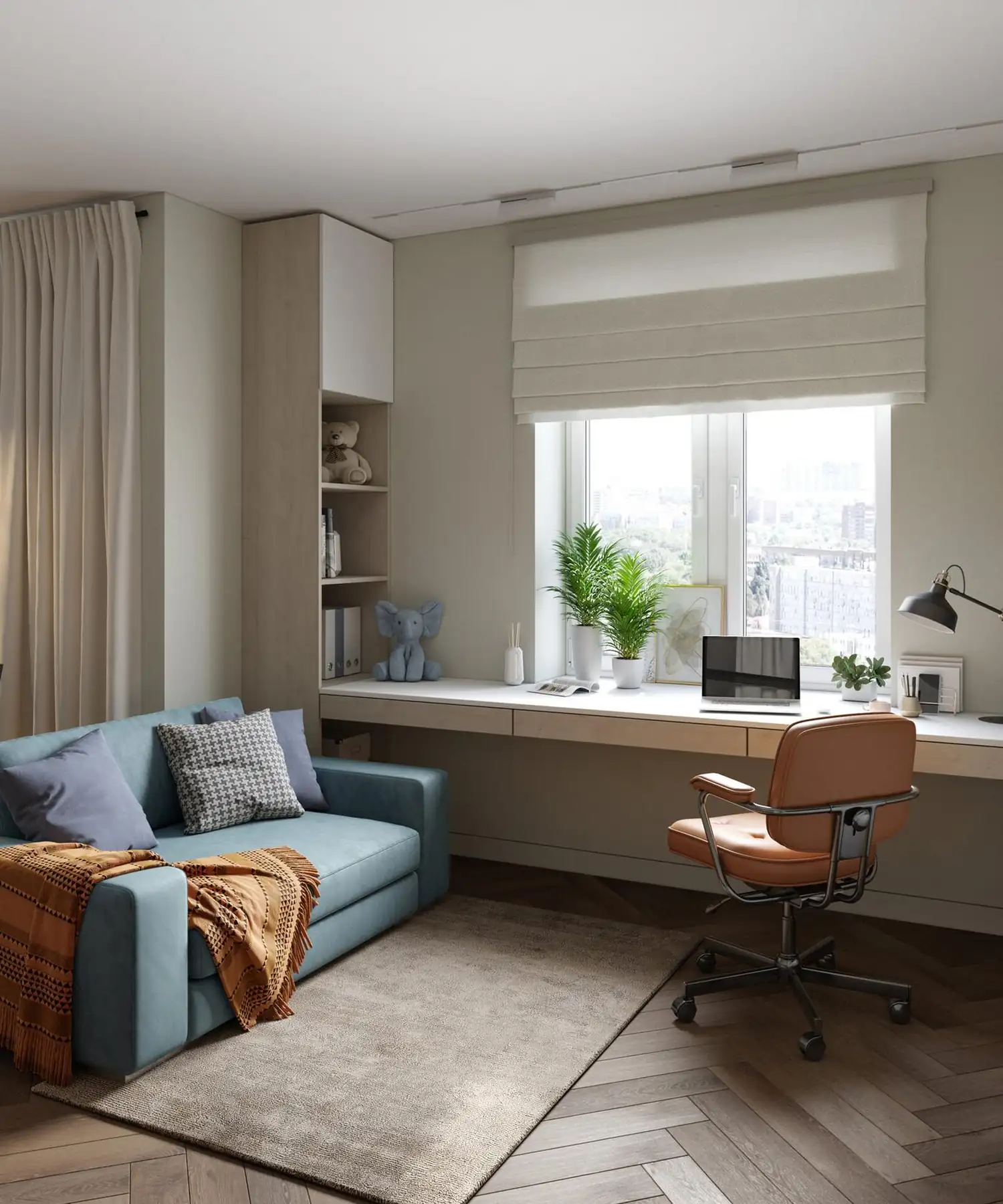 A dolgozósarkot az ablaknál helyezték el: az asztal fiókokkal kiegészülve az ablakpárkány folytatását képezi, mellette pedig egy könyvespolc szolgálja az irodai eszközök tárolását.