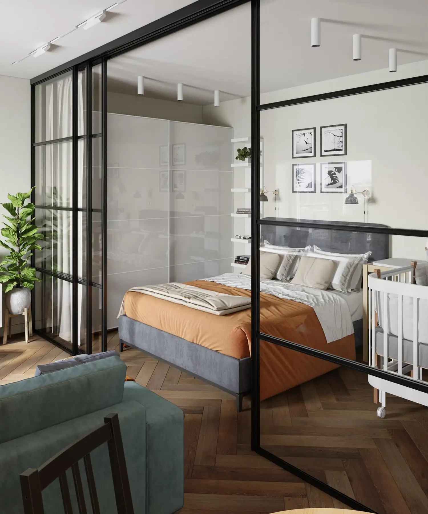 A hálószoba zónáját multifunkcionálisra tervezték. A térkihasználás maximalizálása és az esztétikum jegyében egy beépített tolóajtós gardróbszekrényt választottak, így nem kellett extra közlekedőteret hagyni az ajtók nyitásához. Az egyik éjjeliszekrényt egy fali polc helyettesíti, ami könyvek és dekorációk tárolására is alkalmas. A hálószoba egy részét teljes egészében a babasaroknak szentelték: itt egy átalakítható babaágy, egy polcos tároló és egy kényelmes pelenkázóasztal kapott helyet.