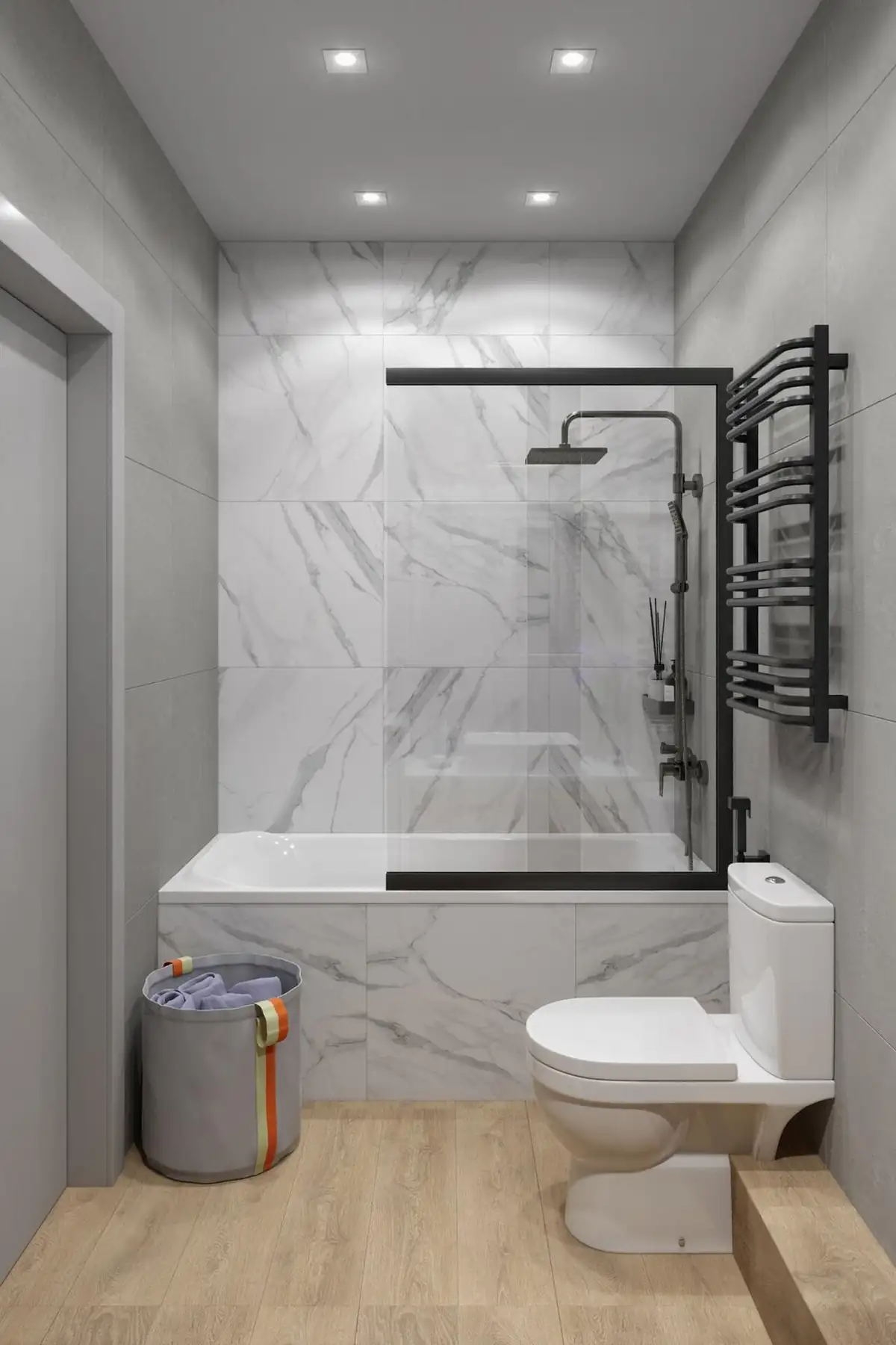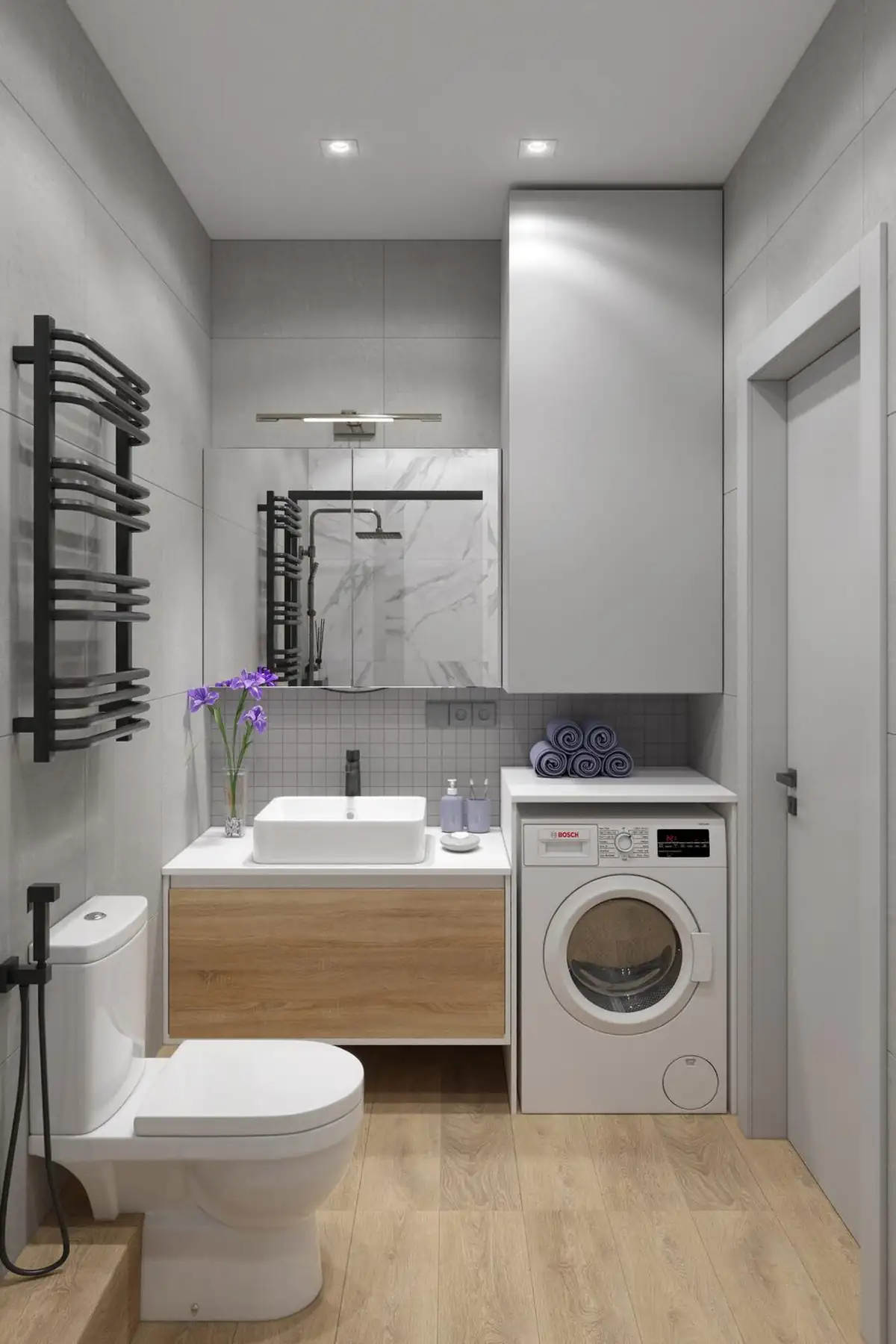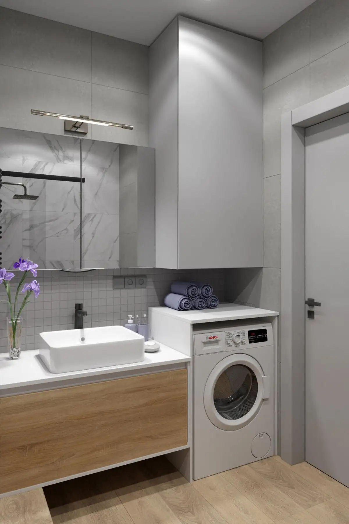 A fürdőszobát és a toalettet egybenyitották a tér leghatékonyabb kihasználása érdekében. A kád megtartása tudatos döntés volt, hiszen a kisgyermekes mindennapokban ez kiemelt fontosságú, ráadásul egy jól megtervezett, tágasabb fürdőszoba a jövőben is növeli a lakás komfortfokozatát és eladhatóságát.