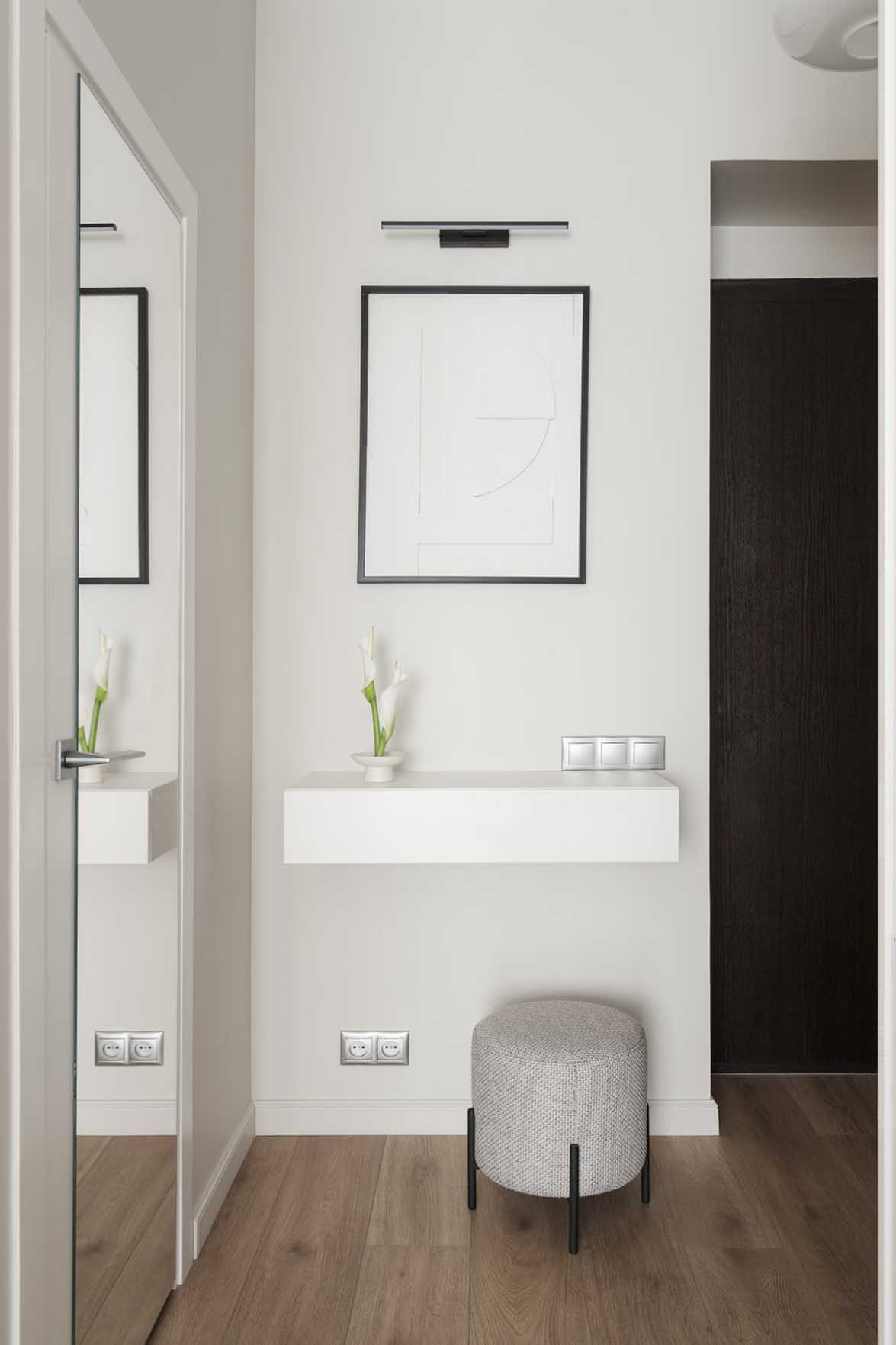A kisméretű előszobában csak a legszükségesebb bútorok kaptak helyet: egy függesztett konzolasztal, egy kisebb szekrény és egy puff. A fő tárolási funkciót a bejárat melletti gardrób látja el, így a tér rendezett maradt.