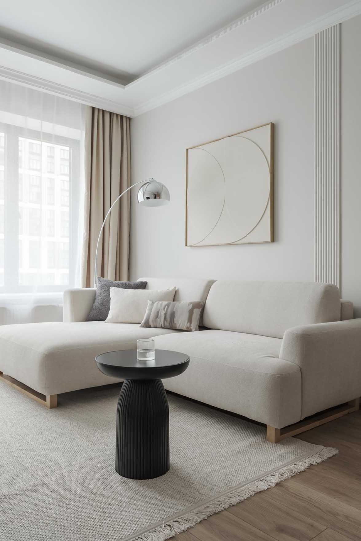 A felújítás során a nappaliban kicserélték a padlóburkolatot, javították a falhibákat, majd új festést és dekoratív falpaneleket alkalmaztak.
