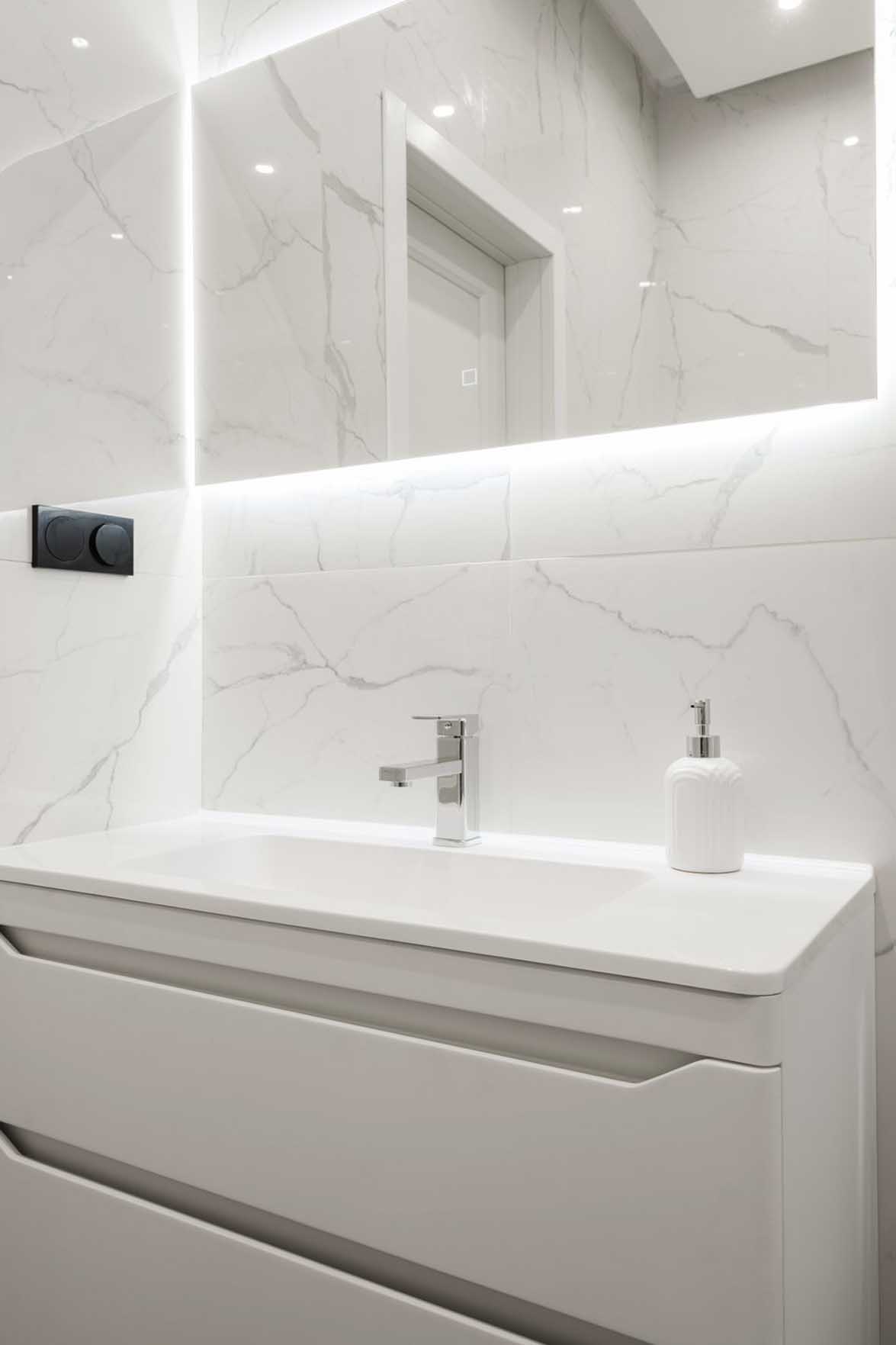 A vizesblokkban a nedvesség miatt tönkrement ajtókereteket cserélték ki, és elbontották a régi, elavult berendezéseket. Új, modern mosdószekrényt és egy háttérvilágítással ellátott tükröt szereltek fel, ami azonnal frissebbé tette az összképet.