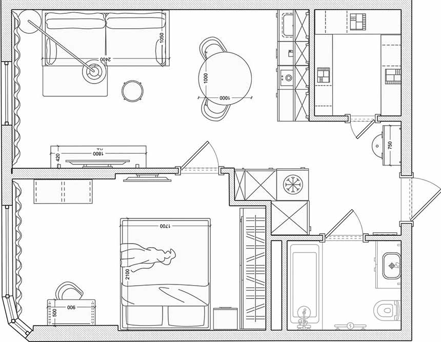 A 36 m²-es lakás alaprajzán nem változtattak, minden zóna az eredeti helyén maradt. Az ingatlan egy különálló hálószobából, amerikai konyhás nappaliból, fürdőszobából, valamint előszobából és az onnan nyíló gardróbhelyiségből áll.