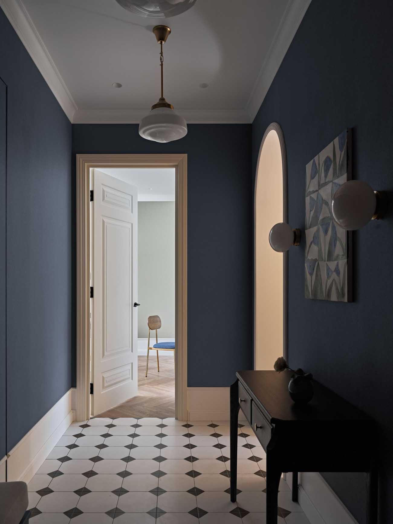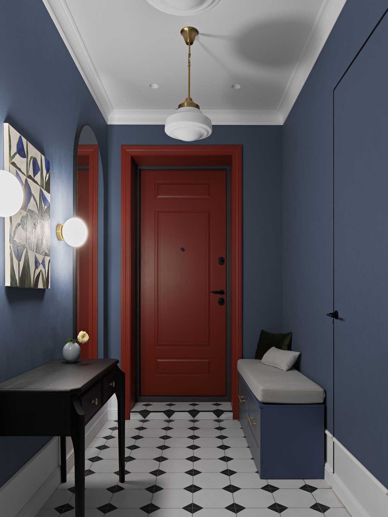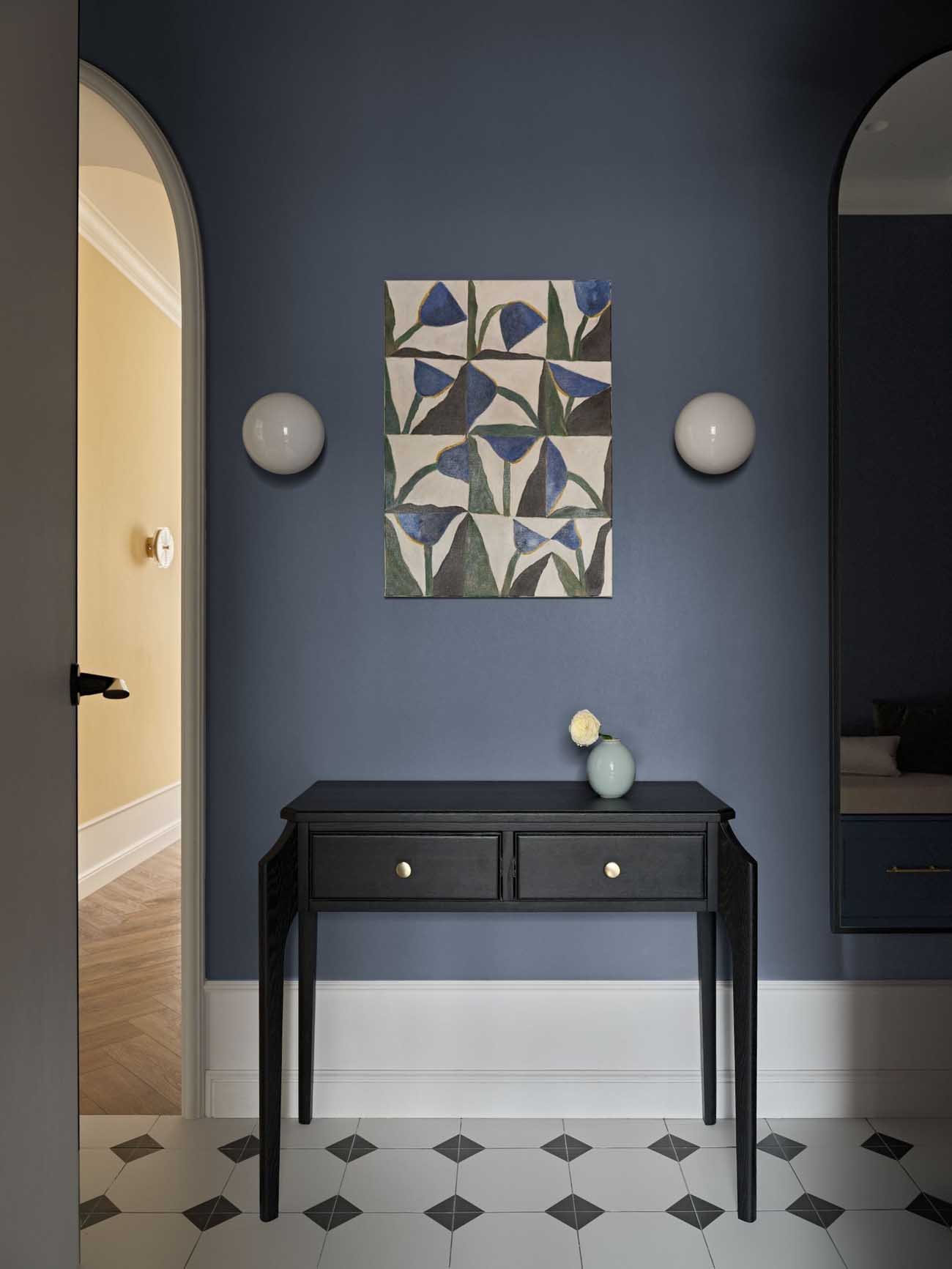 Az előszoba mélykék színvilága azonnal karakteres felütést ad az enteriőrnek. A padlót itt fehér alapon fekete négyzetes elemekkel díszített, geometrikus mintázatú hidegburkolat borítja. A hagyományos, sokszor robusztus beépített szekrény helyett egy funkcionális háztartási blokkot és tárolórendszert alakítottak ki, amely elegánsan rejti el a ruhákat és a mindennapi használati tárgyakat. A bejárati ajtó mellett egy cipőtárolós pad és egy apróságok elhelyezésére szolgáló konzolasztal gondoskodik a kényelmes megérkezésről.