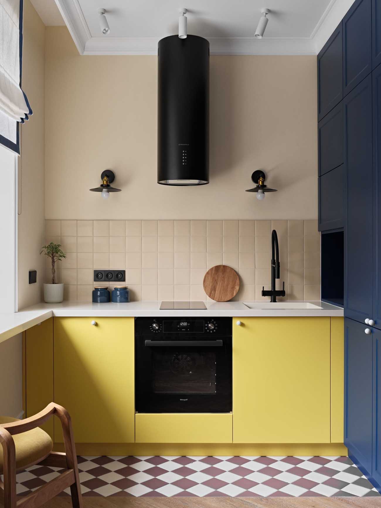 A korábbi szűkös konyhát és az eredetileg hálószobaként funkcionáló szomszédos teret összenyitották, így egy tágas, világos, tejes-bézs árnyalatú nappali-konyha zóna jött létre, ahol a főzés és a társasági élet immár kényelmesen megfér egymás mellett. A konyha padlóját fehér-szilvakék négyzetes csempék díszítik. A tárolást a beépített oszlopszekrények és az alsó konyhai elemek biztosítják. A felső szekrényeket szándékosan elhagyták, hogy a nappaliból is jól látható falfelület szellős maradjon; itt csupán egy hangsúlyos páraelszívó és stílusos, retró hangulatú falikarok kaptak helyet.