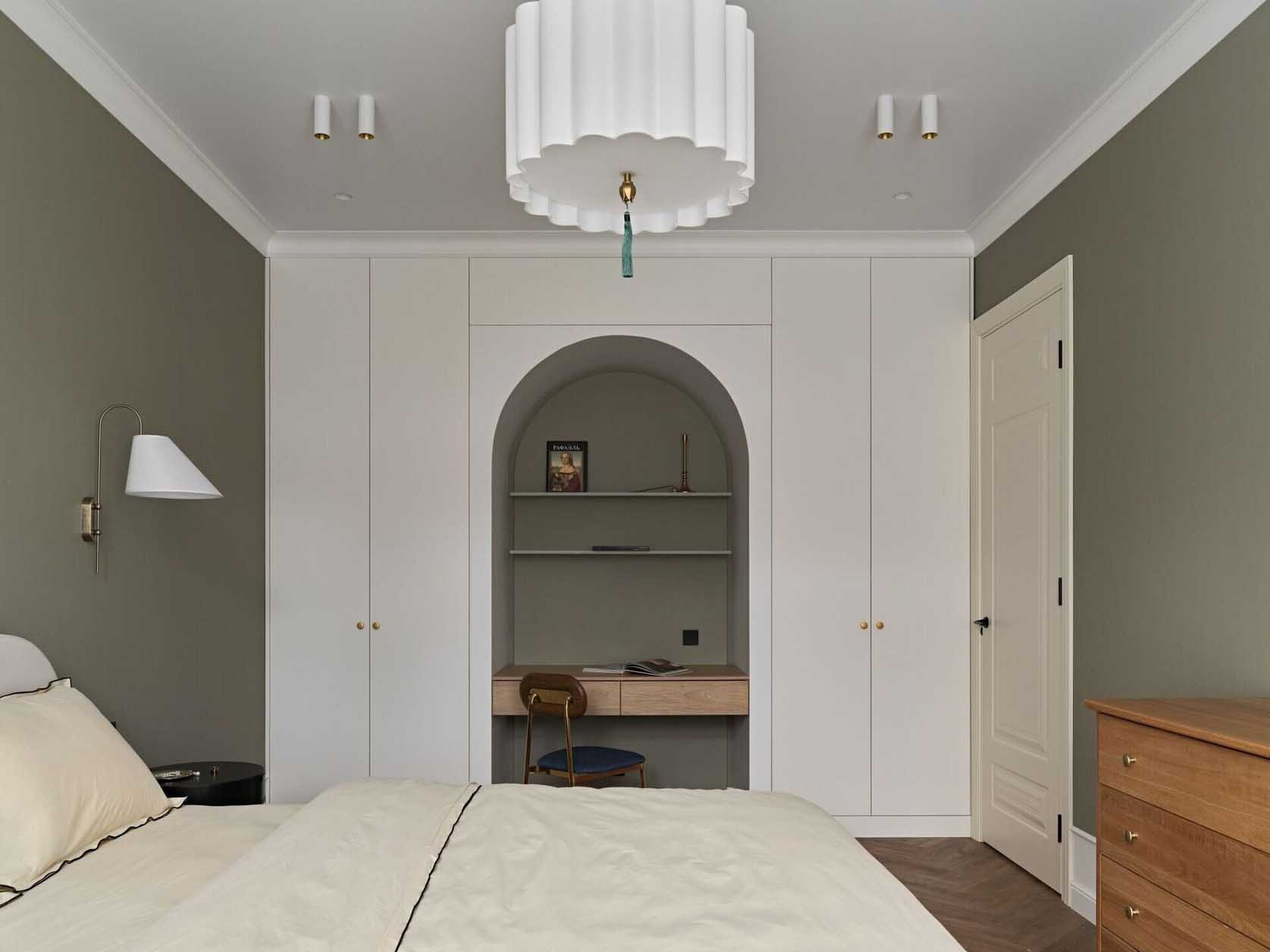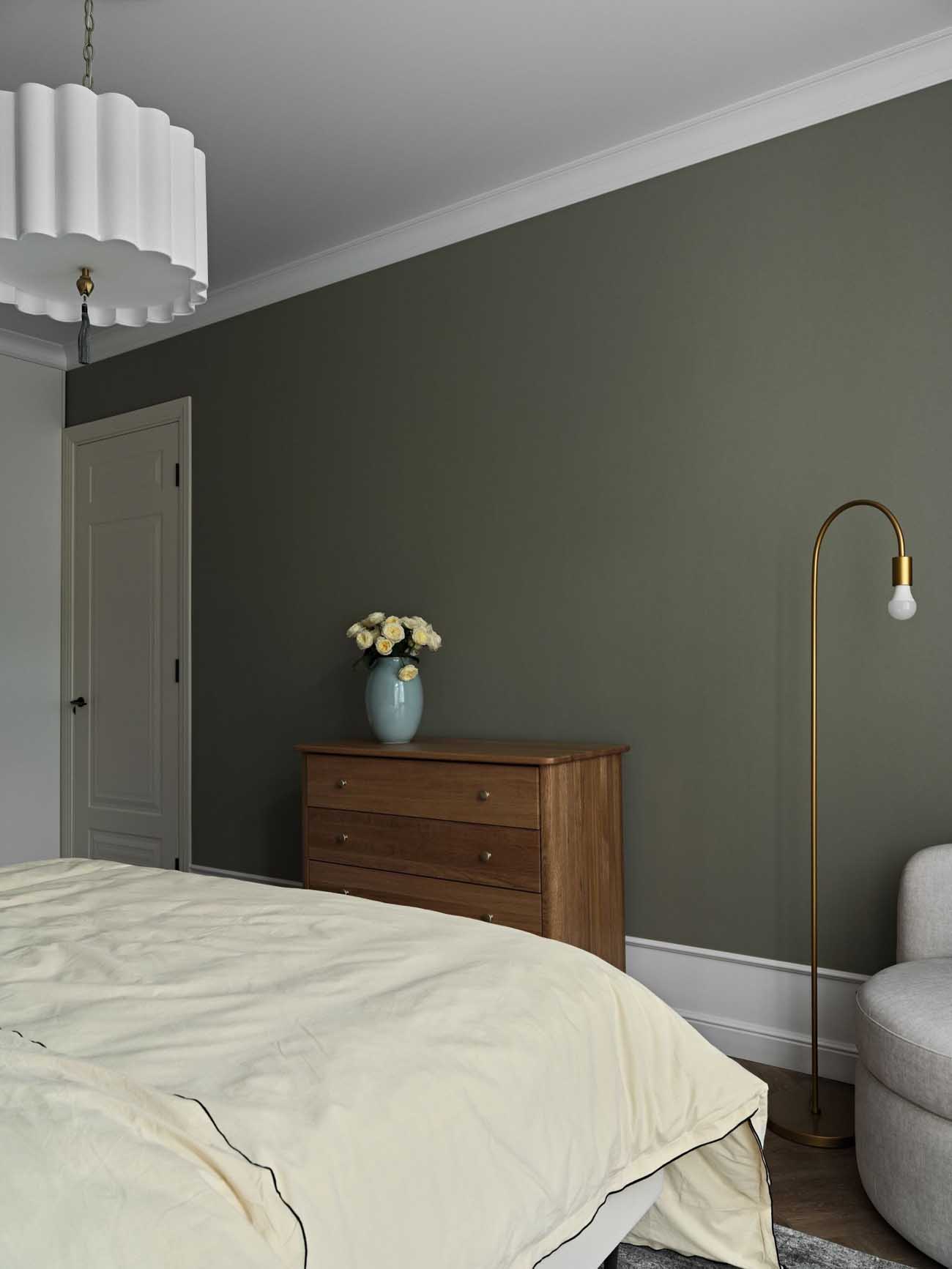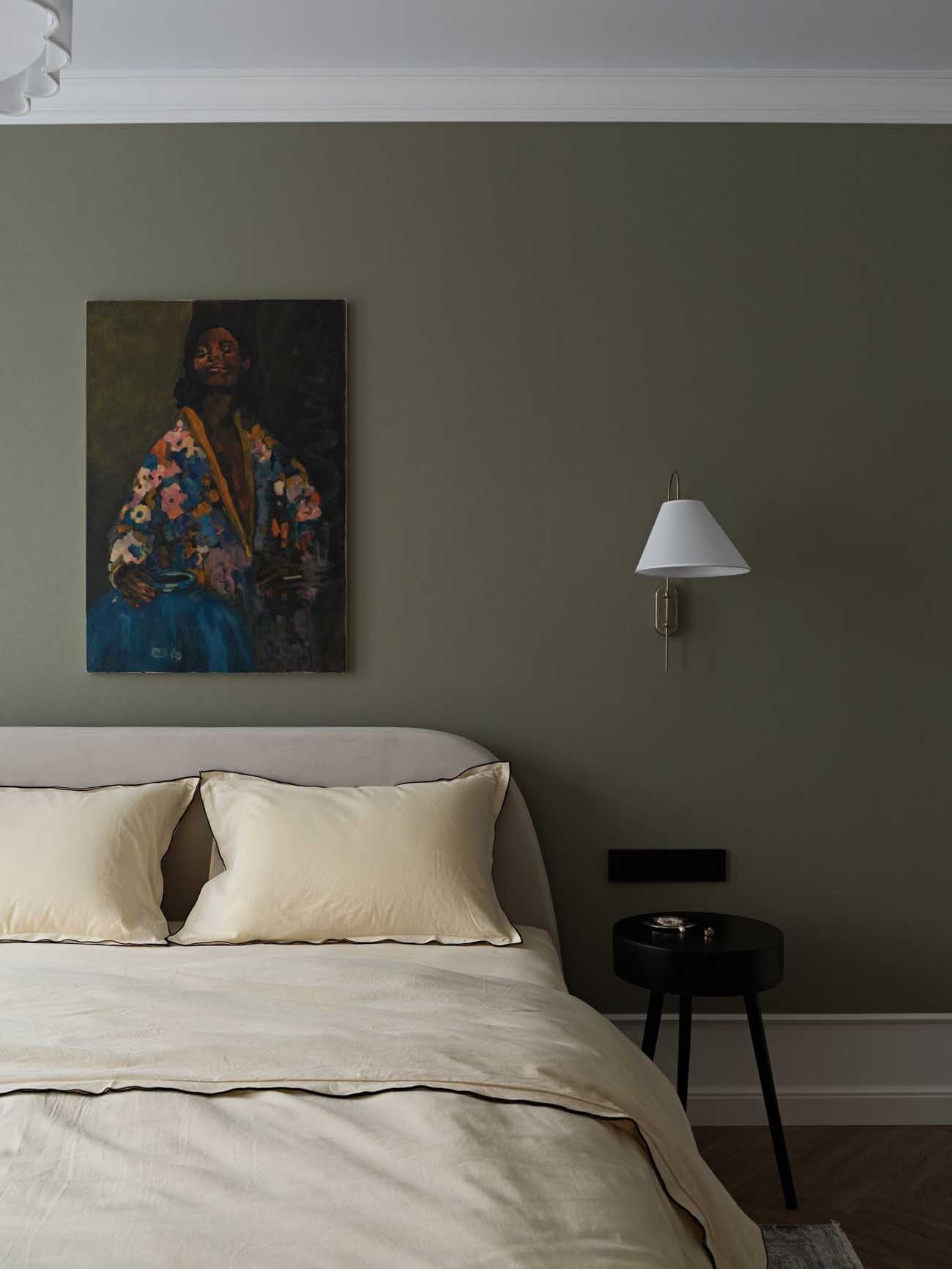 A hálószoba a nyugalom szigete a legtöbb zónában színesen dekorált lakásban. Ebben a helyiségben a tompa zöld árnyalatú falfelületek dominálnak, amelyek természetes és pihentető hátteret biztosítanak az elvonuláshoz.