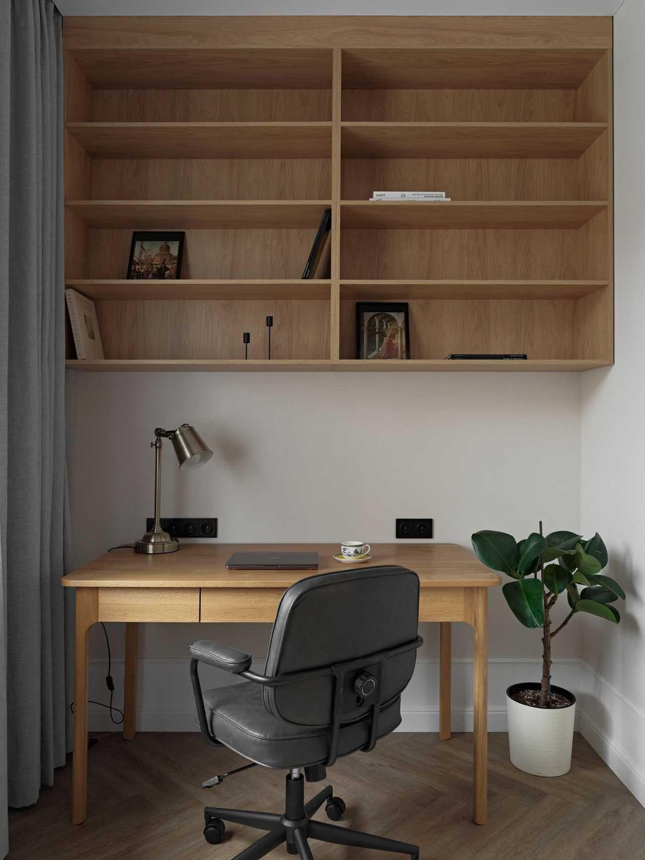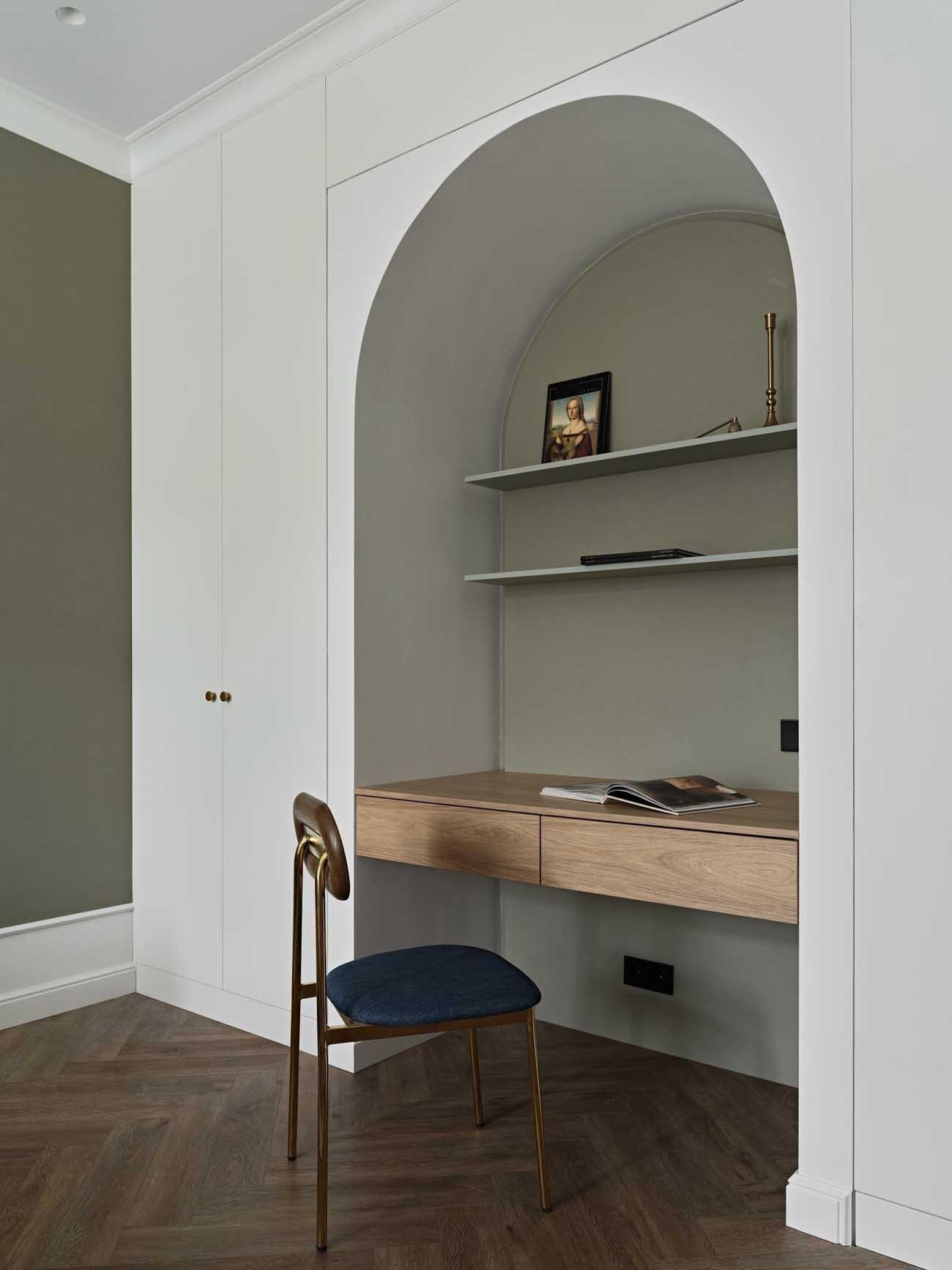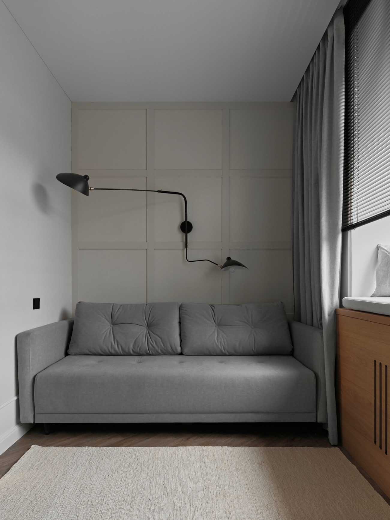 Az egykori harmadik szoba kettéosztásával a tervezők két új funkciót hoztak létre: egy átjárható tárolót (gardróbot), valamint egy világosszürke falakkal rendelkező, ablakos dolgozószobát. Utóbbi maximális hangszigetelést kapott a zavartalan munkavégzés érdekében. A funkcionális polcokkal kiegészített íróasztal mellett egy kényelmes, kinyitható kanapé is bekerült a térbe. A széles ablakpárkányt egyedi matraccal és párnákkal tették otthonossá, így az egy hívogató olvasó- és pihenőkuckóként is funkcionál.