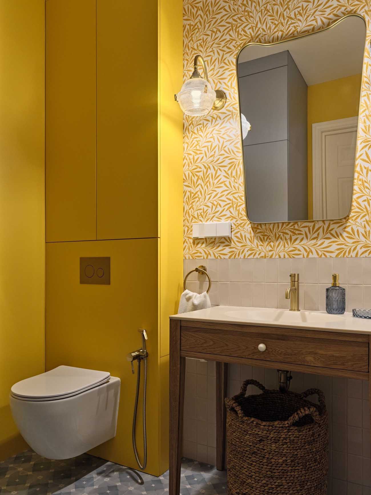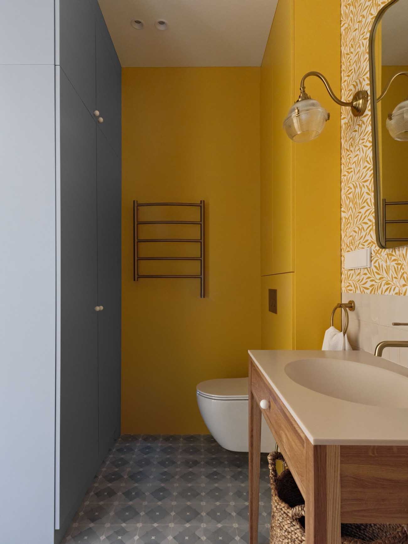 A közlekedő területének bevonásával a korábban különálló fürdőszobát és vécét egy jóval tágasabb, közös helyiséggé alakították. A mosdó feletti falfelületet egy prémium kategóriás, látványos levélmintás tapétával emelték ki, ami izgalmas, luxusérzetet keltő színfoltja a térnek. Ezt a kád és a mosdó környékén kisformátumú bézs csempével kombinálták, míg a többi falfelület meleg sárga festést kapott. A vizuális élmény megteremtéséhez a padlón végigfutó, ritmikus mintázatú szürkéskék burkolat is hozzájárul.