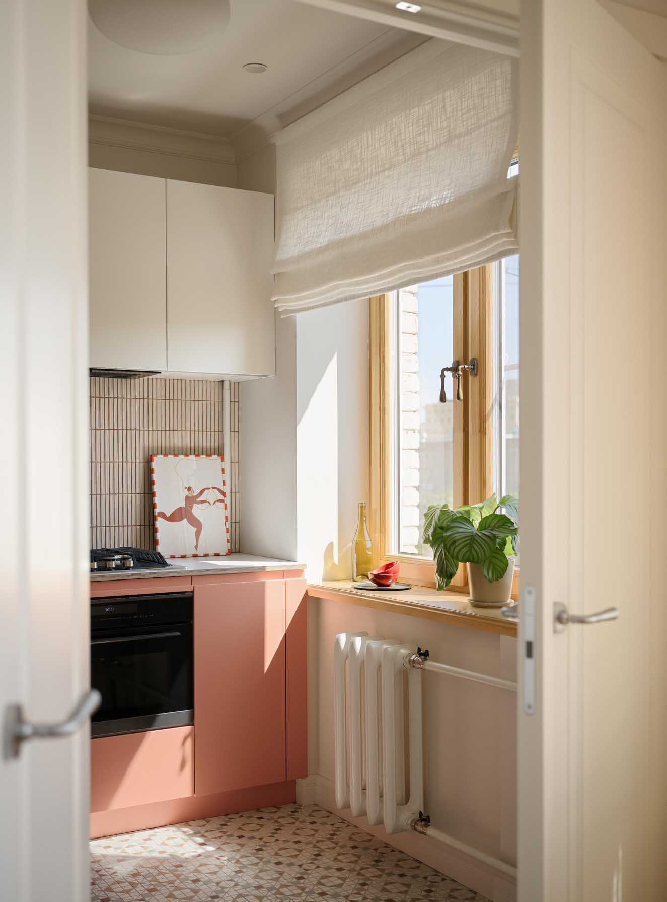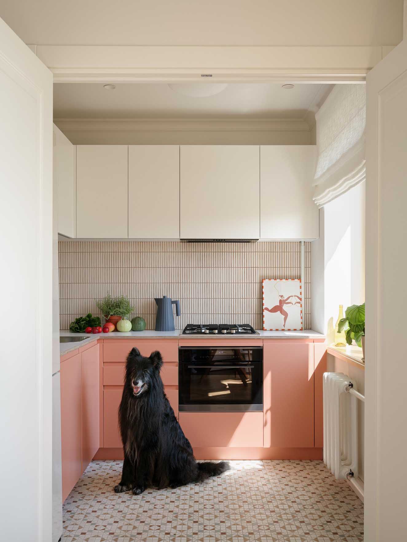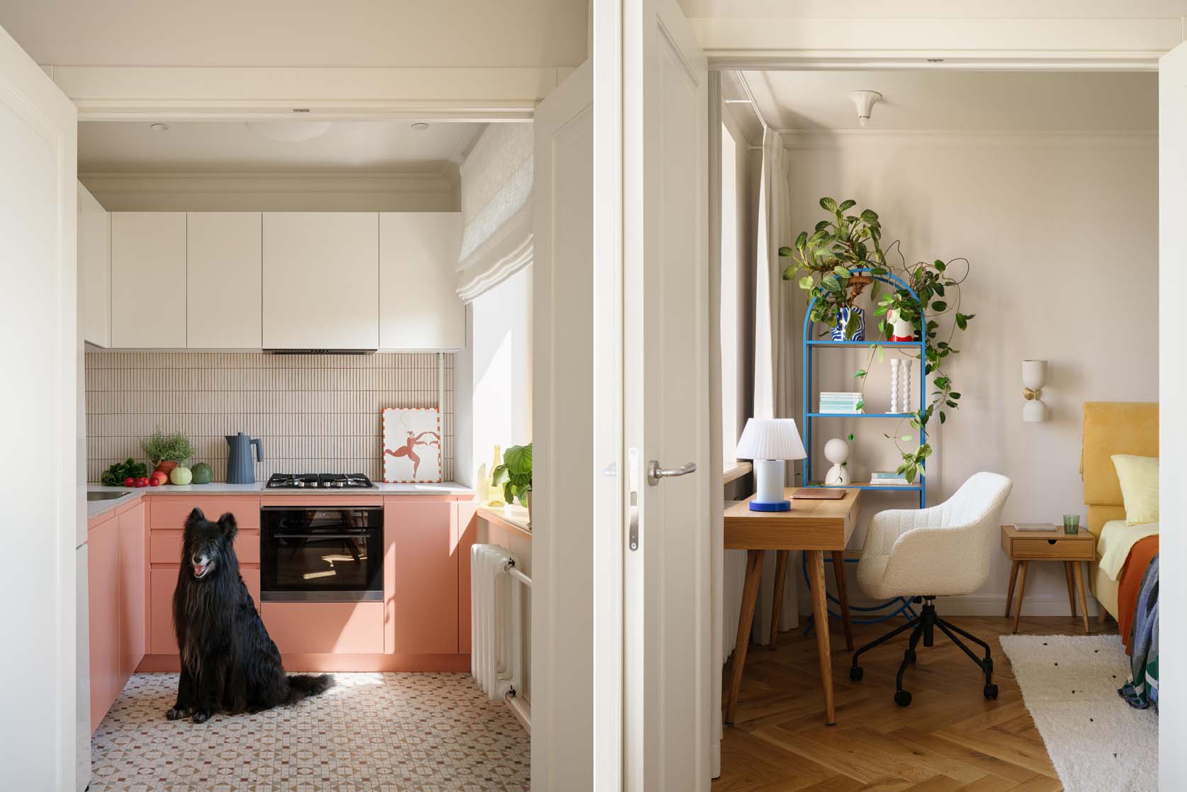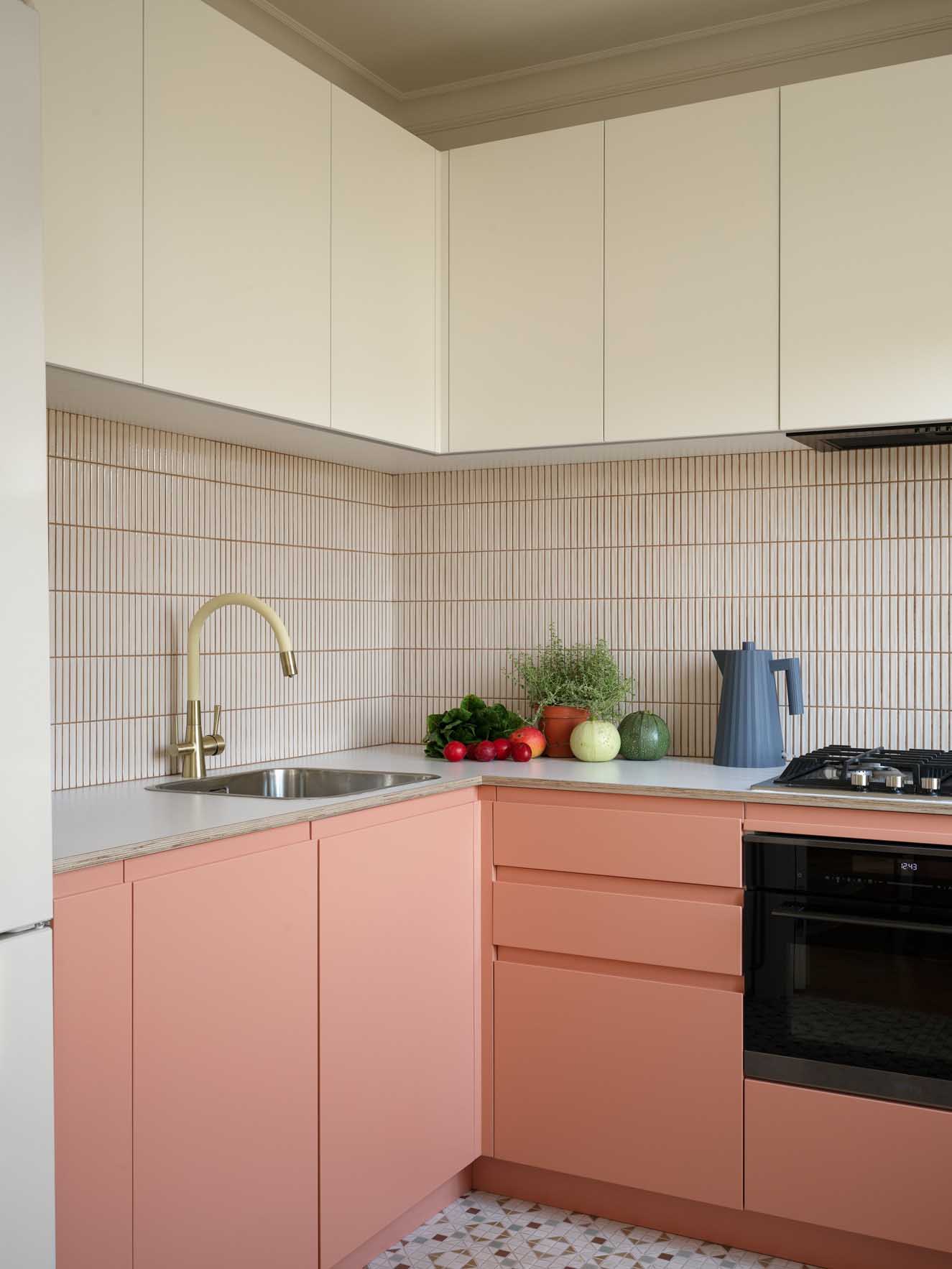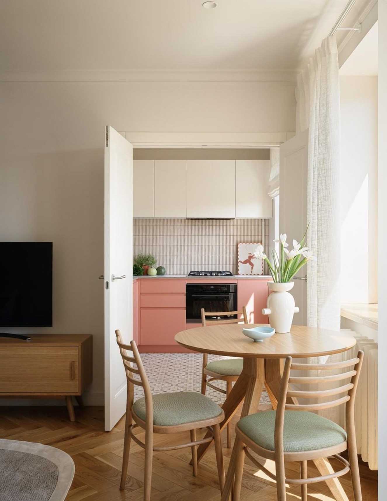 A konyha szerény alapterülete ellenére, a színhasználatnak köszönhetően rendkívül karakteres. A pasztell rózsaszín frontok és a karakteres mintájú padlóburkolat találkozása friss és üde látványt nyújt anélkül, hogy hivalkodó lenne. A tervező tudatosan elvetette a plafonig érő felső szekrények koncepcióját, helyettük könnyedebb tárolókat alkalmazott, így a tér szellősebb maradt, miközben a tárolókapacitás elegendő a mindennapi használathoz. Az étkező zónát autentikus vintage székek teszik teljessé, amelyek hidat képeznek a modern berendezés és a klasszikus designelemek között.