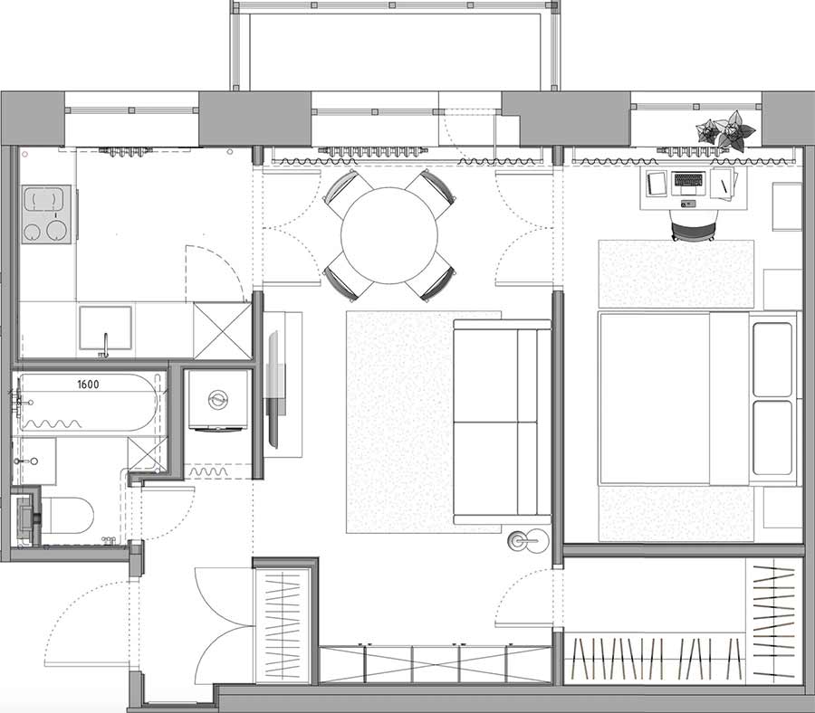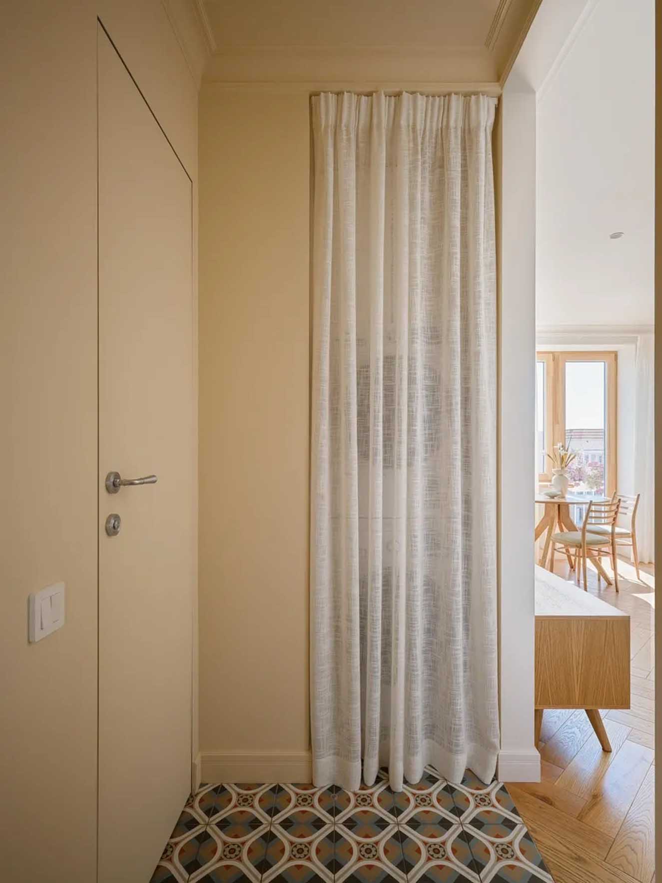 A legnagyobb változtatást az enfilád (egymásba nyíló terek) jellegű elrendezés bevezetése jelentette: a konyha bejáratát áthelyezték a nappaliba, és azt a hálószoba bejáratával párhuzamos tengelyre illesztették. Ez a megoldás optikailag megnyitotta a tereket, és segített elkerülni a kis lakásokra jellemző bezártságérzetet. Emellett a korábban beépített erkélyt is kiszabadították a burkolatok fogságából, így több természetes fény árad a lakásba, az új, mintás padlólapokkal és pihenősarokkal ellátott kültéri egység pedig a reggeli kávézások ideális helyszínévé vált.