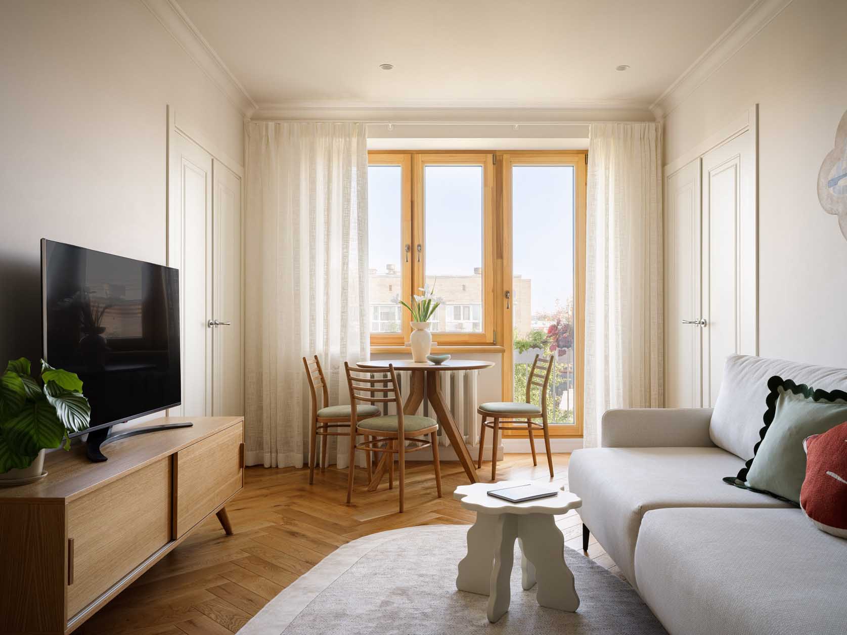 A lakás központi helyisége a nappali, amely több funkciót is ellát. A pihenő zóna mellett innen nyílik a lakás fő tárolási egysége is: egy gardróbszoba. Ez a döntés lehetővé tette, hogy a többi helyiség – különösen a hálószoba – mentesüljön a robusztus szekrények látványától, így megőrizve a letisztult vonalvezetést. A világítás kialakításánál a rétegzett fényforrásokra helyezték a hangsúlyt, amelyek a természetes fa textúrákkal együtt meleg, hívogató otthonosságot sugároznak.