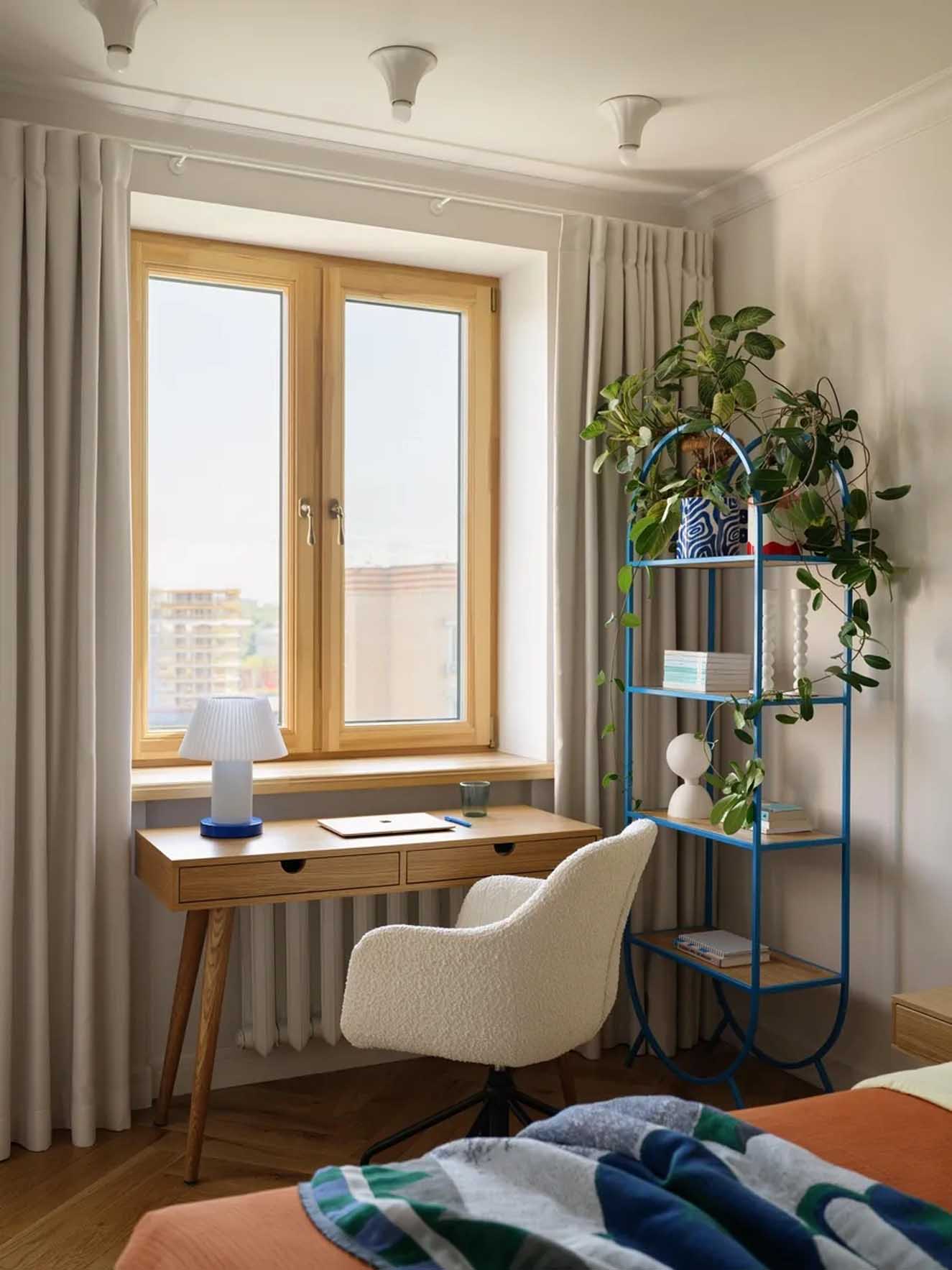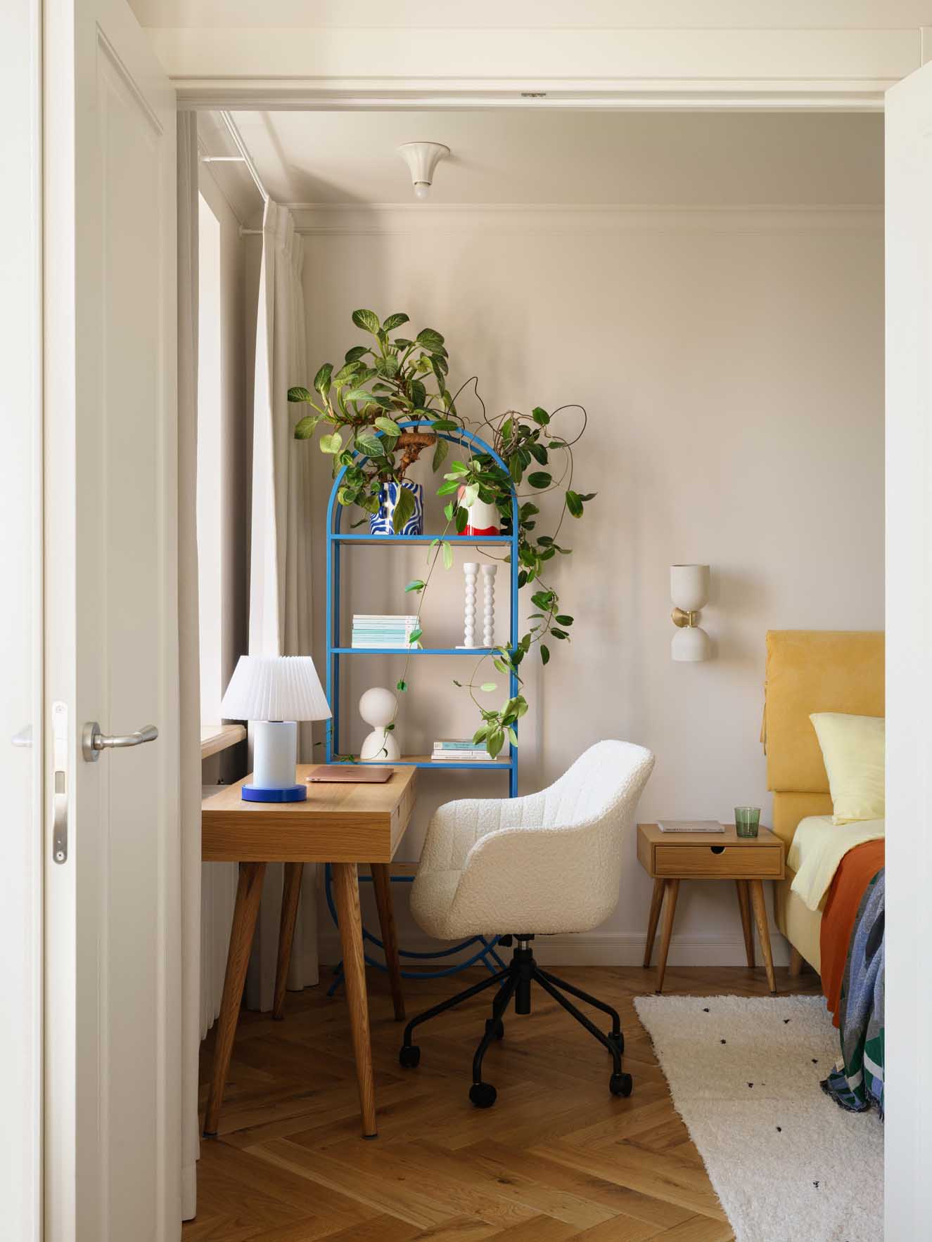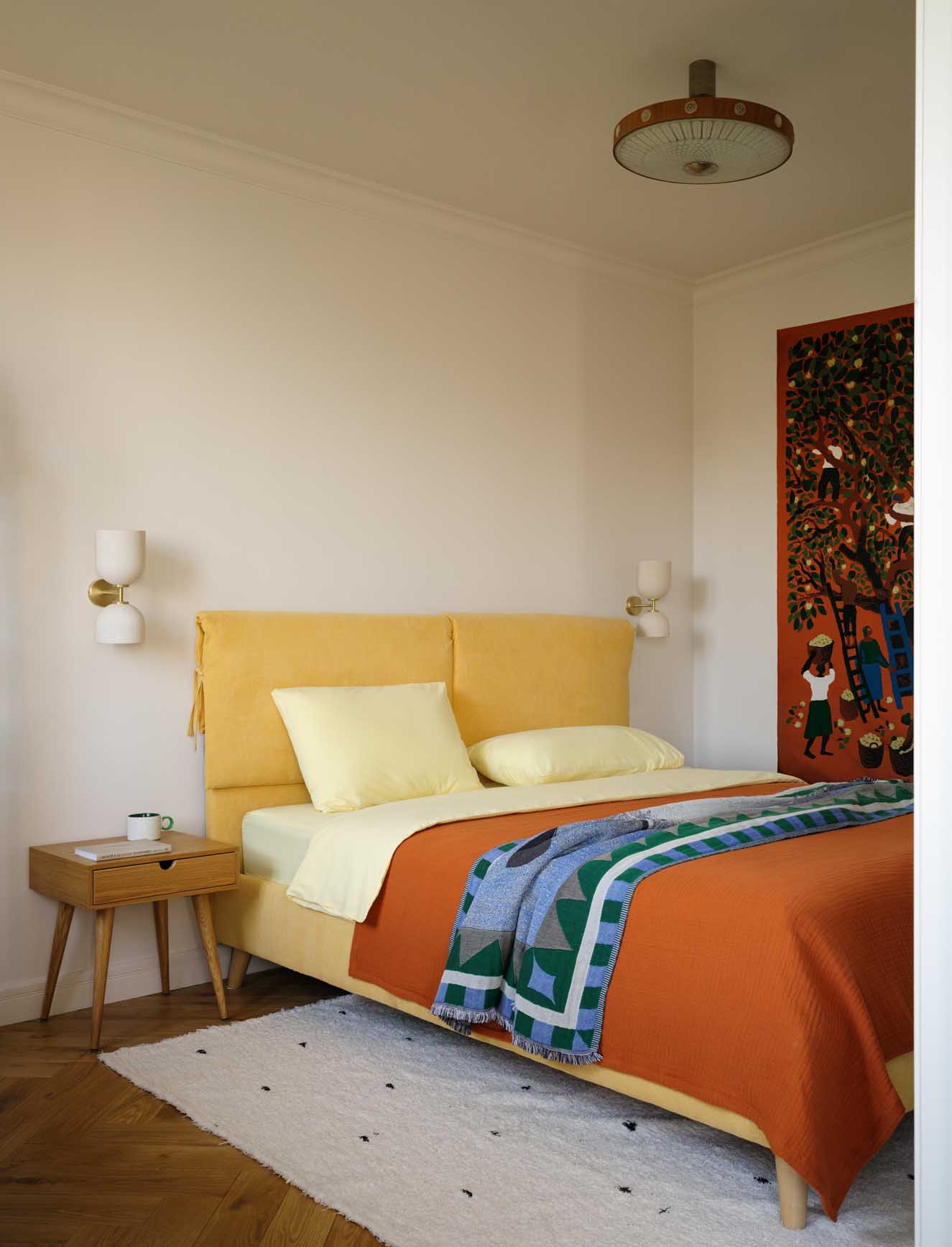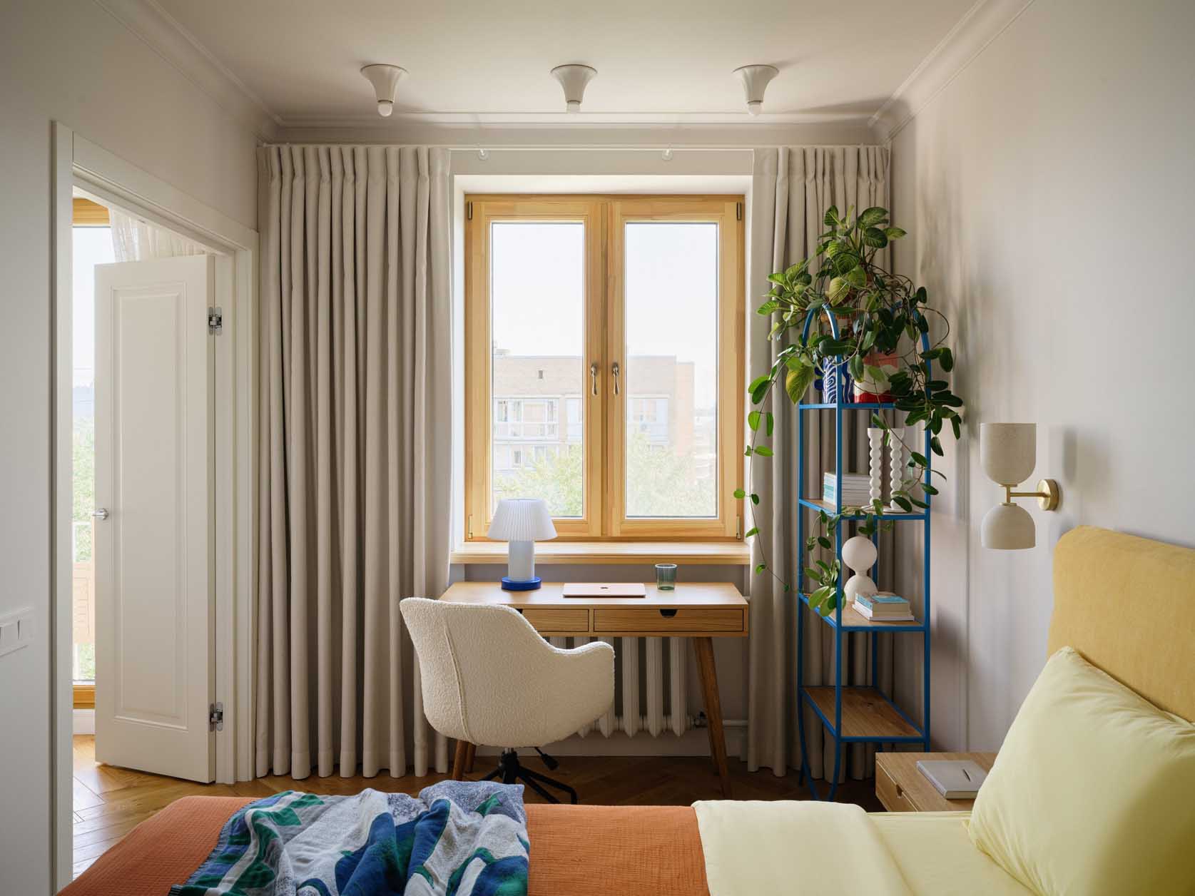 Az ablak előtt dolgozósarokkal kiegészített hálószoba a nyugalom és a fény oázisa. A színpaletta a sárga és a narancs árnyalataira épül, ami még a fényszegényebb napokon is napsütéses hangulatot áraszt. Mivel minden ruhát és személyes tárgyat a nappaliból nyíló gardróbban helyeztek el, a hálóban nem volt szükség komódokra vagy szekrényekre. Ez a minimalista berendezés segíti a zavartalan pihenést és tovább hangsúlyozza a tér tágasságát.
