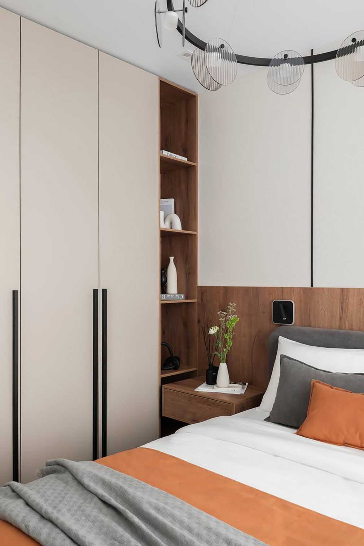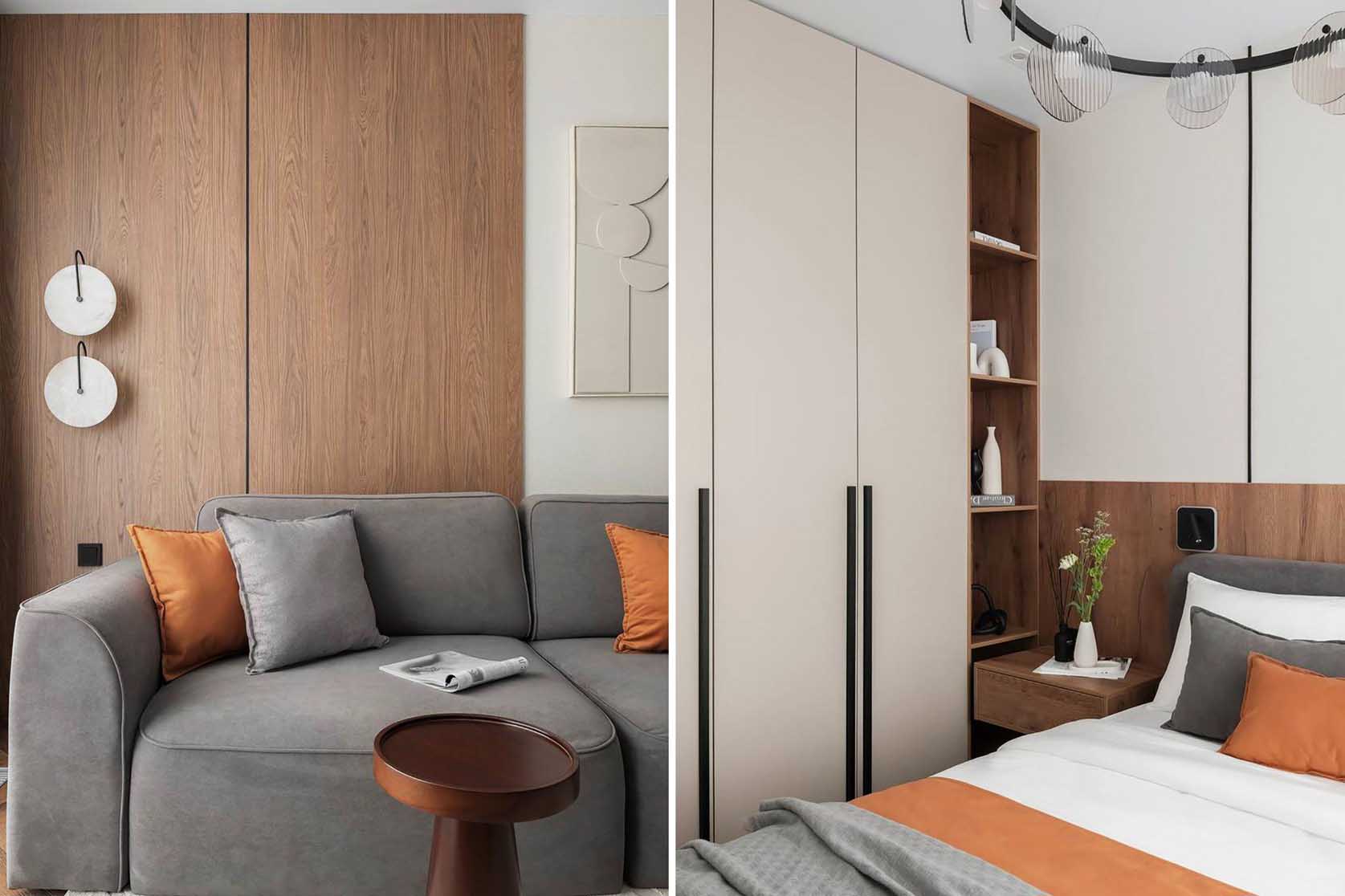A hálóban ugyanazokat az anyagokat alkalmazták, mint a közösségi térben, biztosítva az enteriőr egységes stílusát. Az ágy fejtámlája mögötti falat sötét, fa hatású panelekkel dekorálták.