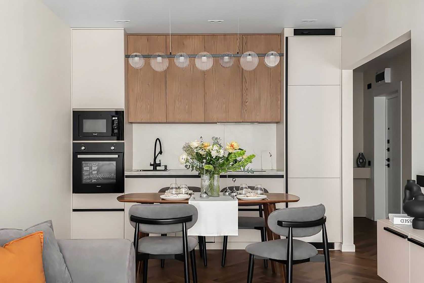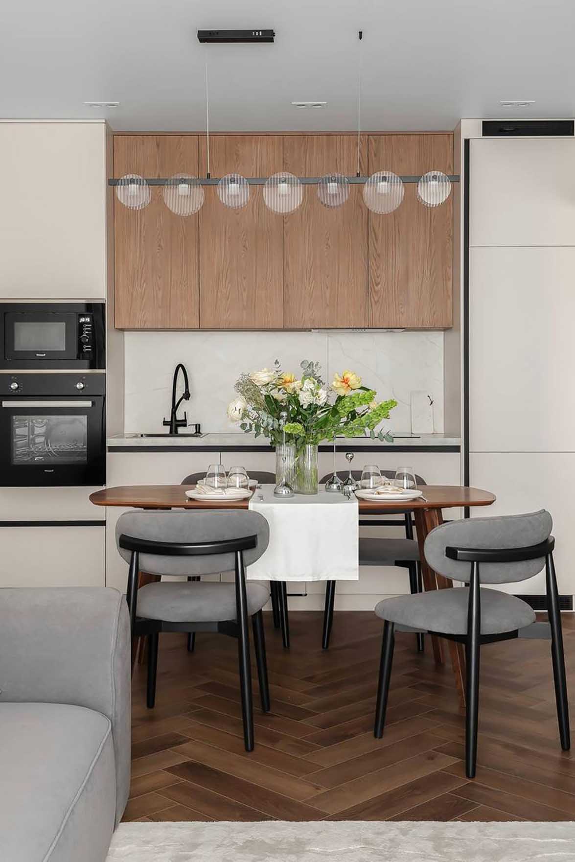 A konyhával szemben egy lekerekített sarkú, széles étkezőasztal található. A székek íves háttámlája rímel az asztallap formájára, a felette elhelyezett lámpa pedig vizuálisan is kijelöli az étkezőzónát. A berendezési tárgyak kiválasztásánál az esztétikum és a tartósság egyensúlya volt az elsődleges szempont.