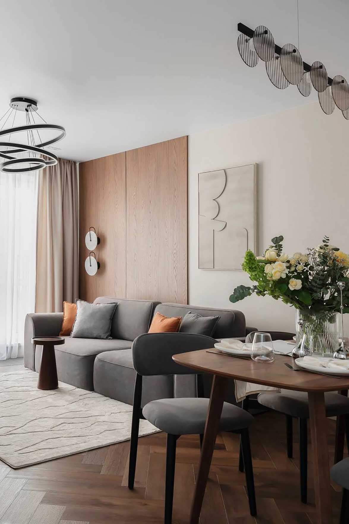 Ebben a lakásban érdemes megfigyelned, hogyan válik egy egyszerű geometriai elem a téralakítás eszközévé. A függőleges vonalak használata nem csupán dekoráció, hanem tudatos optikai trükk, amit te is bátran alkalmazhatsz: