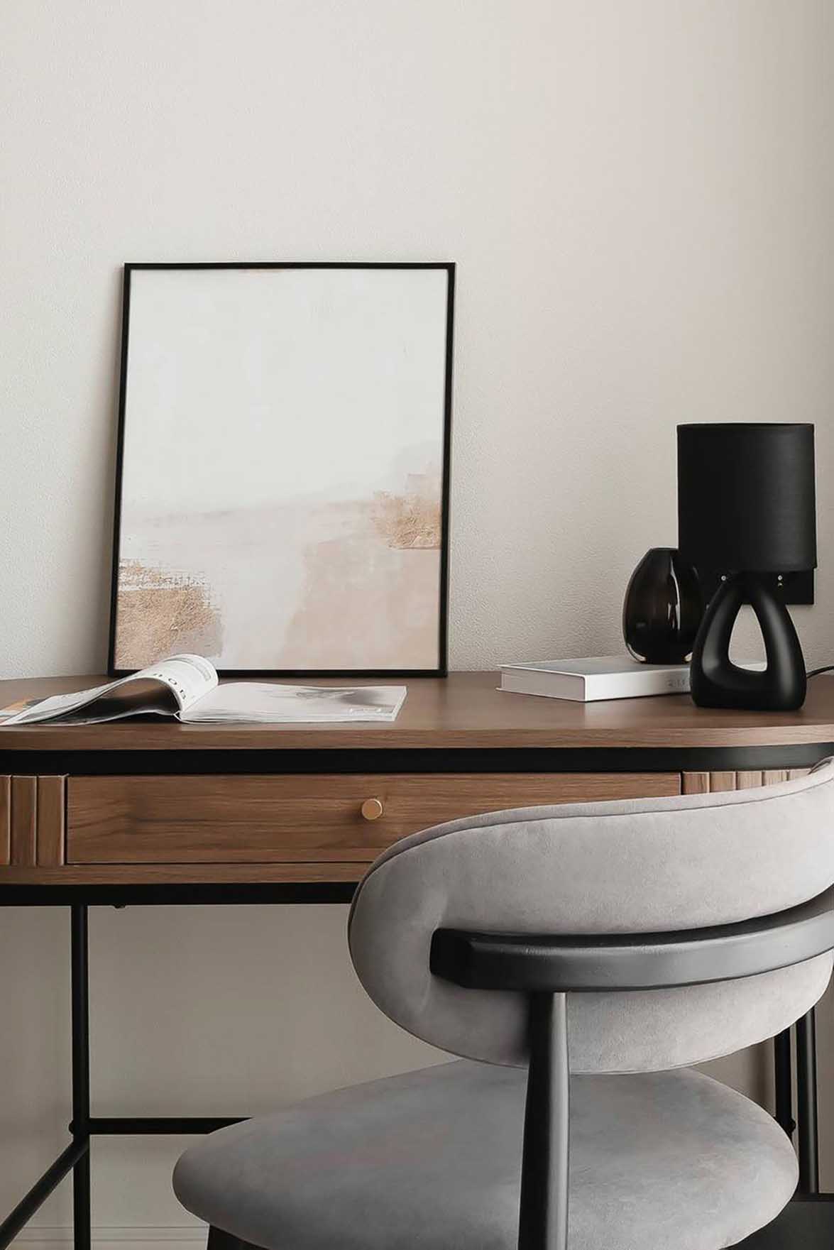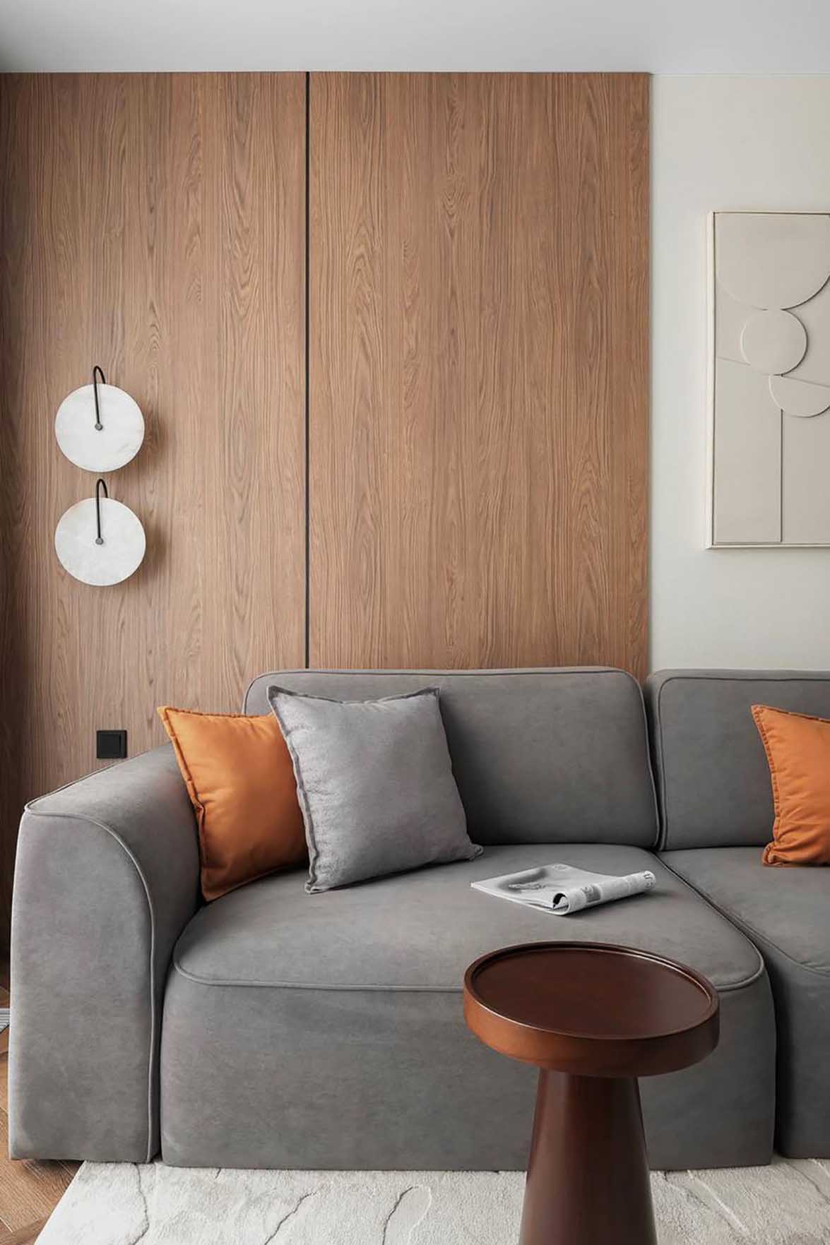 - Finoman férfias stílus, szürke színek és sötét faanyagok használatával.