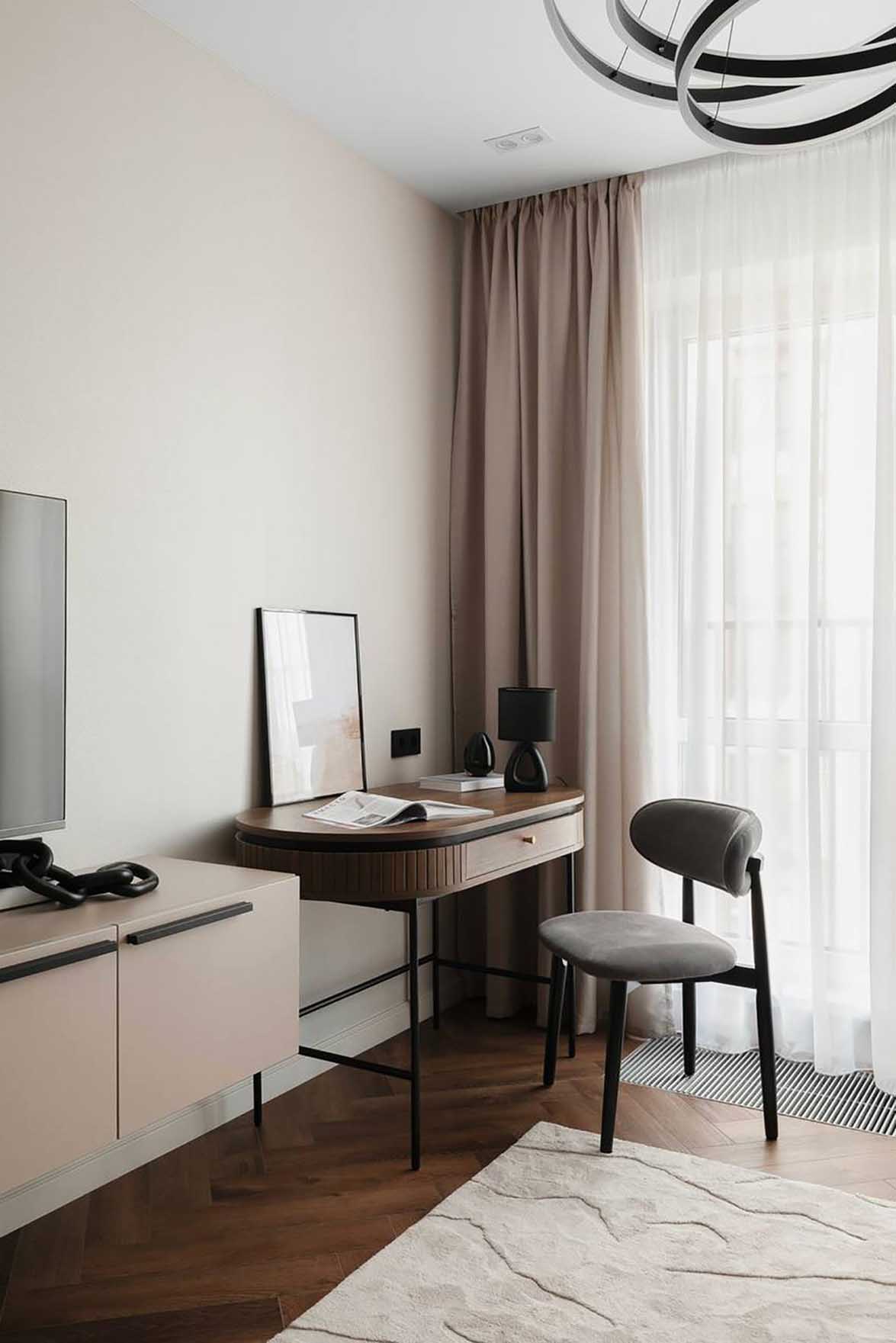 A világos bézs háttér előtt a szürke árnyalatok a bútorokon és a burkolatokon határozott, férfias karaktert kölcsönöznek ennek az enteriőrnek, míg a sötét tónusú fa elemek melegséget és otthonosságot visznek az összképbe.