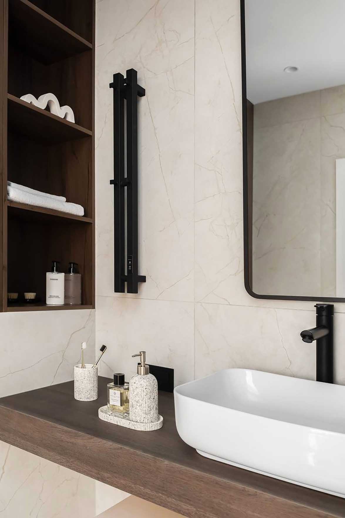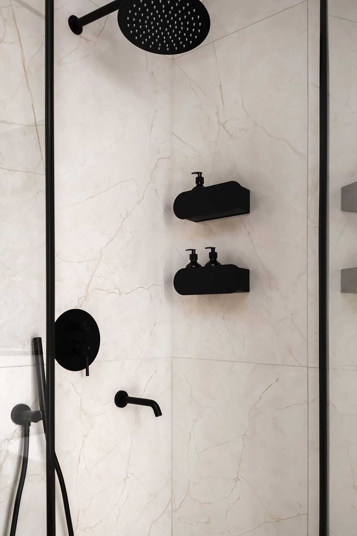 A fürdőben semleges színű, matt greslapokat használtak. A komfortérzetet padlófűtéssel, a biztonságot pedig szivárgásgátló rendszerrel fokozták. A sarokban egy ötszögletű zuhanykabin kapott helyet. A mosóegység feletti szekrények és a gépészeti strang rejtett tárolói szintén egyedi asztalosmunkák.