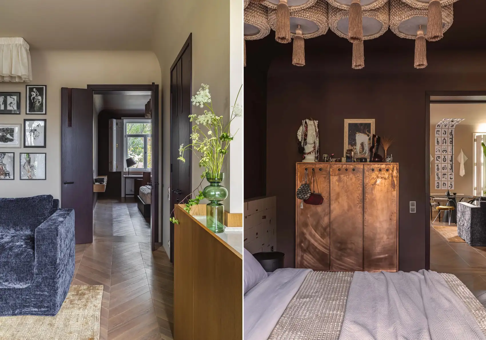 „Az étkezőszékeket egy külföldi utazás során vásároltam. Dán vintage darabok, amelyeket felújítottak és áthúztak. Szintén a kedvenceim közé tartozik az étkezőben található, egy neves dizájner által tervezett fali lámpa, amely lógó textildarabokat formáz. A hálószobában a főszerep az ágyé és a tizenkét búrából álló lámpatesté. Ezeket egy ismert lakberendezési áruházban vettem, a fényszórókat magam készítettem, és bojtokkal is elláttam őket. A falak és a mennyezet sötét csokoládé árnyalata kiemeli az általuk teremtett lágy fényeket. Amint kifestettük a hálószobát, rájöttem, hogy nagyon szeretnék egy rézzel bevont komódot is a térbe. Elkészítettem a vázlatokat, és elég sokáig kerestem olyan szakembert, aki meg tudja valósítani az elképzelésemet. Végül sikerült, és most minden reggel gyönyörködöm abban, ahogy a nap megvilágítja a réz frontokat. Azt kértem, hogy a komódot ne lakkozzák le – szerettem volna, ha az idő nyomot hagy rajta, és a felülete folyamatosan változik.”