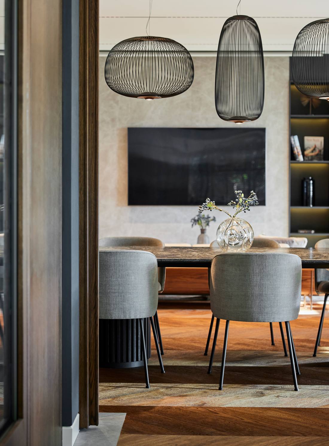 A bejáratot úgy alakították ki, hogy nyugodt átmeneti zónaként szolgáljon, amely a külső térből finoman vezeti át az érkezőket a belső élettérbe. A fa és a márvány anyaghasználat itt meghatározó, és visszatérő elemként jelenik meg az összekötő folyosókon, valamint a konyhát és más nappali funkciókat ellátó helyiségeket összekapcsoló zónákban.