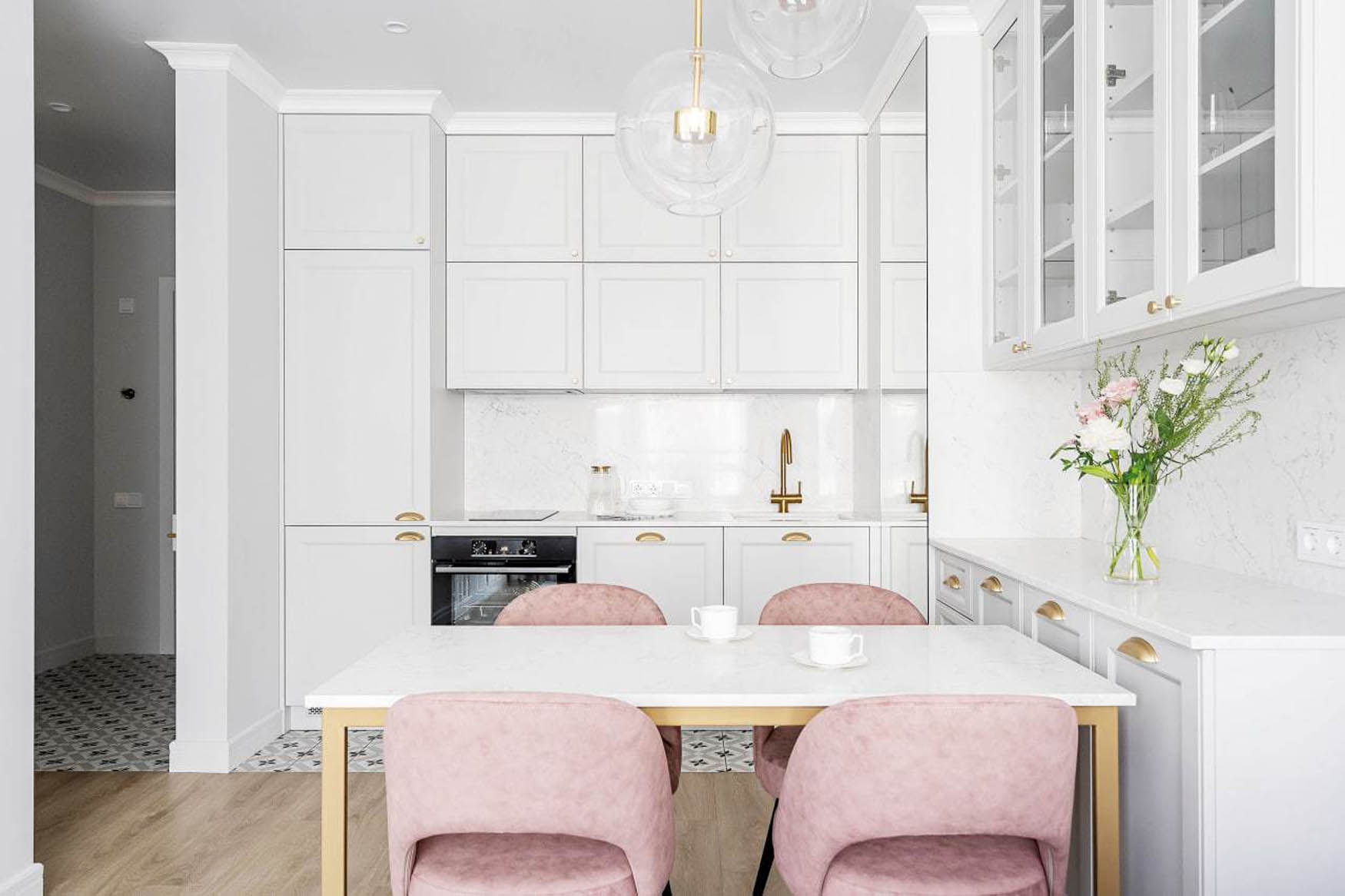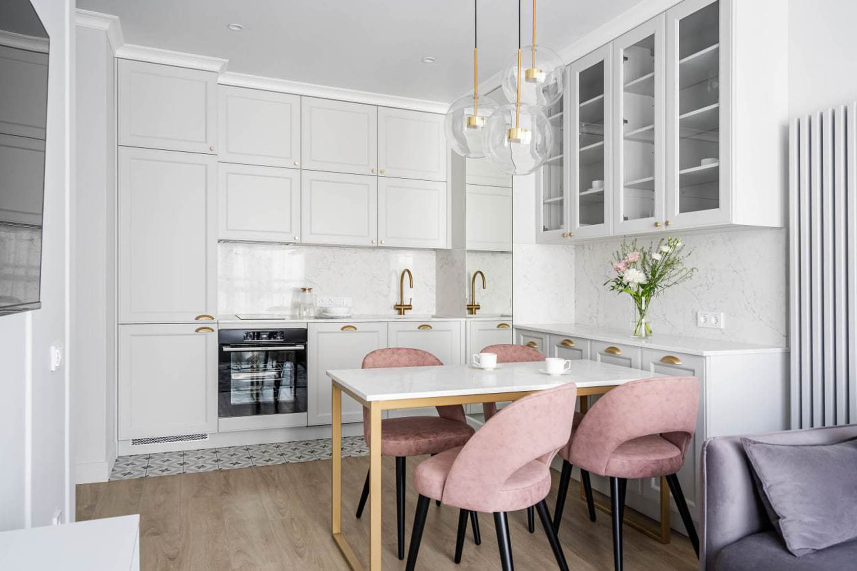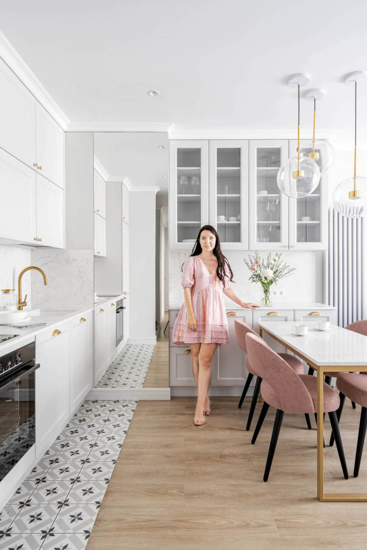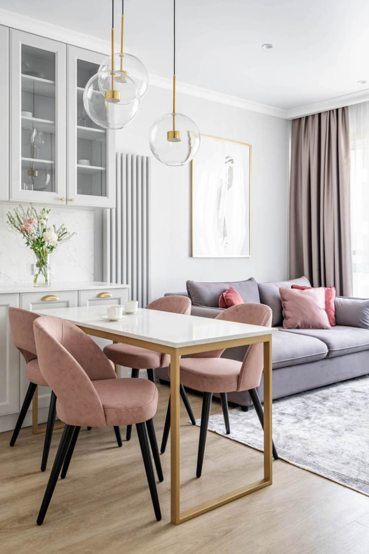 A teljes lakáson végigvonuló pasztell színhasználat és a következetesen alkalmazott anyagok teremtik meg az otthon vizuális egységét. A világosszürke alapszínt finom rózsaszín, bézs és arany árnyalatok egészítik ki a textileken és a kiegészítőkön. Az aranyozott csaptelepek, lámpatestek és bútorlábak eleganciát csempésznek a térbe, míg a fekete elemek – például a székek lábai – modern kontrasztot adnak. Ez a fajta következetesség azért előnyös, mert a szem szabadon vándorolhat a térben, nem akad meg a hirtelen stílusváltásokon, így az összhatás nyugodt és rendezett lesz.