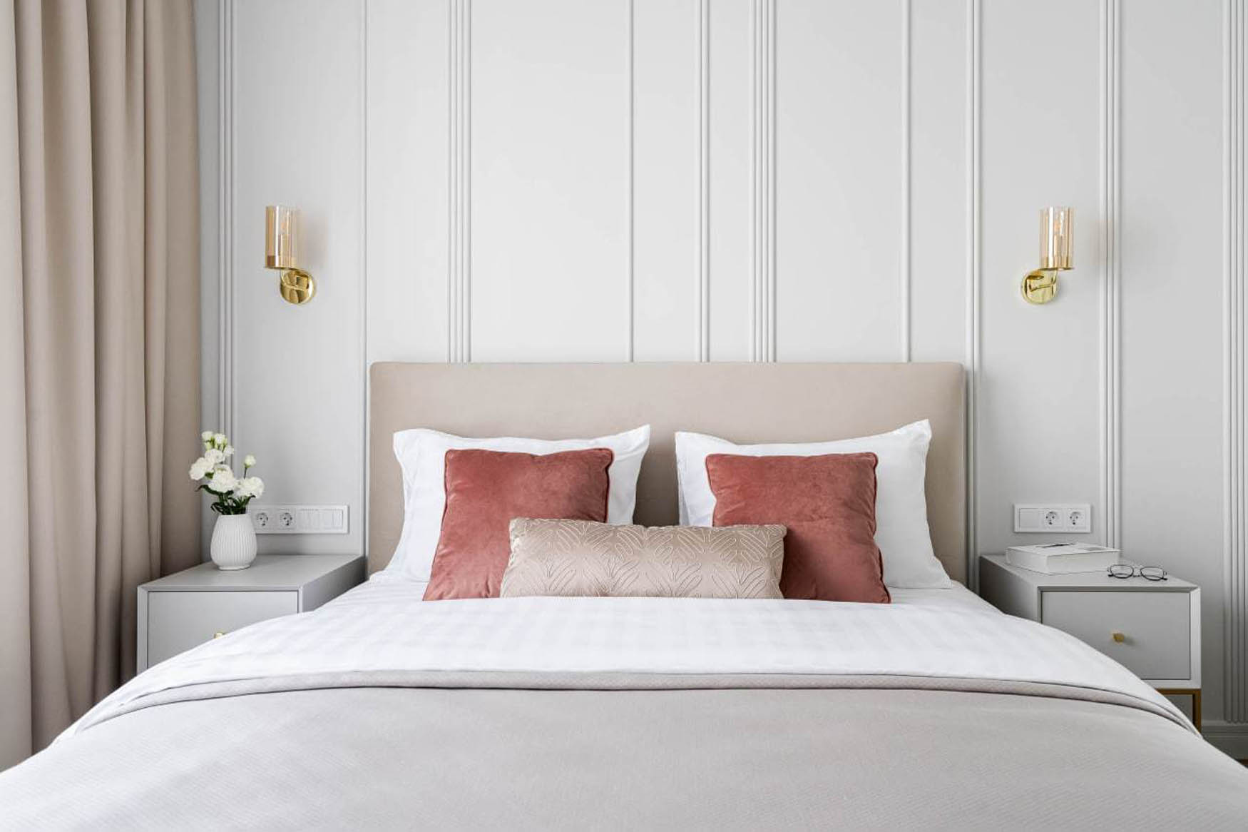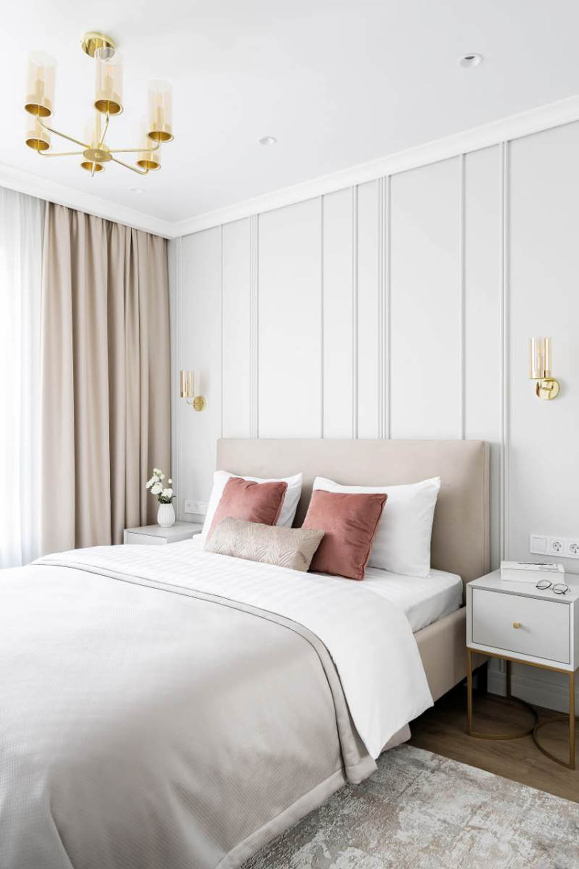 A hálószoba berendezésekor a cél a zsúfoltság elkerülése. Itt a falakon alkalmazott függőleges díszlécezés és a mennyezetig futó panelezés vezeti a tekintetet felfelé, ezzel vizuálisan megemelve a belmagasságot. A semleges, bézs és fehér színek, valamint a nagyméretű ablakon beáramló természetes fény szintén hozzájárulnak a szoba tágasabb megjelenéséhez. A kecses lábakkal tervezett, lebegő hatású éjjeliszekrényeknek köszönhetően a szoba szellősebbnek tűnik.