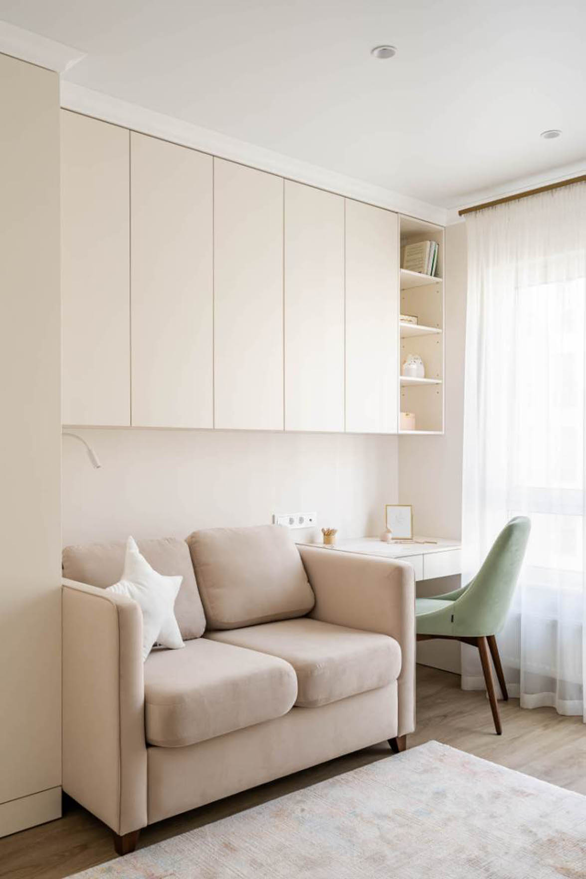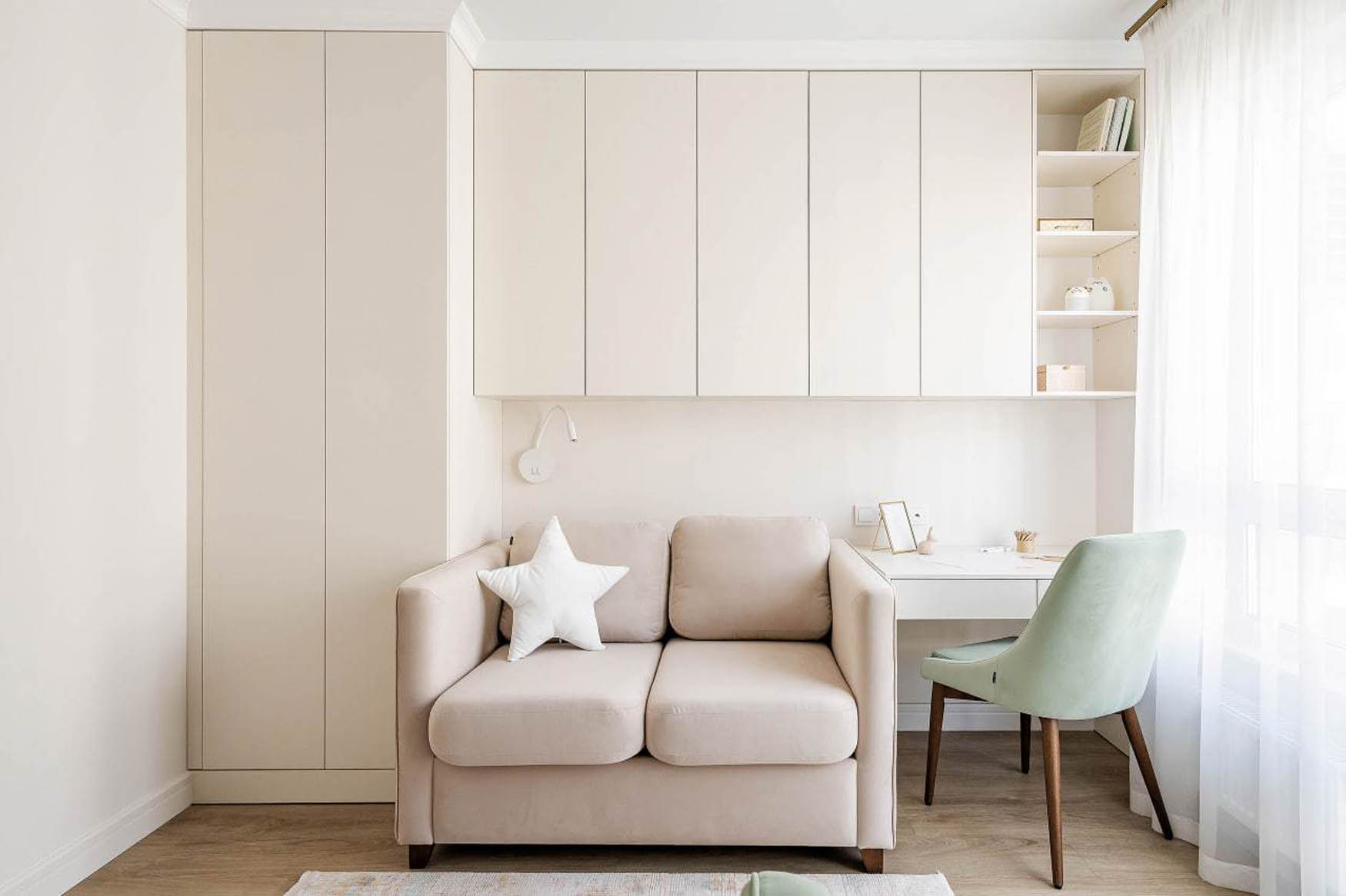 A gyerekszoba egy pasztell-barack árnyalatot kapott, amely meleg és barátságos atmoszférát teremt. A helytakarékosság érdekében a bútorok több funkciót is ellátnak: a kanapé ágyként is szolgál, míg a falra szerelt, mennyezetig érő szekrénysor bőséges tárolóhelyet biztosít a könyveknek és játékoknak anélkül, hogy értékes alapterületet foglalna el. Az íróasztal és a kényelmes olvasófotel egy kompakt, mégis teljes értékű teret hoz létre a tanuláshoz és a pihenéshez.